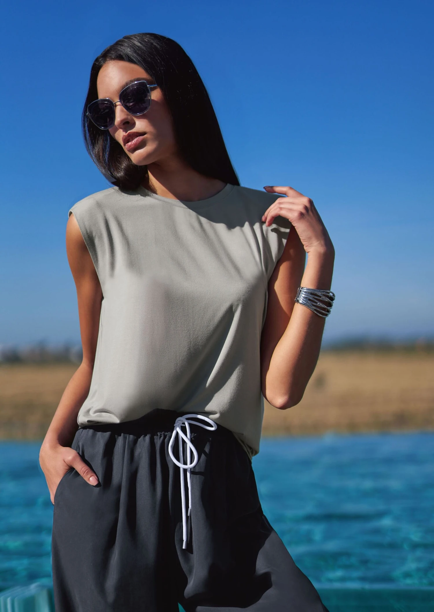 Moderner Basic-Chic mit neuen Proportionen: Die betonte Schulterpartie ist topaktuell und lässt den ultimativen Trend der 80iger Jahre auf stilvolle Weise wieder aufleben. In hochwertiger, fein schimmernder Viskose-Mischung mit nachhaltigen Viskosefasern der Marke LENZING™ ECOVERO™ harmoniert das Shirt mit fast allen Kombi-Ideen und sorgt für ein tolles Tragegefühl. Ärmellos und locker im Schnitt zeigt sich das Shirt mit Rundhals-Ausschnitt und soften, dezent eingearbeiteten Schulterpolstern. Ein Must-have für Frauen, die sich für neue Formen begeistern können. Selbst klassischen Outfits verleiht dieses Shirt einen stylishen Auftritt. LENZING™ ECOVERO™ Fasern werden aus nachhaltigem Holz und Zellstoff gewonnen und stammen aus zertifizierten und kontrollierten Quellen gemäß den strengen Richtlinien der Lenzing Holz- und Zellstoffpolitik. Sie wurden mit dem EU Ecolabel ausgezeichnet, einem Umweltzeichen, das an Produkte und Dienstleistungen vergeben wird, die während ihres gesamten Lebenszyklus hohe Umweltstandards erfüllen.