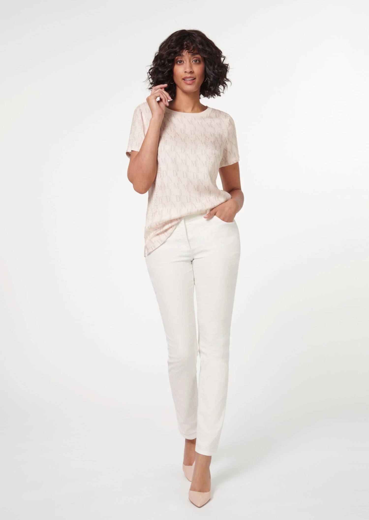 Das zart schimmernde Viskose-Garn des Shirts ist sehr angenehm zu tragen und wirkt durch den soften Logo-Print besonders edel. Feminin tailliert setzt das kurzärmelige Shirt angesagte Casual-Looks wunderschön in Szene. Komfortabel geschnitten und mit feinem Strickband am Rundhals-Ausschnitt ist die knitterarme Qualität besonders kofferfreundlich und ideal auf Reisen.