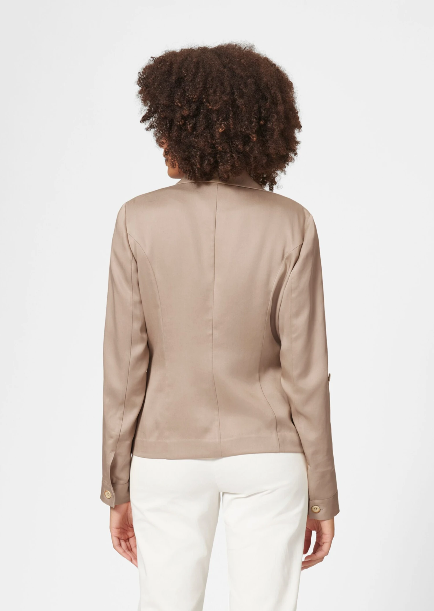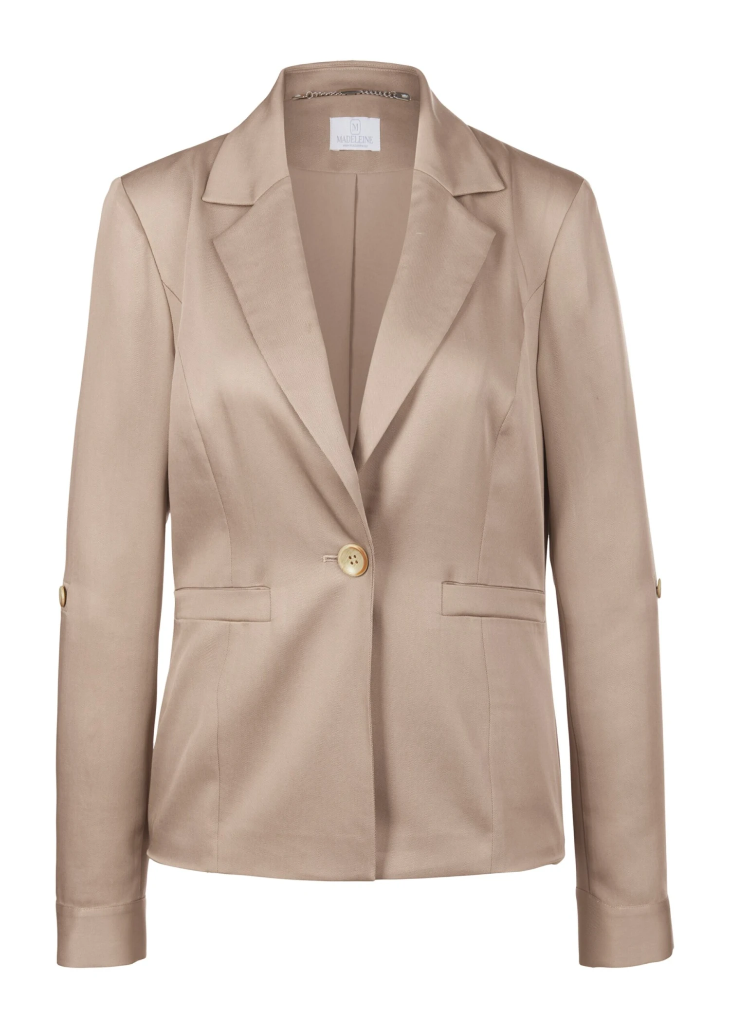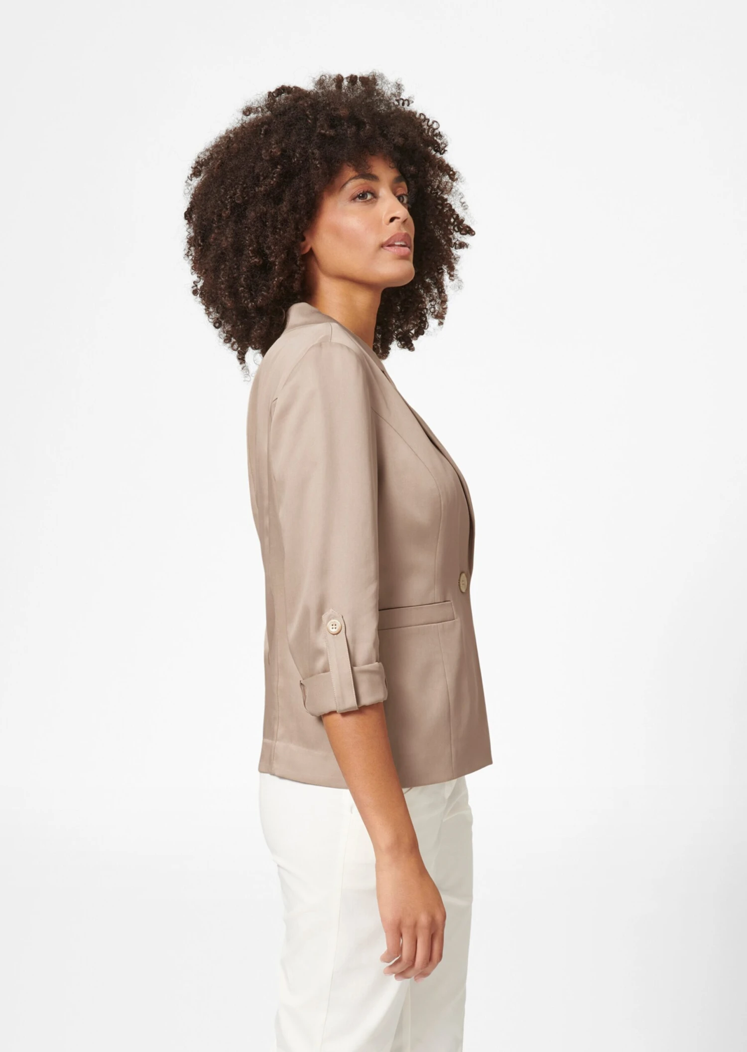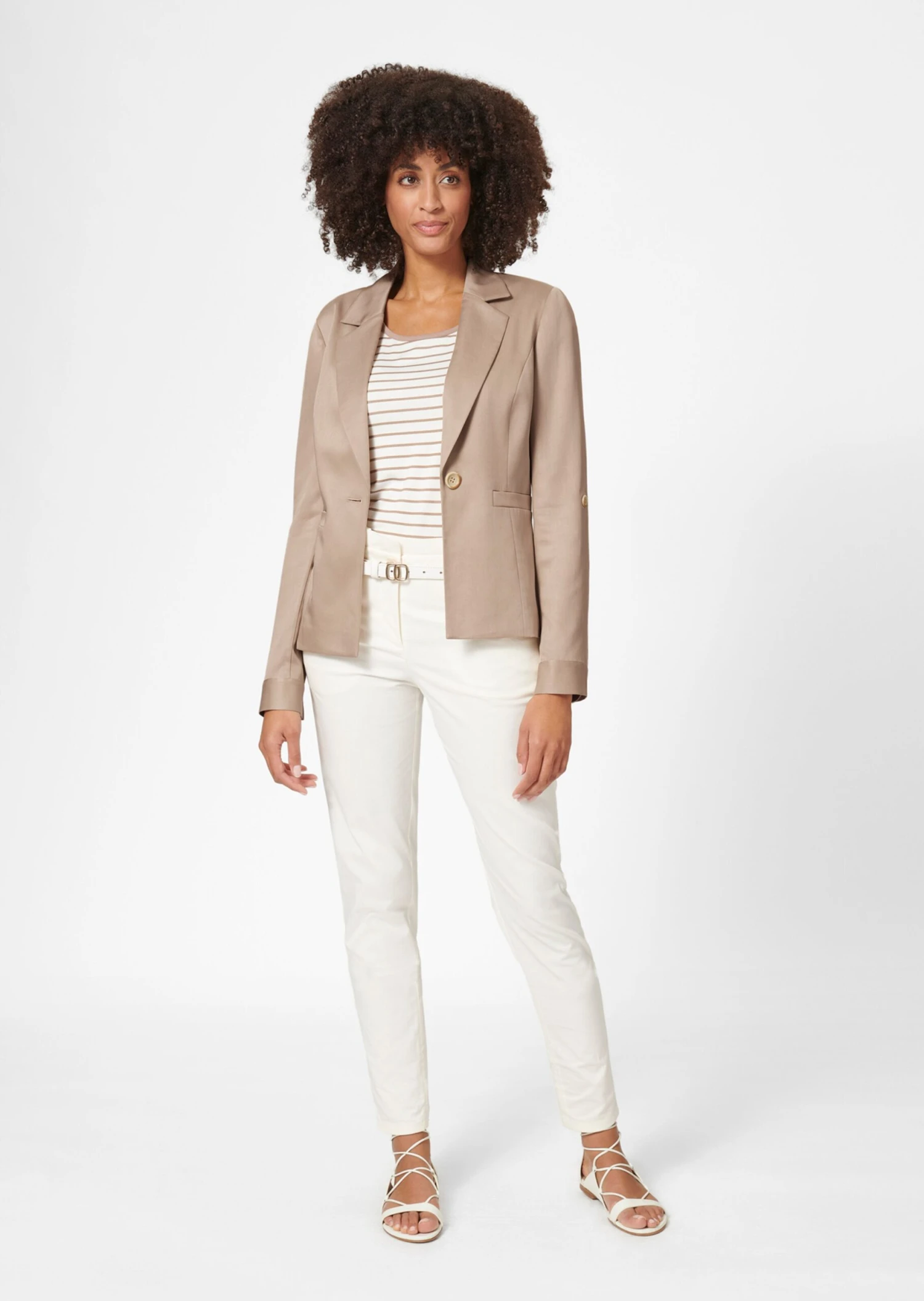 Ein Klassiker in neuer, moderner Optik: Der Einknopf-Blazer mit Knopfmanschetten und Paspeltaschen kann unterschiedlich getragen werden. Die Ärmel können Sie per Knopf-Riegel auf 3/4-Länge regulieren. Schulterpolster und ein Kettenaufhänger sind weitere Details. Die leichte Ware trägt sich angenehm und wirkt sehr edel.