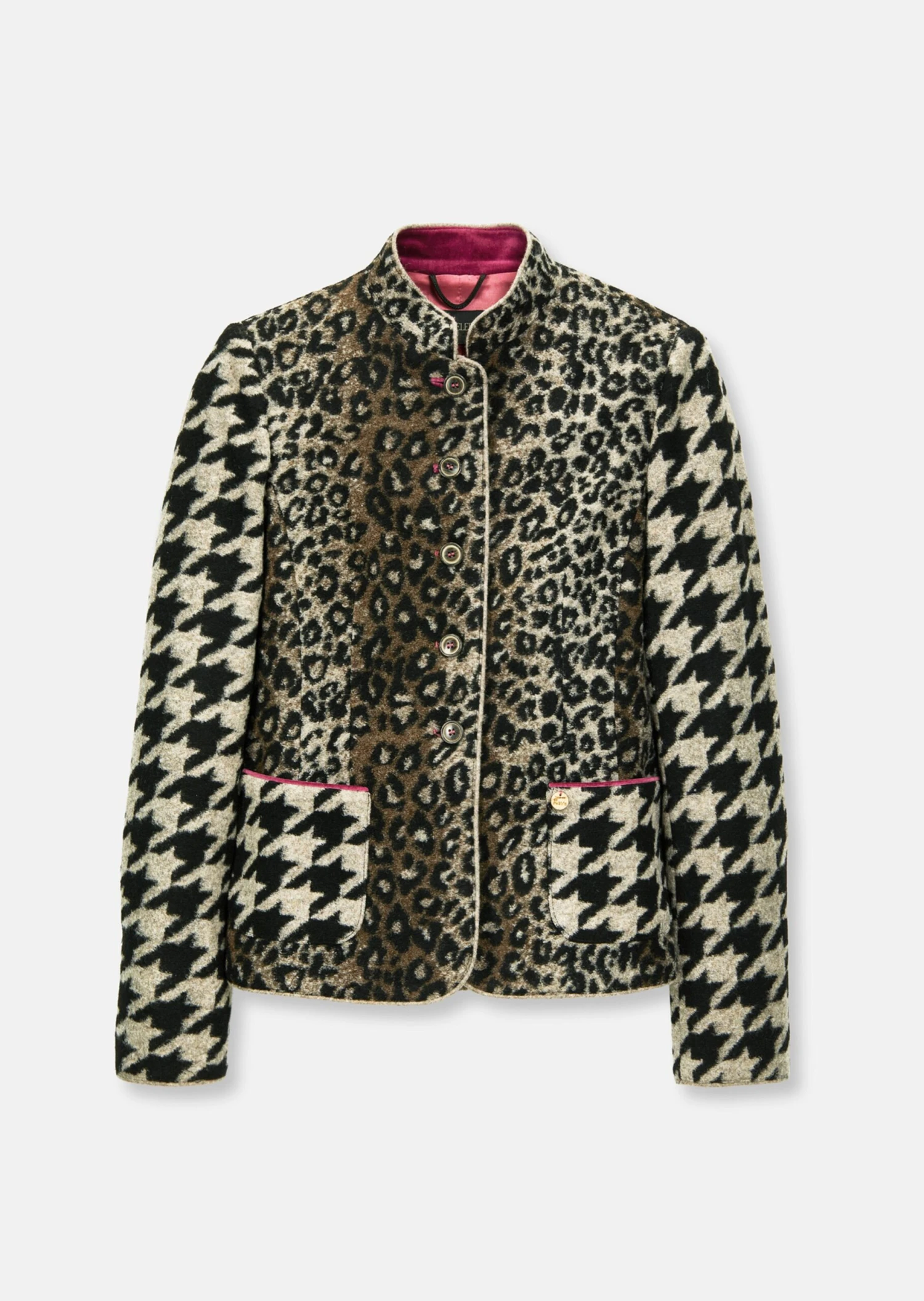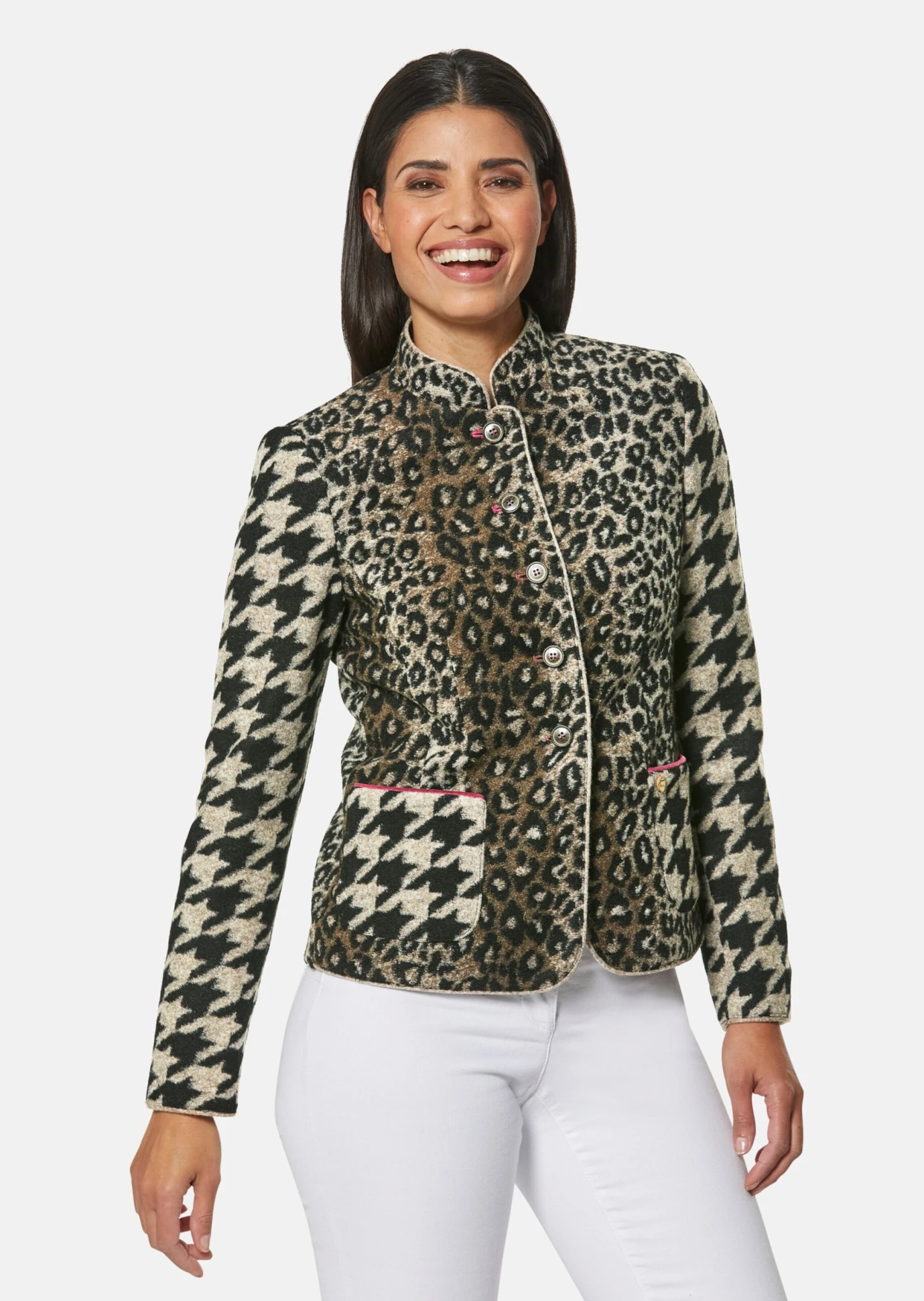 Blazer ja, zu formell nein! Im auffallend schönen Mustermix aus Hahnentritt und Animal präsentiert sich der Klassiker ganz neu. Ein Auftritt mit couturiger Note – in weicher Wollqualität und durchgeknöpfter Form mit aufgesetzten Taschen, Stehkragen und langem Ärmel mit Saumschlitz. Akzente aus Samt und das Kontrastfutter im Bodybereich runden die Jacke ab.