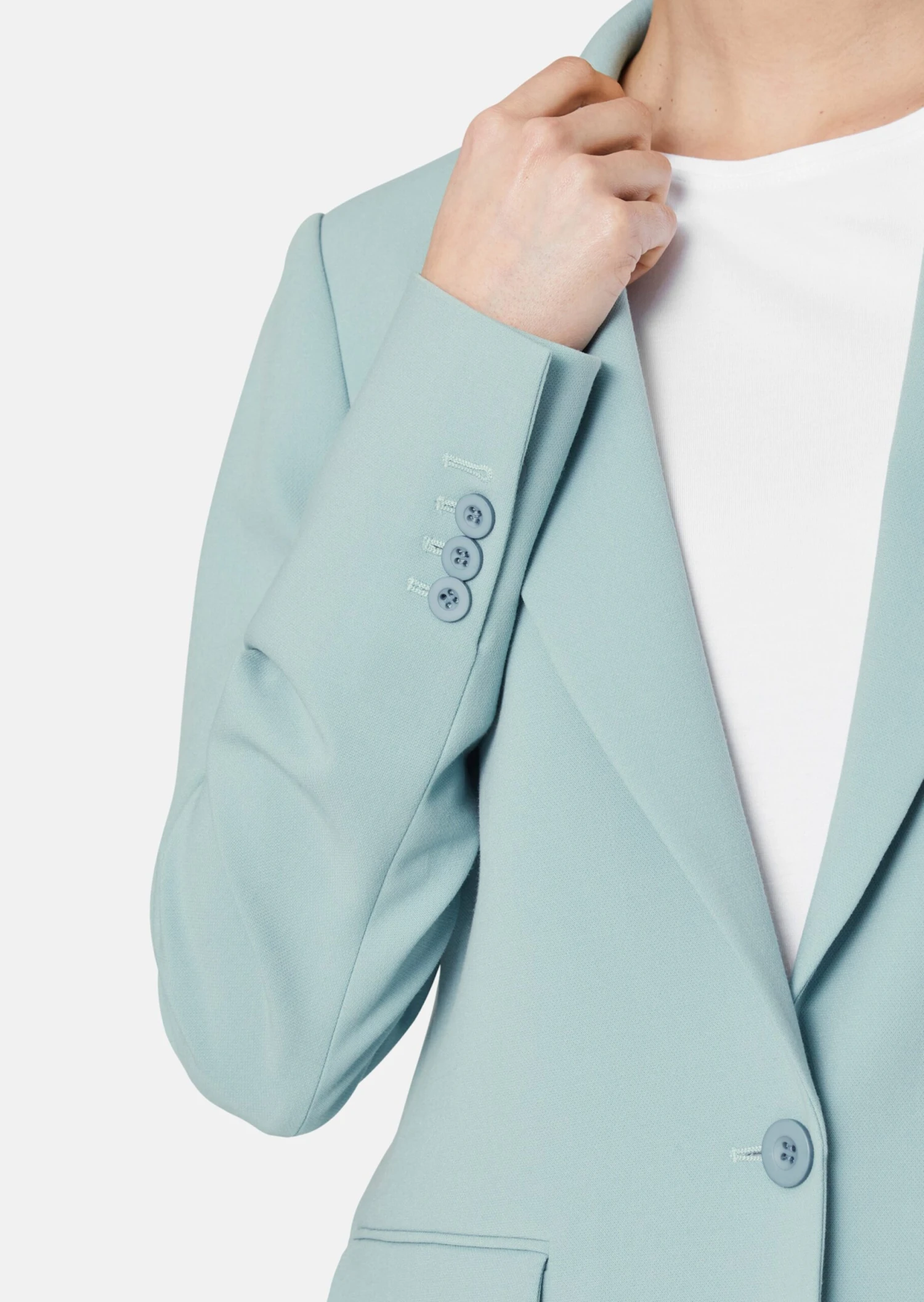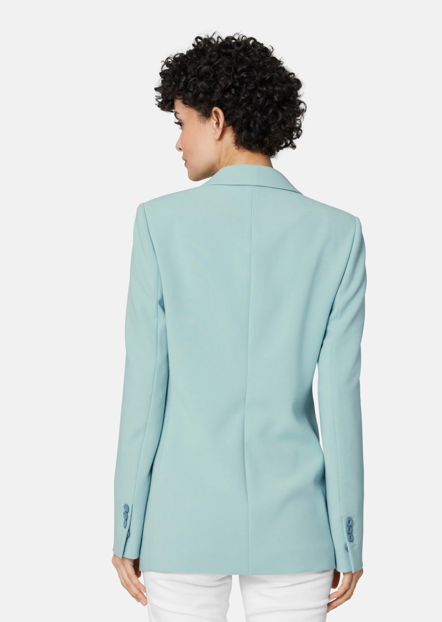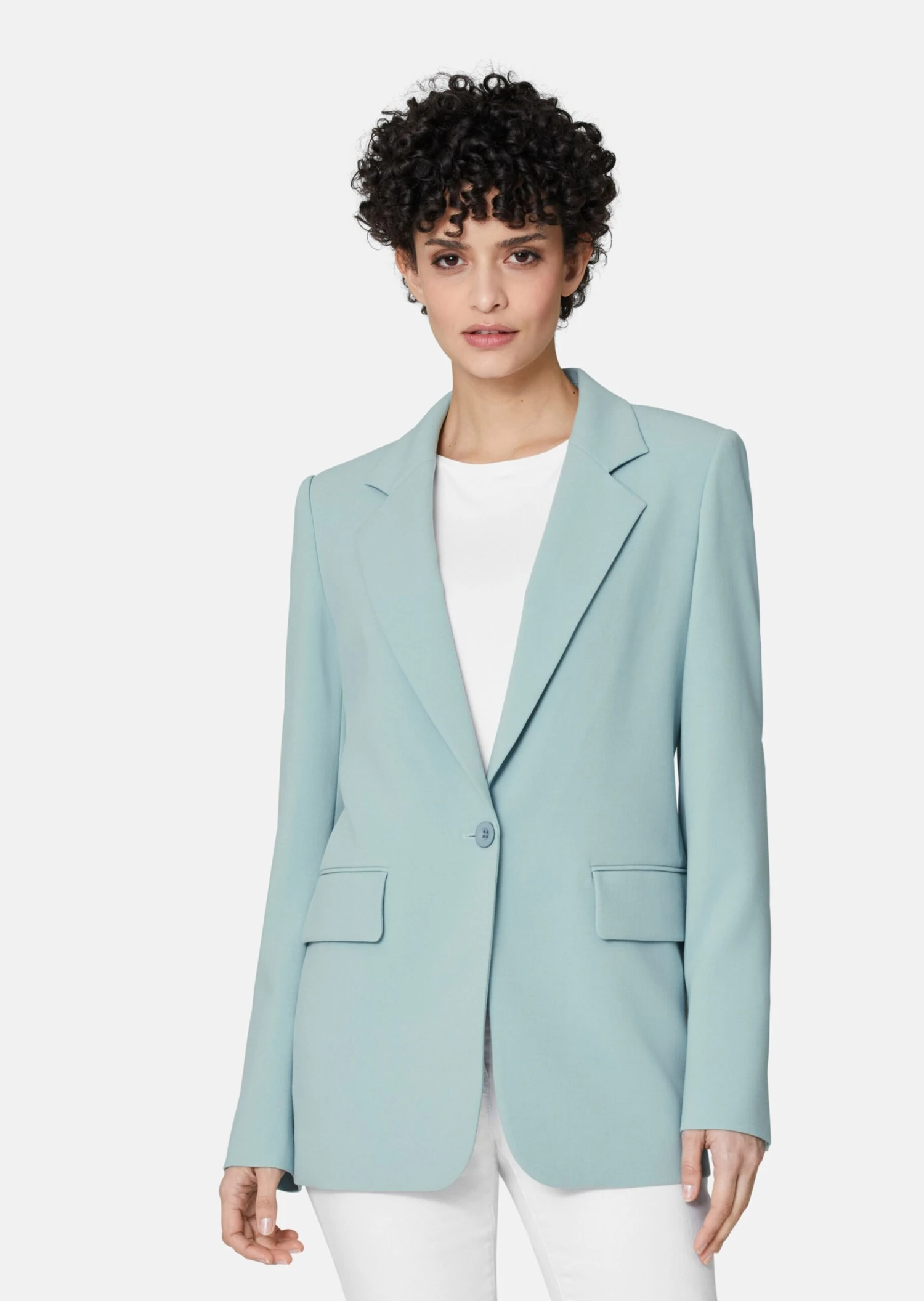 Dieser Blazer gehört zur Grundausstattung jeder Fashionista. Sein Style ist classy, die Farbe cool und kombistark. Für einen lässigen Casual-Auftritt kombinieren Sie ihn einfach mit Jeans und Sneakern. Im Business strahlt er mit der materialgleichen Hose Angebot 00 Kompetenz und Klasse aus. Der sanft taillierte Blazer hat einen Reverskragen, wird auf einen Knopf geschlossen und hat lange Ärmel mit geknöpften Manschetten. Die Schulterpartie ist mit leichten Polstern dezent betont. Gepflegte Innenausstattung mit Kettenaufhänger.