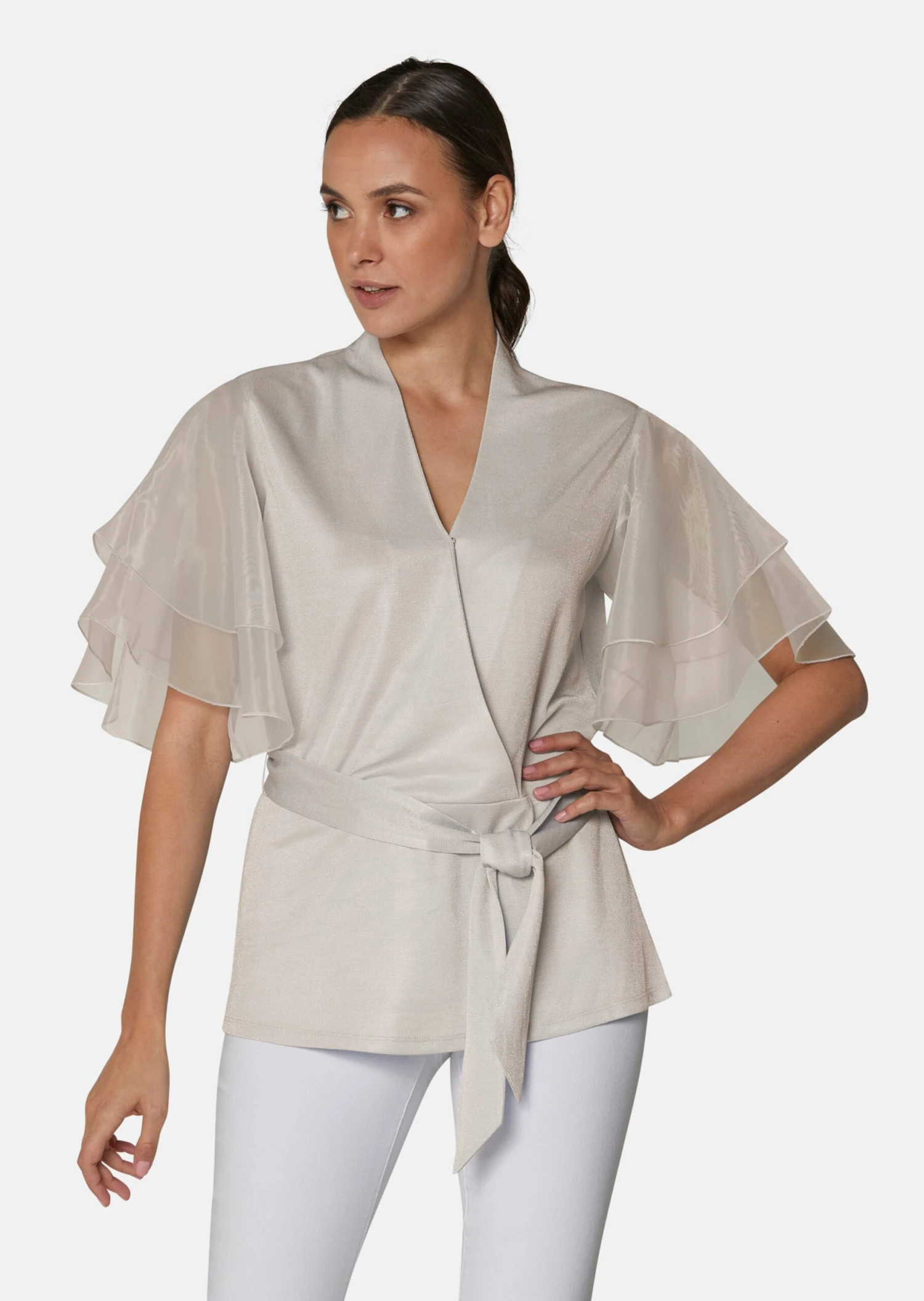 Edles Metallic-Finish und sinnliche Transparenz machen aus dieser Bluse einen Styling-Partner der Extraklasse, der immer für einen glanzvollen Auftritt sorgt. Die zauberhafte Wickel-Optik des Lieblingsstücks wird durch eine elastische Taillennaht feminin auf Figur gebracht. Ein Taillengürtel, der lässig gebunden und von Häkelschlaufen fixiert wird, bringt zusätzlichen Charme in den Look. Der tiefe V-Ausschnitt zeigt viel Dekolleté und geht im Rücken in einen kleinen Stehkragen über. Besonderes Highlight: Opulente Organza-Volants bilden die Ärmel der Edelbluse, die bis zum Ellbogen reichen. Französische Nähte unterstreichen die liebevolle Detailverarbeitung und runden den Style perfekt ab.