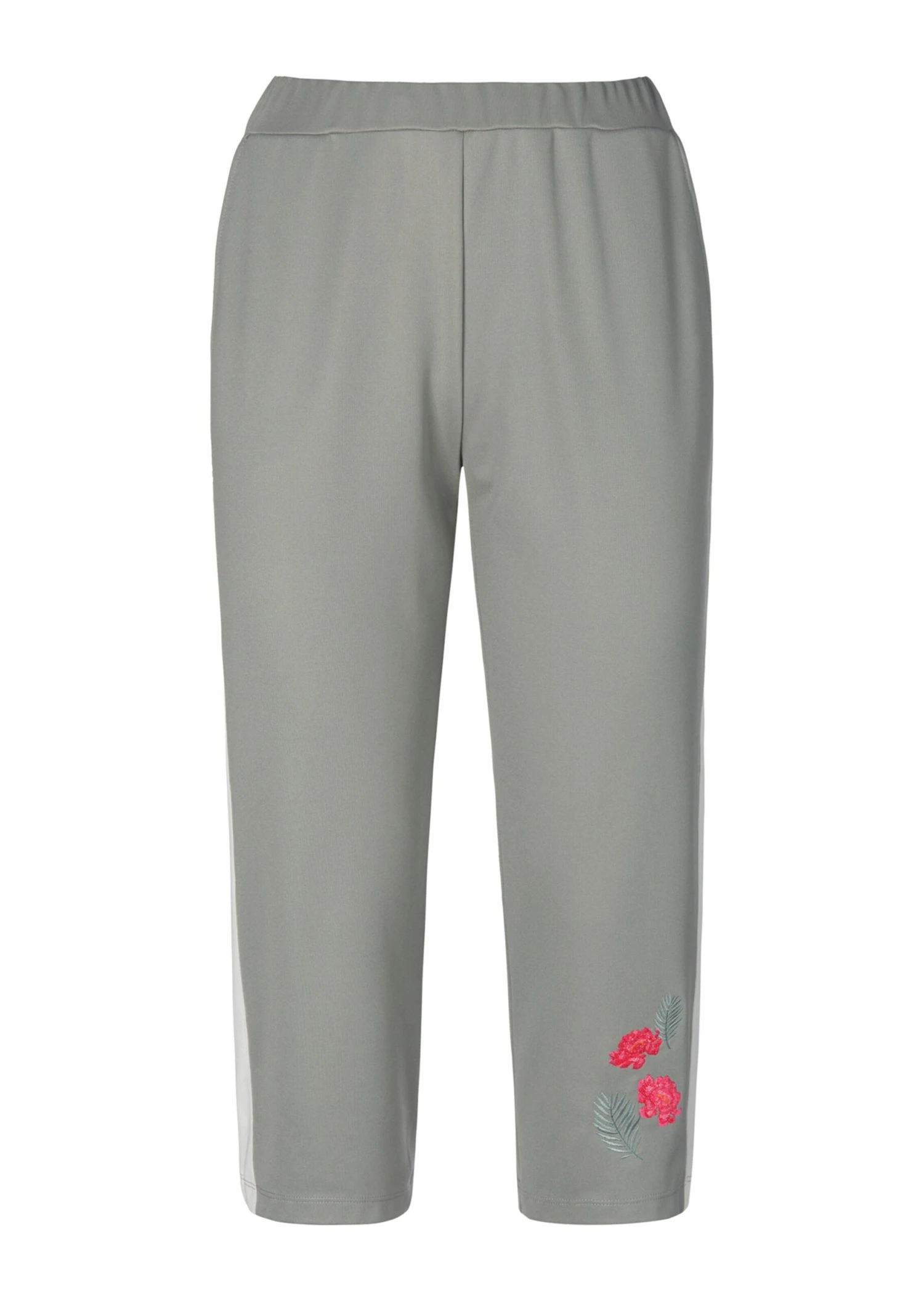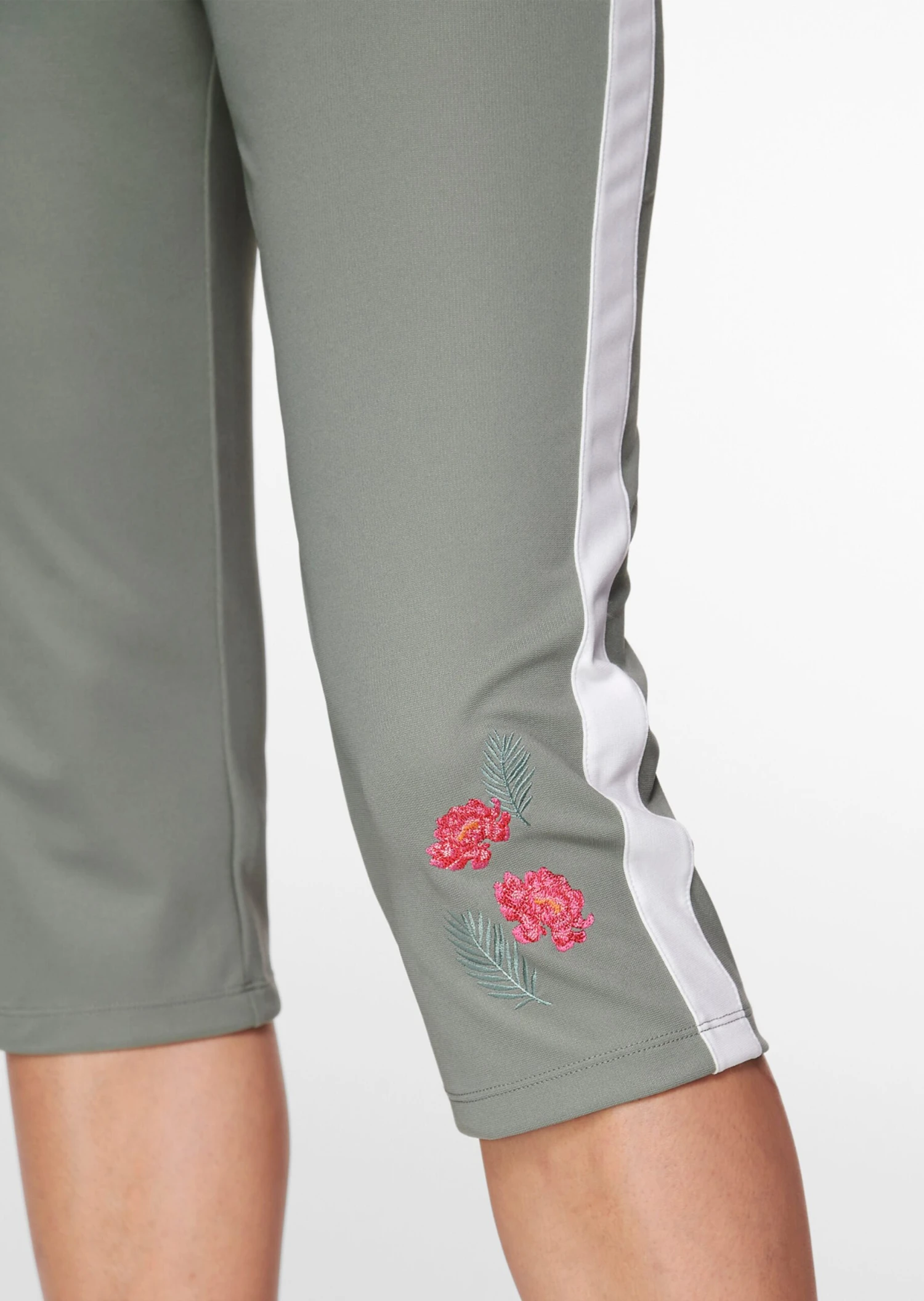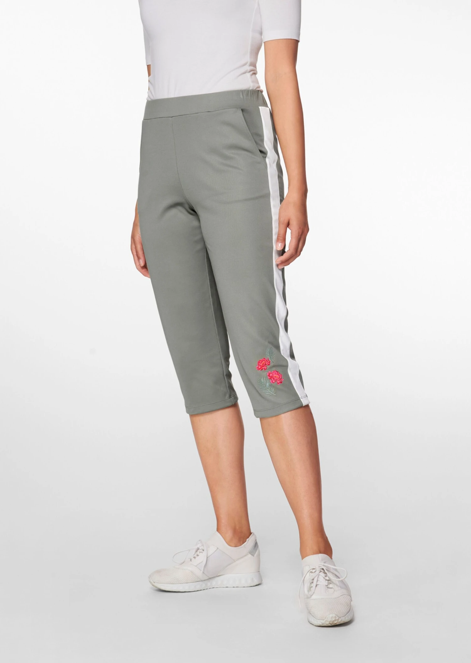 Perfekt für sportive Me-Time-Momente. Die Hose ist in modischer Capri-Länge schön lässig und sehr bequem geschnitten. Sie hat einen elastischen Bund, seitliche Einschubtaschen, seitliche Kontrasteinsätze und eine florale Stickerei am Saum.