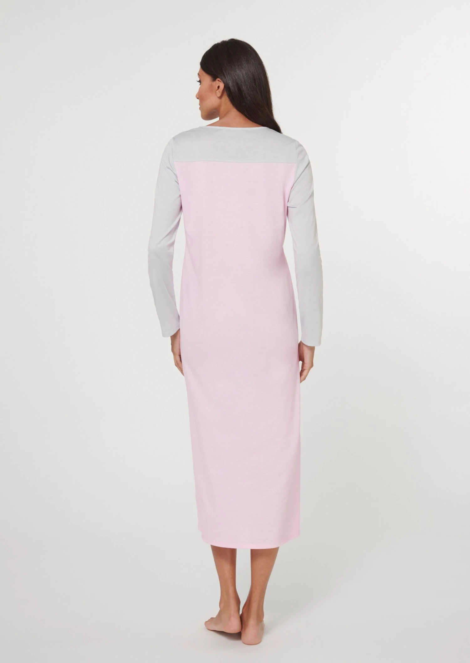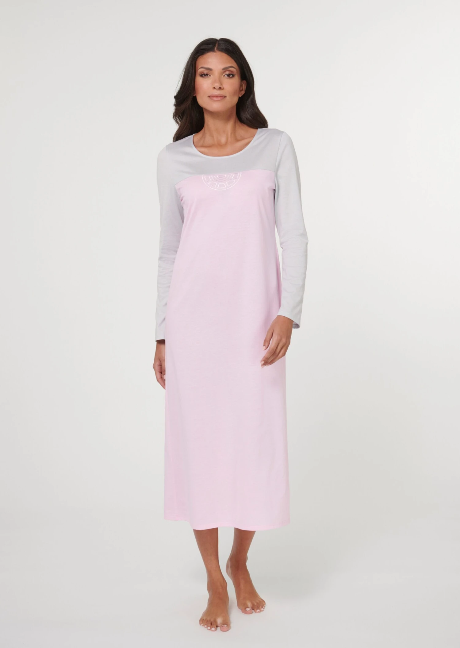 Colour Blocking in Schmeichelfarben! Dieses exquisite Nachtkleid beeindruckt in Design und Farbharmonie. Durch die softe und trageangenehme Interlock-Qualität ist auch wohlfühlen garantiert. Die edle Logo-Stickerei im Vorderteil verleiht das schmückende Extra. Ein eleganter Nachtluxus in legerer Weite – mit Rundhals-Ausschnitt und langen Ärmeln.