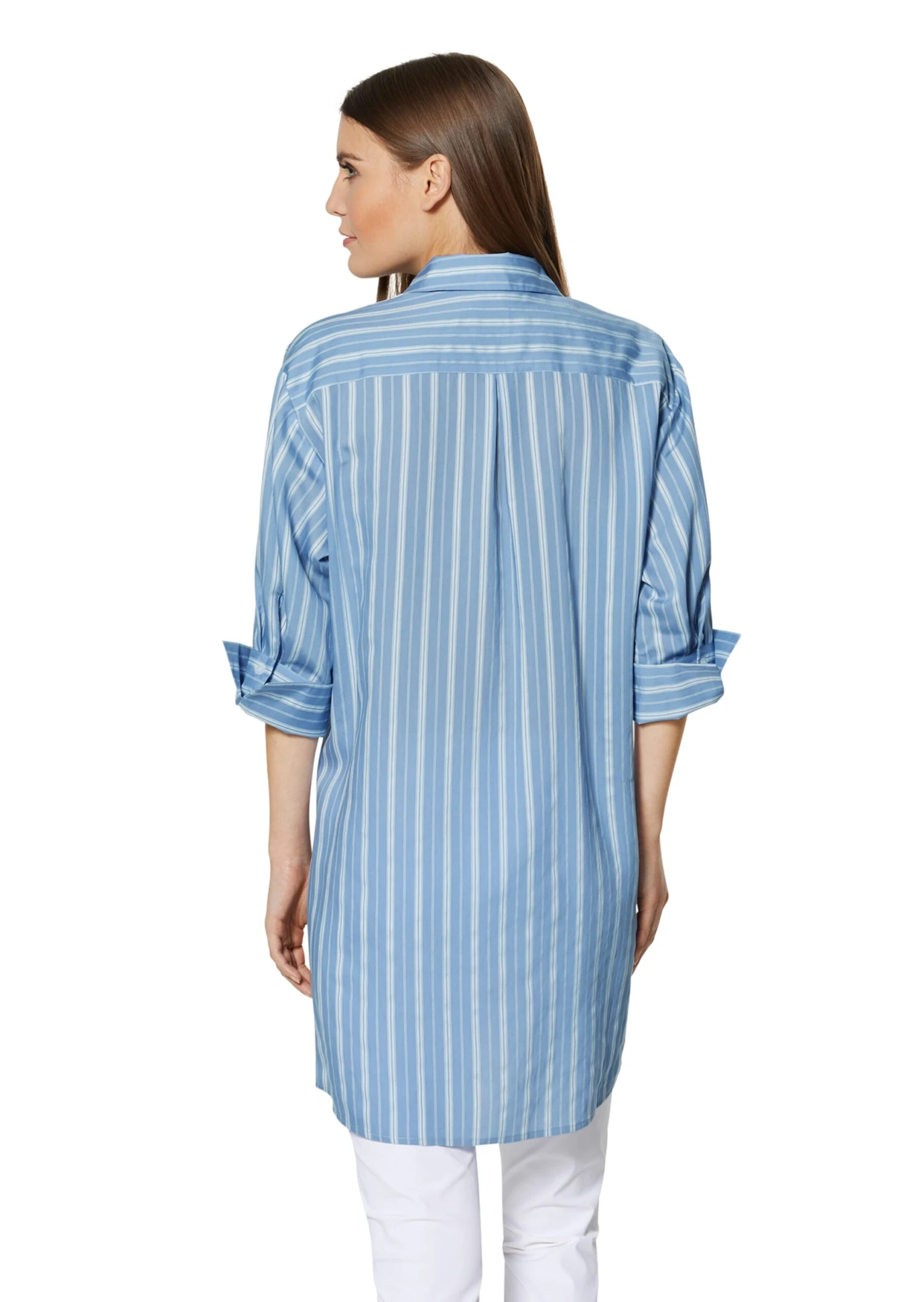 Ein lässig moderner Oversize-Style in zart schimmernder Qualität, der von kontrastfarbenen Webstreifen perfekt in Szene gesetzt wird. Bequem im Trage-Komfort und im Rücken leicht verlängert umspielt das Hemd angenehm die Figur und ist mit Klappkragen, verdeckter Knopfleiste und rückseitiger Passe ausgestattet. 3/4-Ärmel mit breiten Knopfmanschetten bringen Schwung in den Look.
