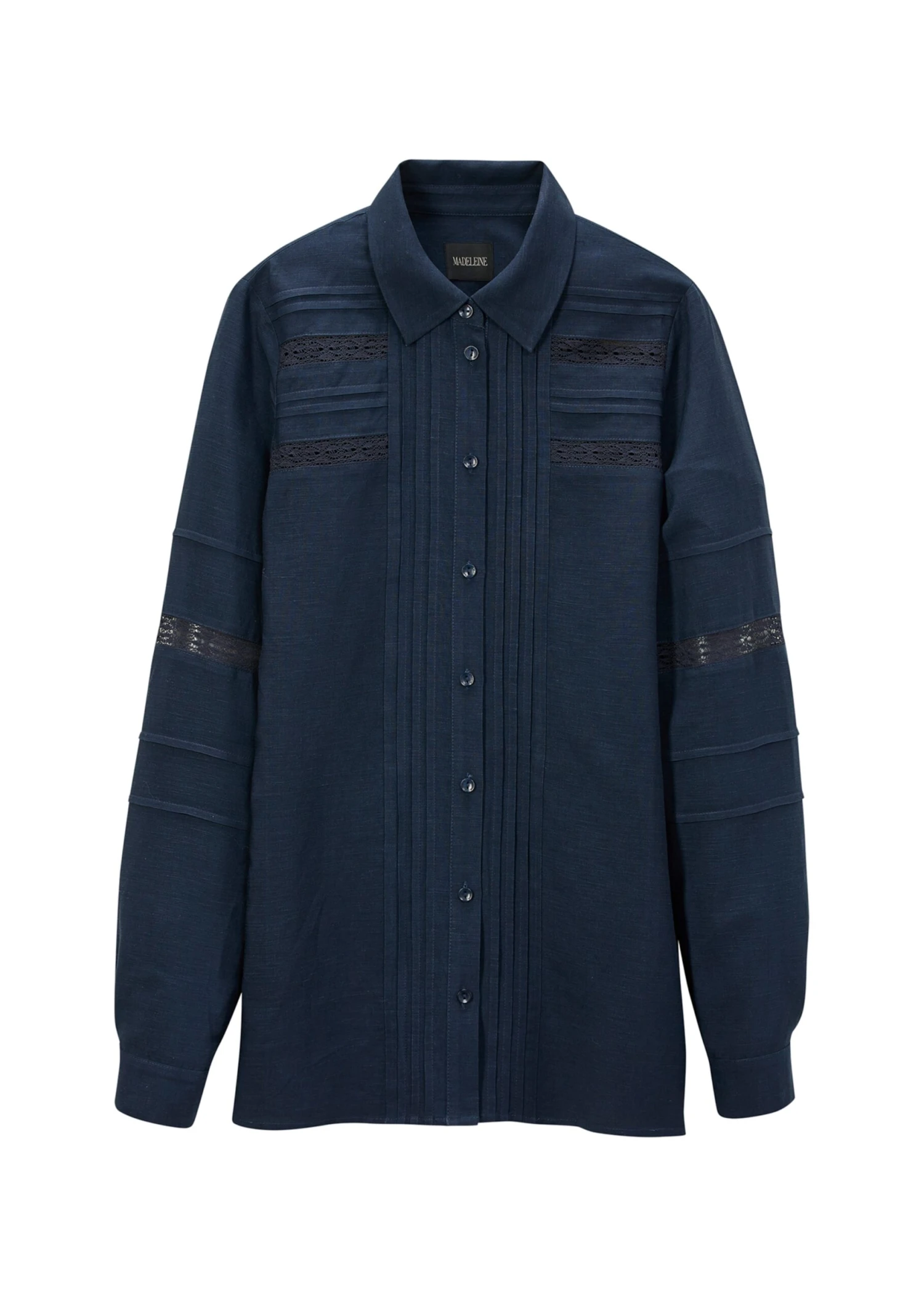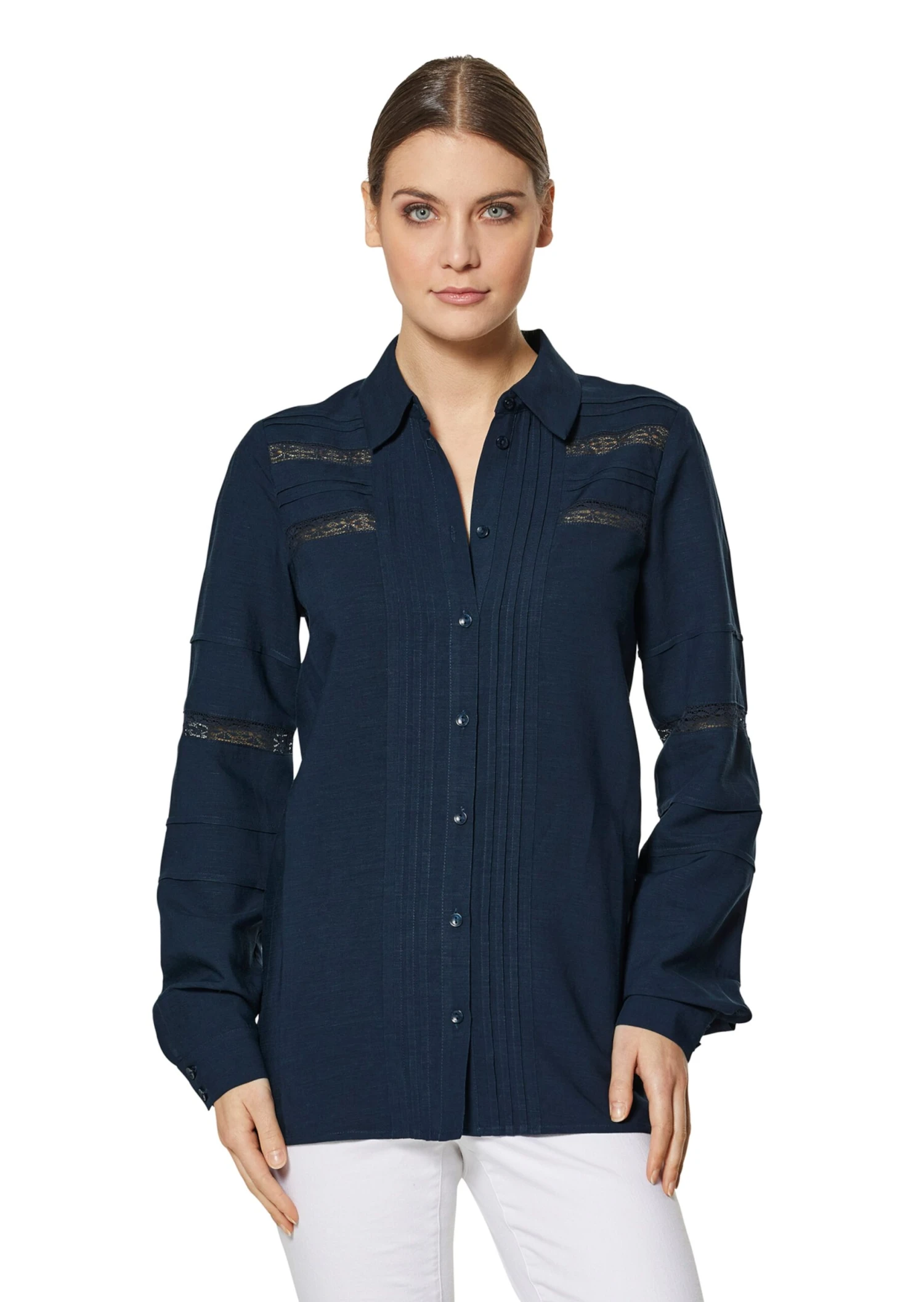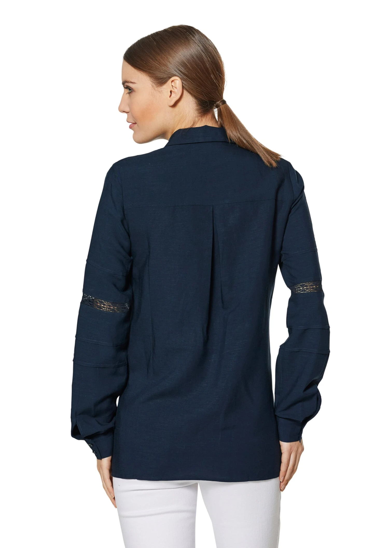 Ein edel sportiver Look in legerer Hemdblusenform, luftig leicht und angenehm kühl auf der Haut. Perfekt für lässig elegante Sommer-Styles! Dekorative Biesen und raffinierte Spitzeneinsätze bringen Schwung in den Look und lassen dezent Haut blitzen. Klappkragen, durchgehende Knopfleiste und lange Knopfmanschettenärmel sind gesetzt. Rückenpasse mit Falte für ein Plus an Tragekomfort.