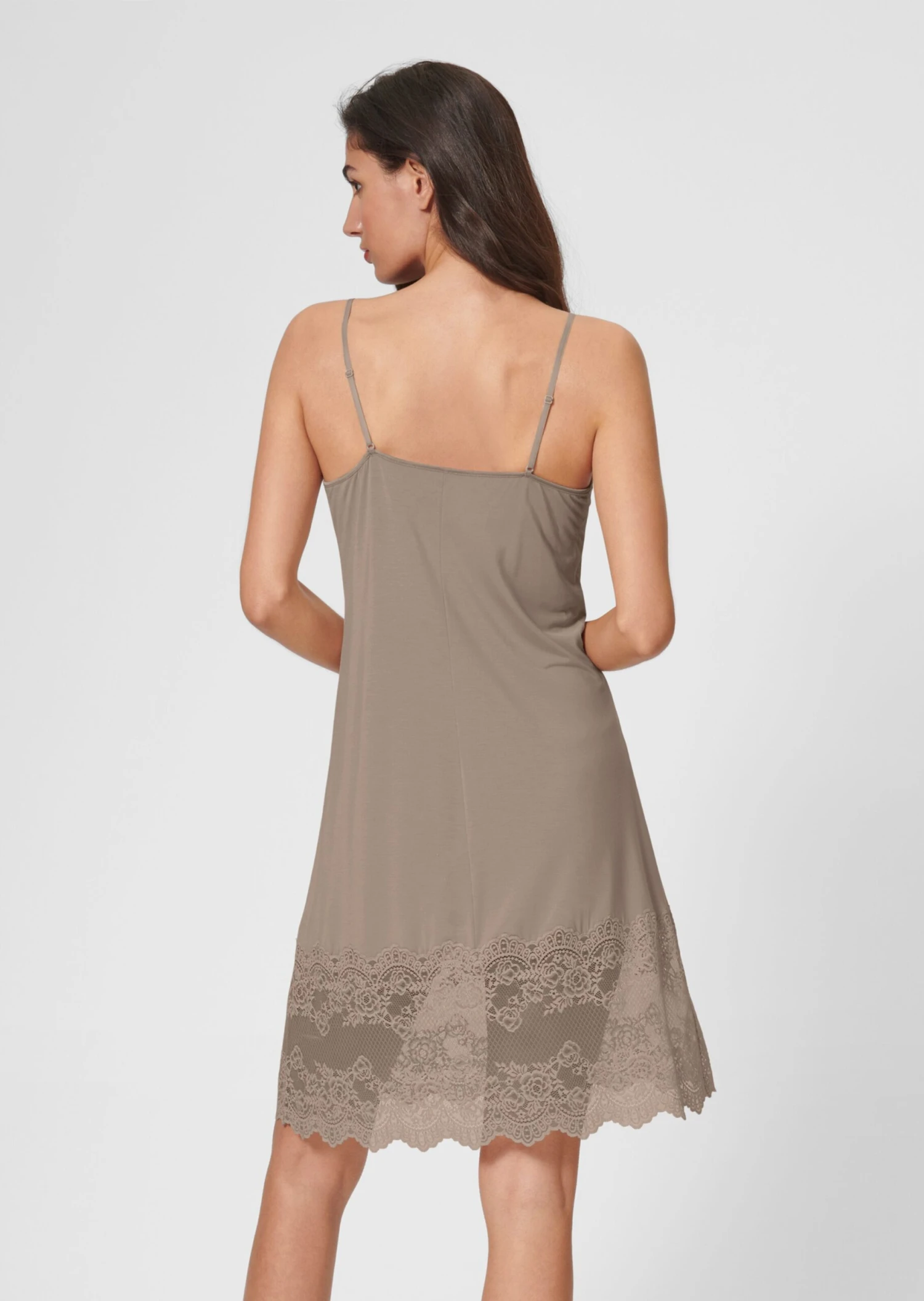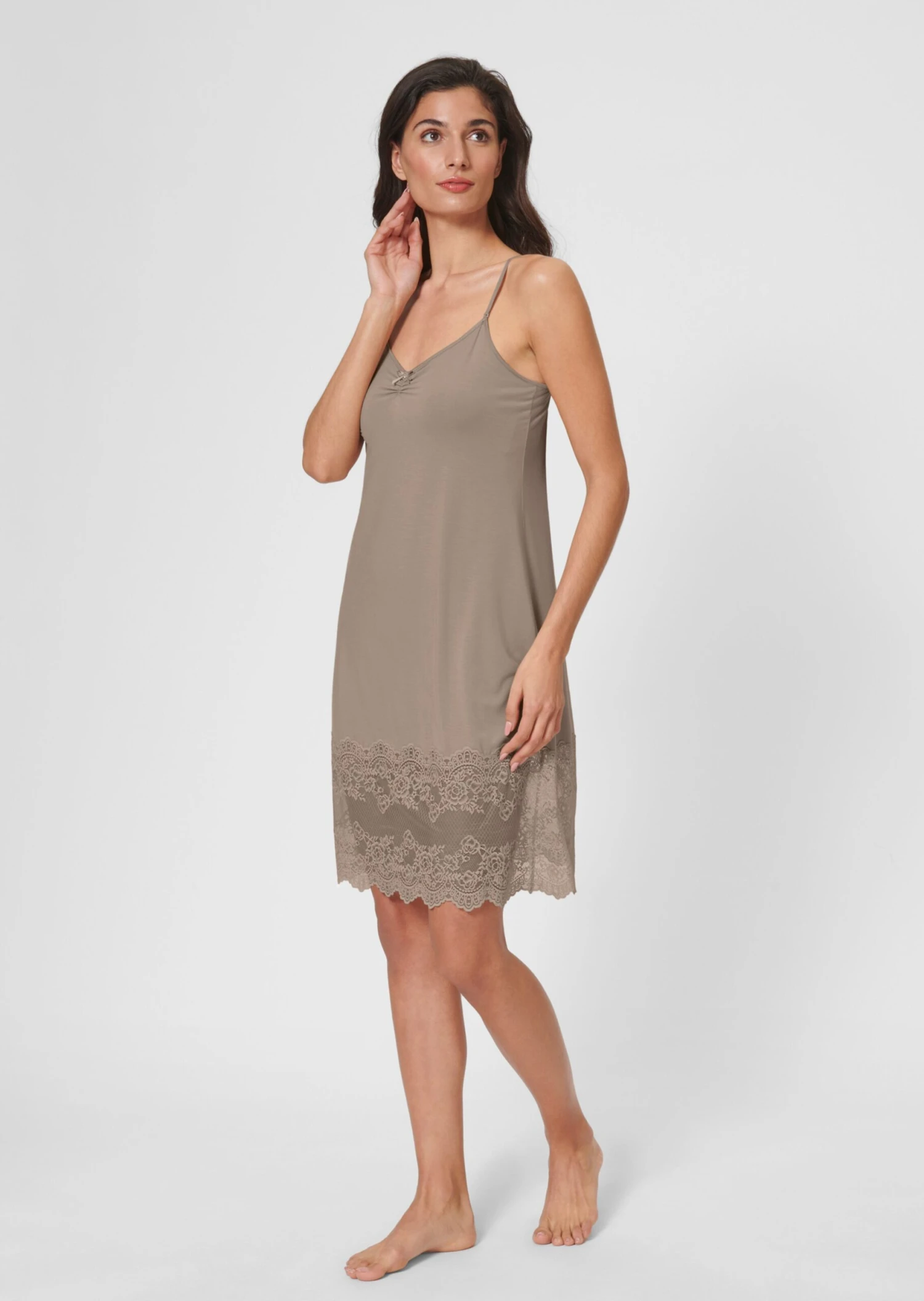 Als Darunter, Nachtkleid oder Negligé – dieses feminine Hemdröckchen übernimmt jede Aufgabe mit Bravour. Die elastische Modalware trägt sich leicht und supersoft auf der Haut. Der breite Spitzensaum, die kleine Raffung mit Zierschleife am Ausschnitt sowie die schmalen, verstellbaren Träger sind verführerisch schöne Details.
