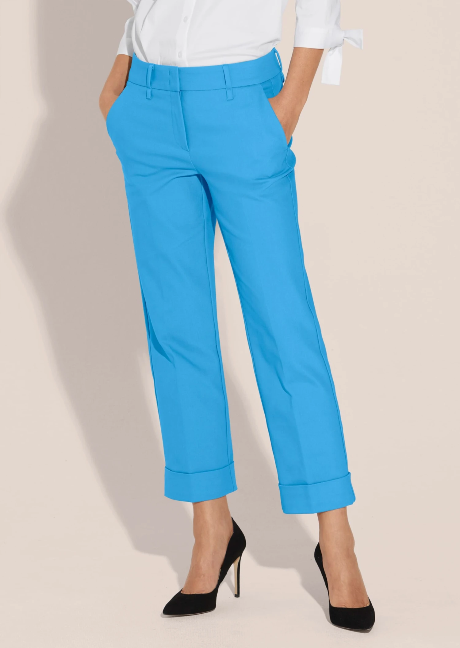 Die Hose in stylischer 7/8-Länge ist eine smarte Allrounderin und mischt bei allen Trend-Looks mit. Die Hose ist in gerader Form stretchbequem mit gepflegter Bügelfalte gearbeitet. Sie hat einen Formbund mit Innenbundsicherung, Häkchenverschluss und Gürtelschlaufen sowie Schubtaschen und Zierpattentaschen hinten.