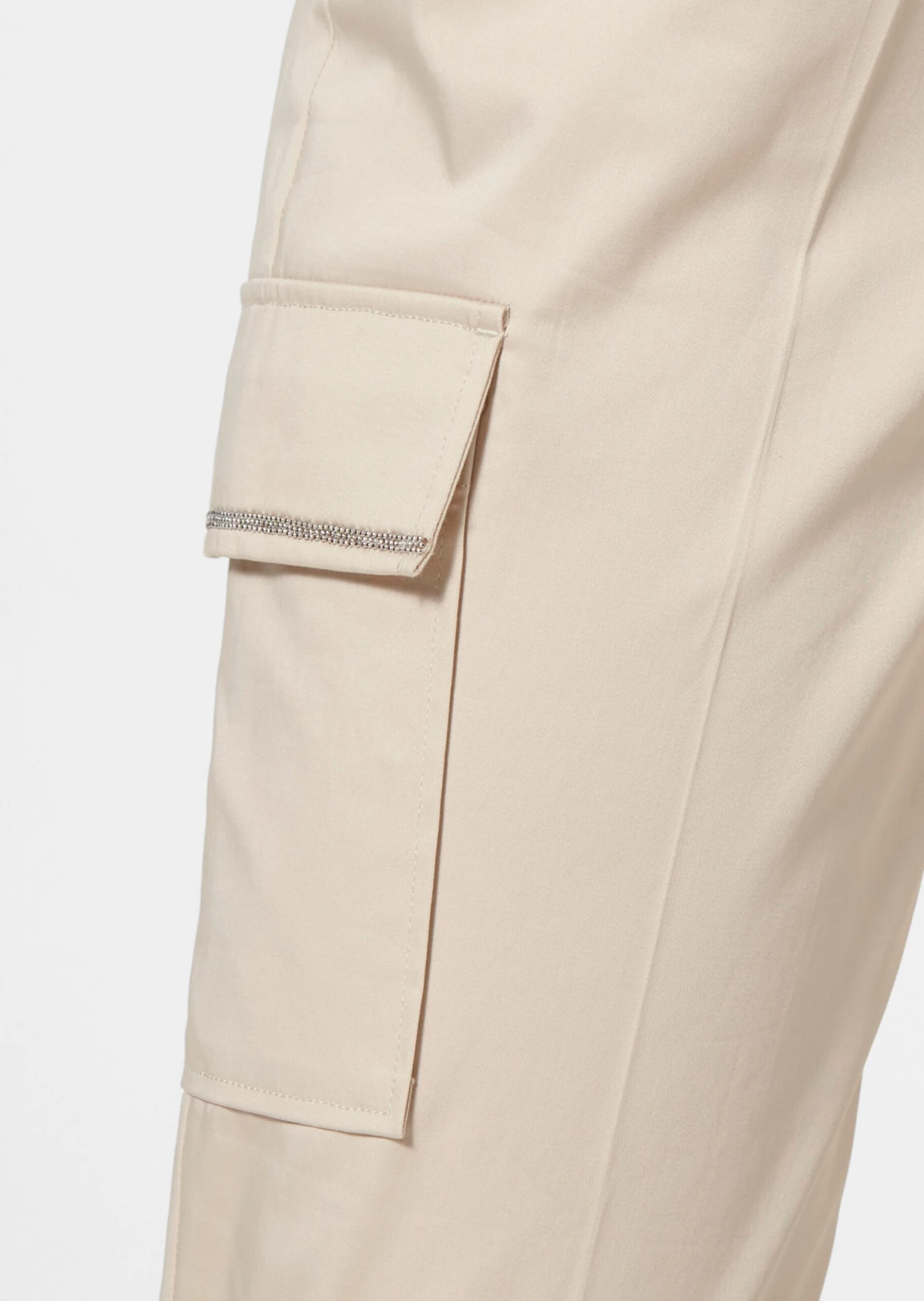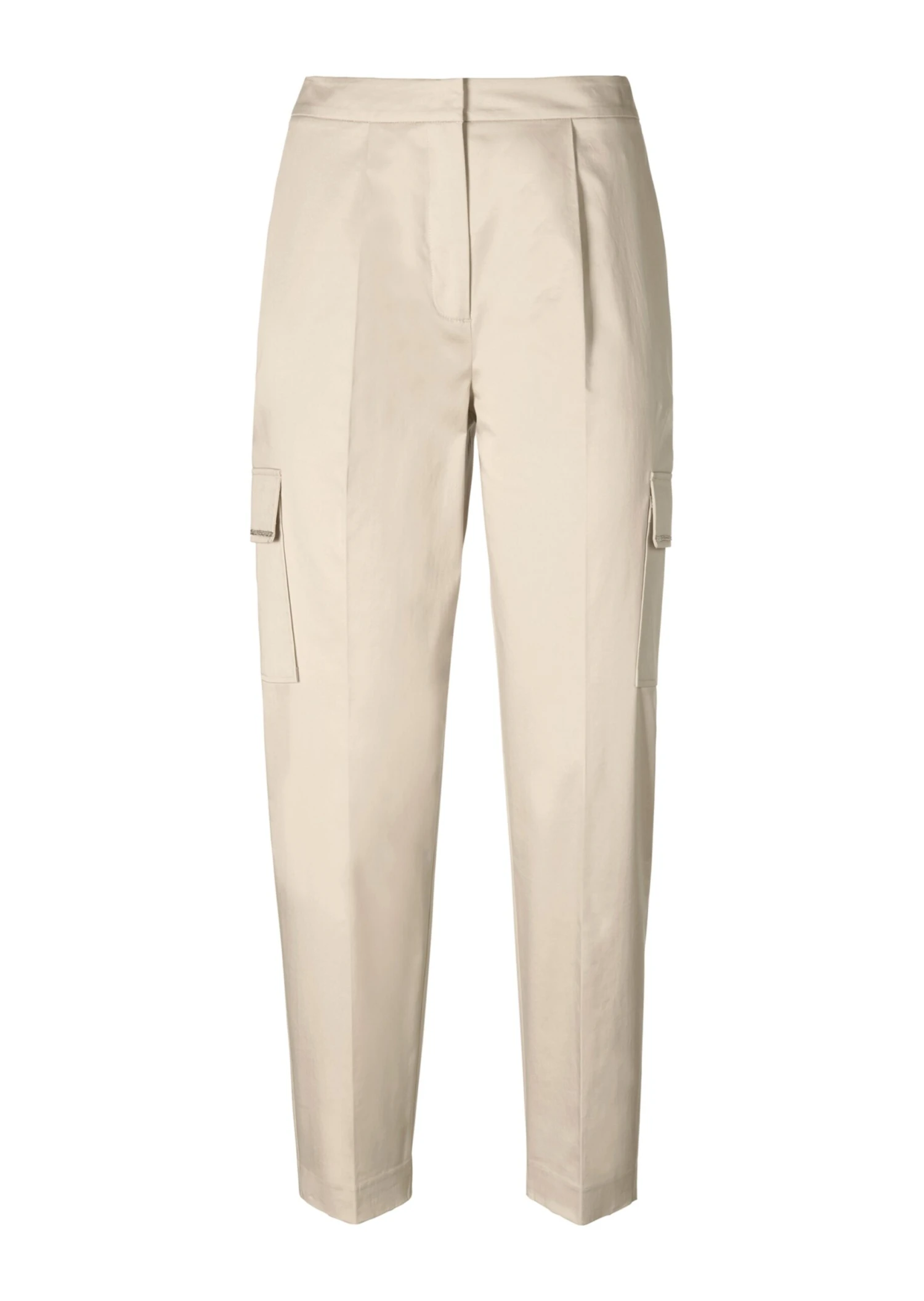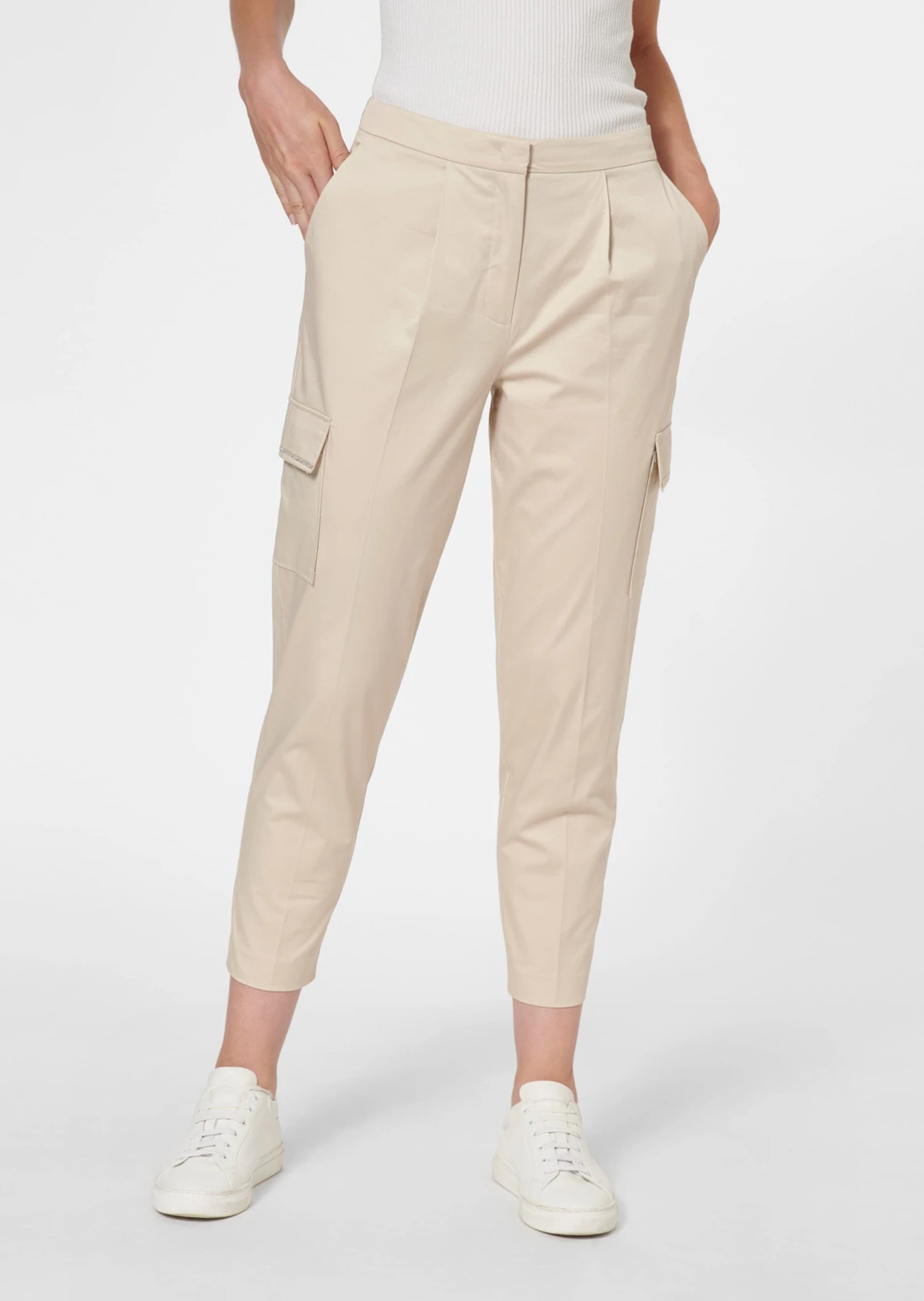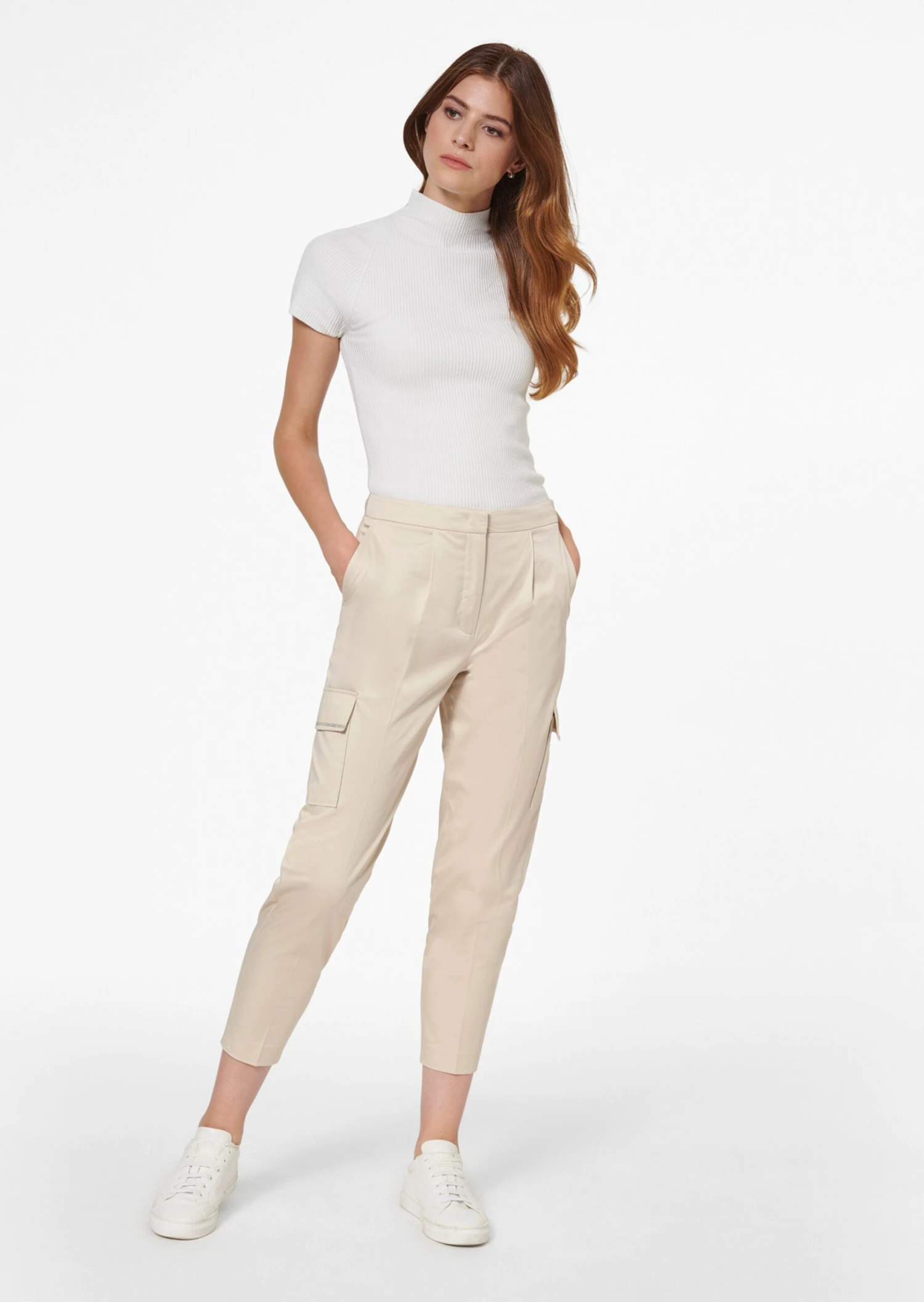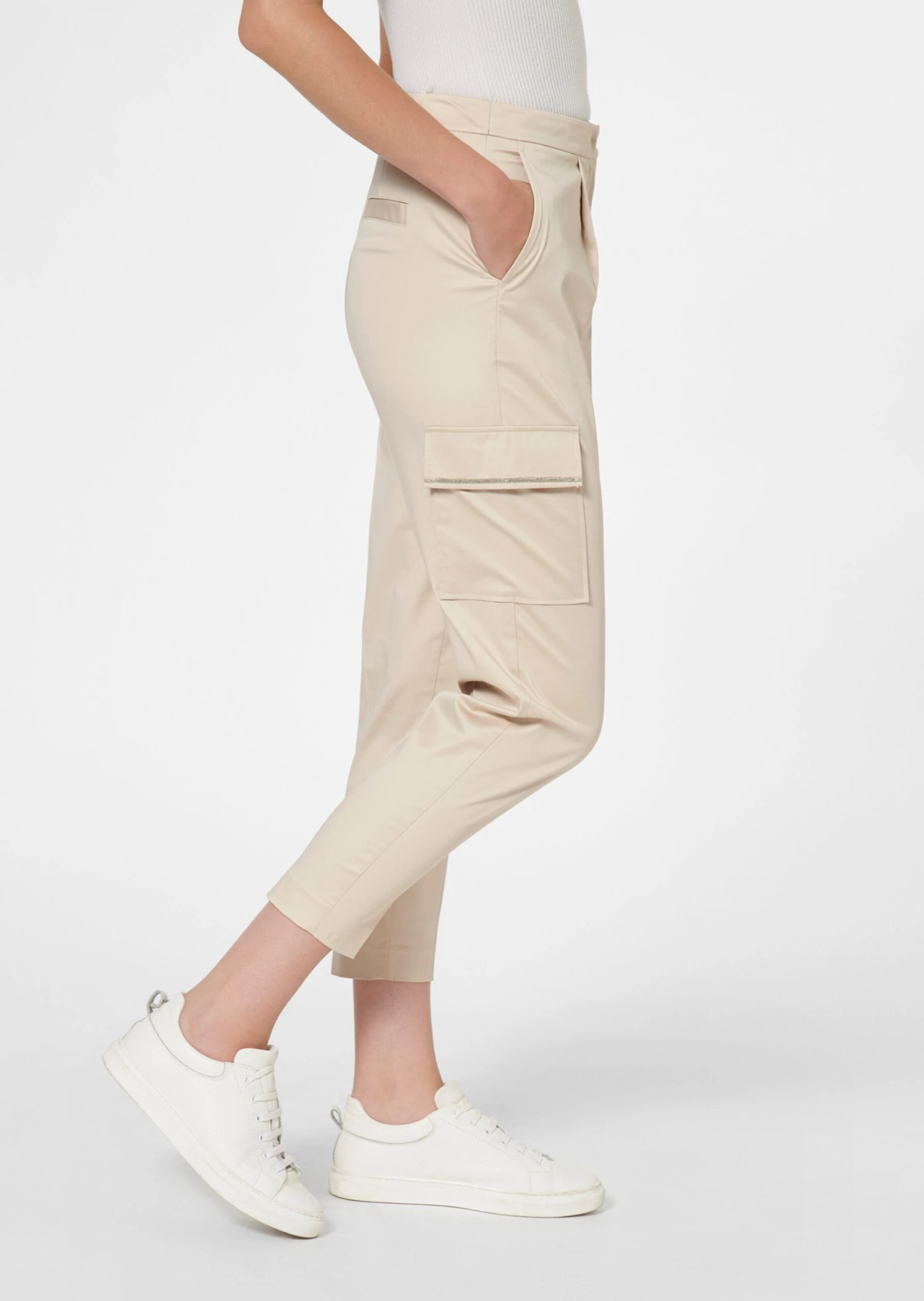 Angenehm leicht und modisch sportiv im Look begeistert die 7/8-Hose mit viel Trage-Komfort. Der Baumwoll-Stretch ist wohltuend kühl auf der Haut und macht jede Bewegung mit. Die schlanke Zigarettenform erhält durch gepflegte Bundfalten ihre bequeme Hüftweite. Ein Formbund mit Hakenverschluss, Schubtaschen, Ziergesäßleistentaschen, Innenbundsicherung, Bügelfalten sowie aufgesetzte Cargo-Taschen mit silberfarbenem Dekoband machen den Look komplett.