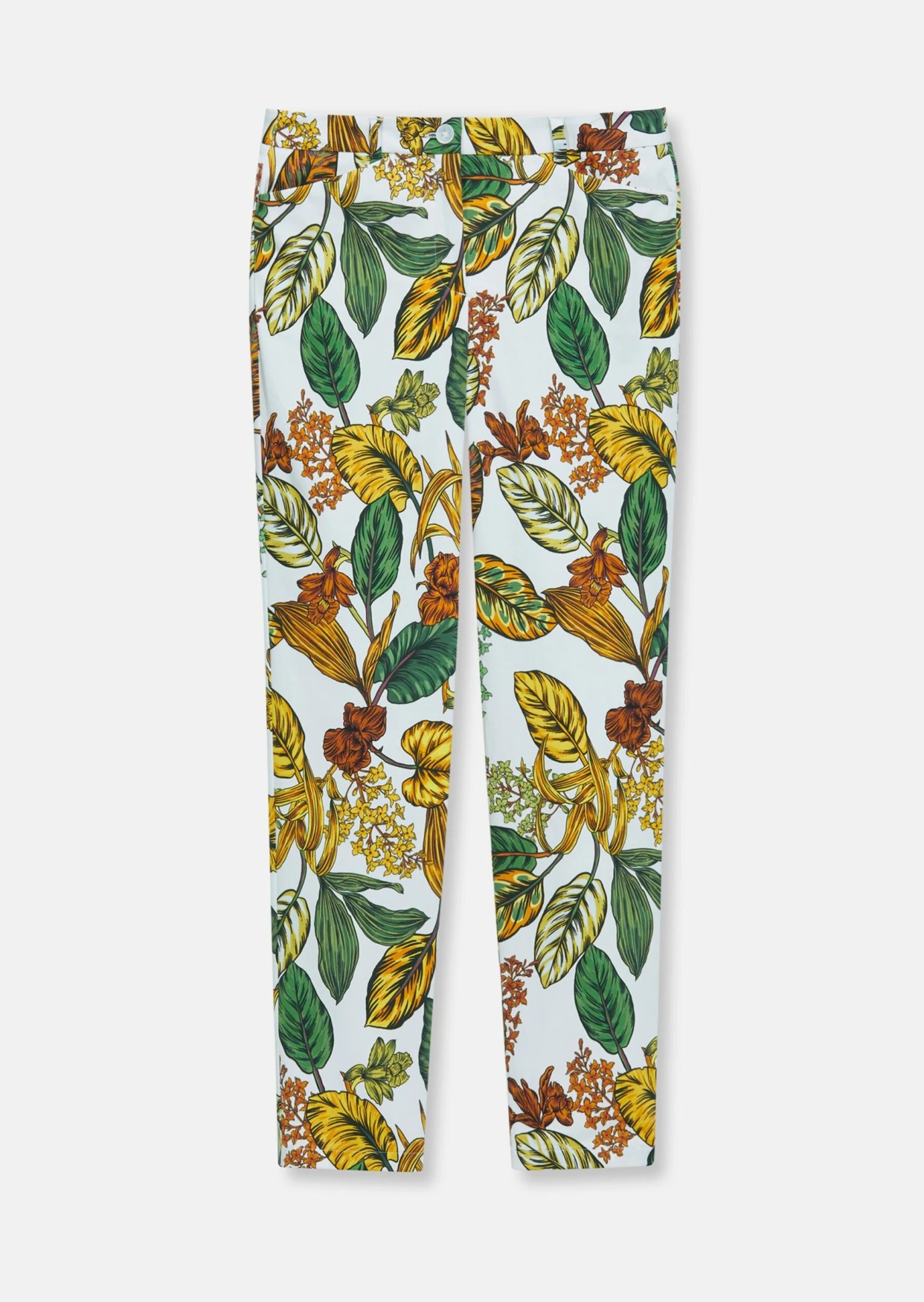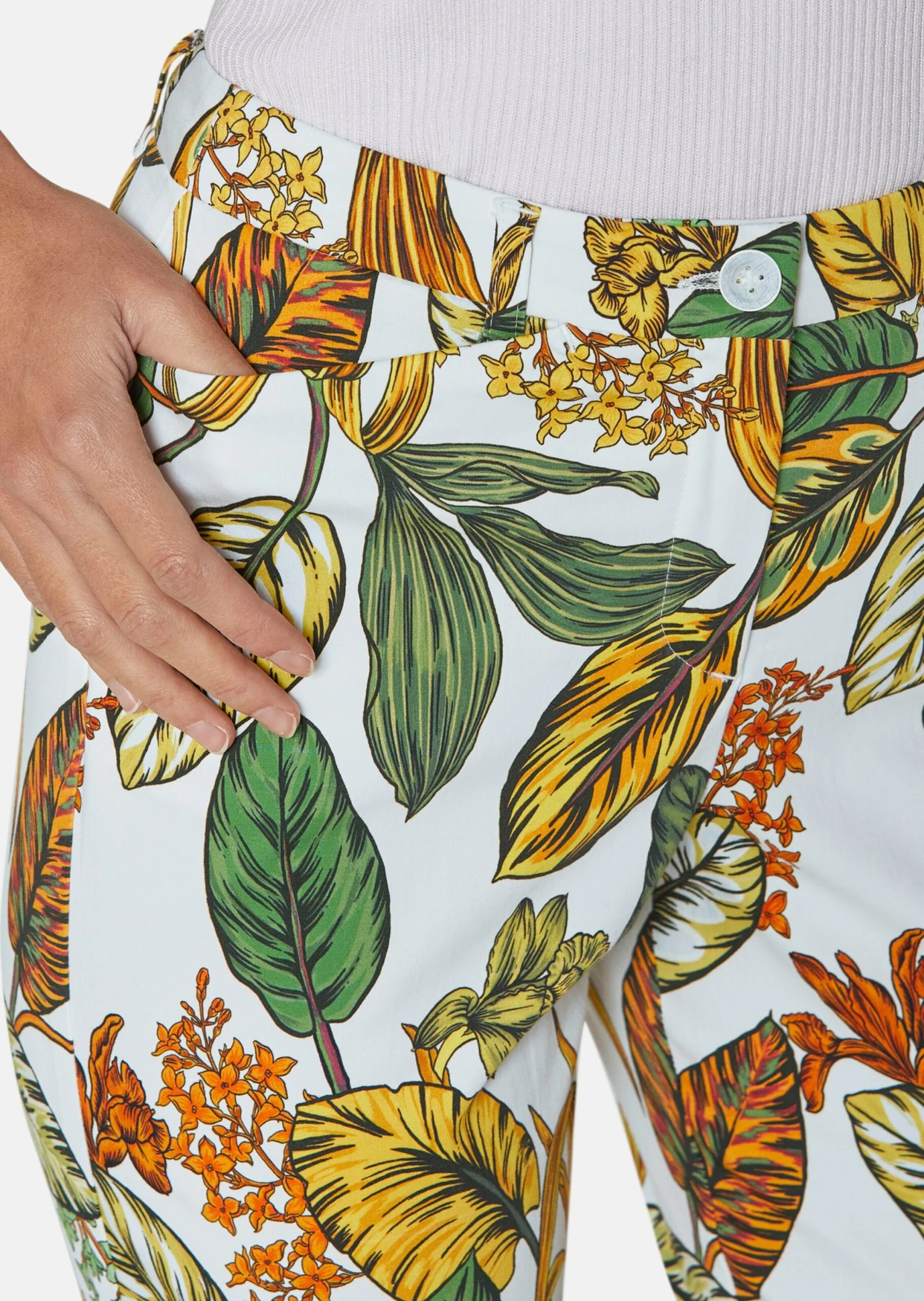 Eine Trendhose in den Tönen der Saison! Die Hose mit Blattmuster zeichnet eine angesagte Silhouette. Der Print macht aus jedem Stück ein Unikat! Wir haben sie in knöchellanger Form mit Formbund, Knopf, geknöpfter Innenbundsicherung, Gürtelschlaufen und Stecktaschen gestaltet. Durch zusätzliche Kurzgrößen können sie auch kleine Frauen prima tragen. Dank der Vielfarbigkeit können Sie sie gut zu den unterschiedlichsten Tönen kombinieren.