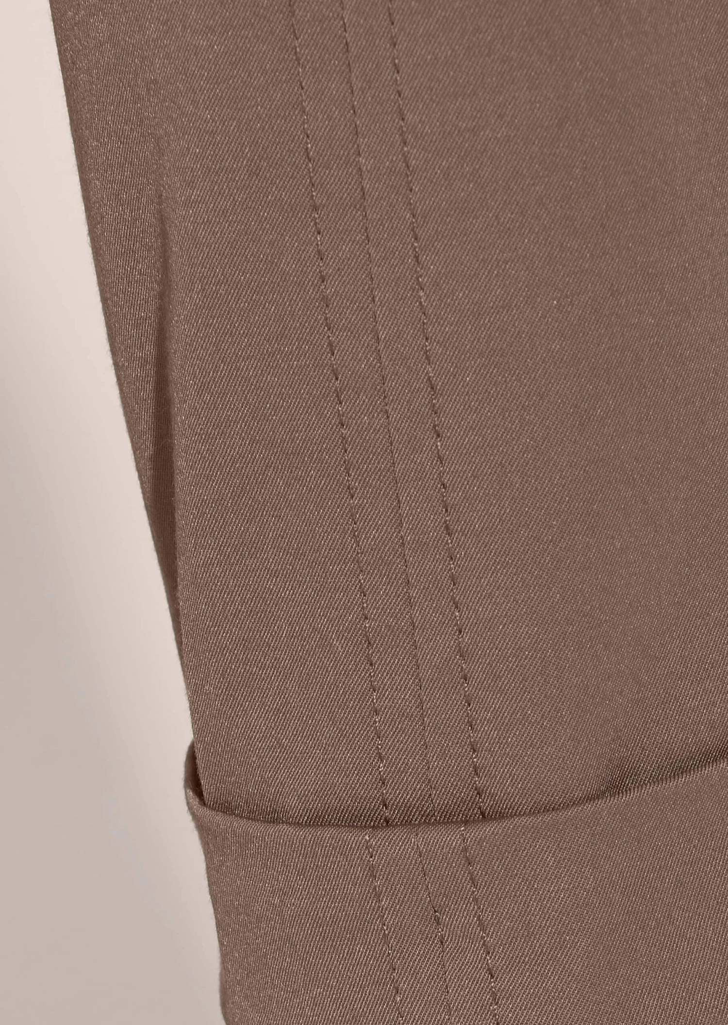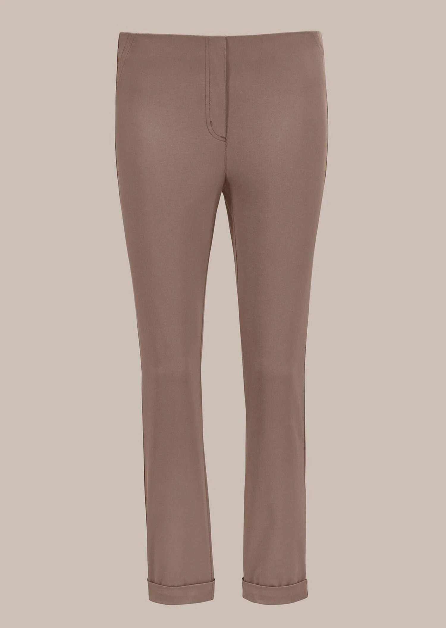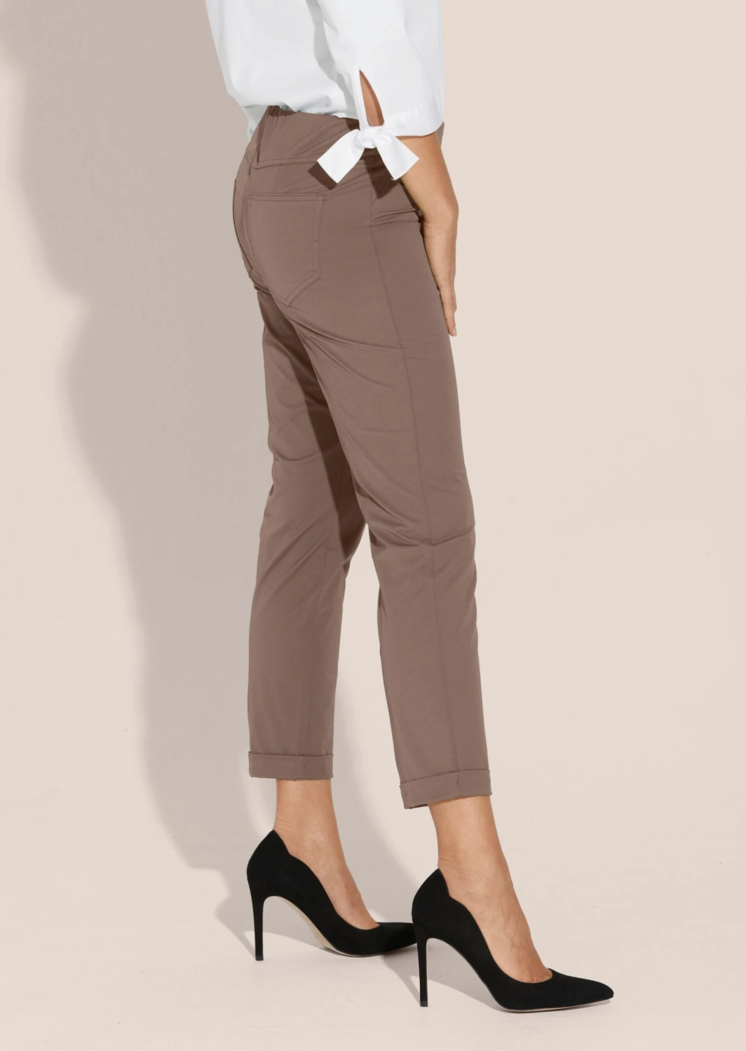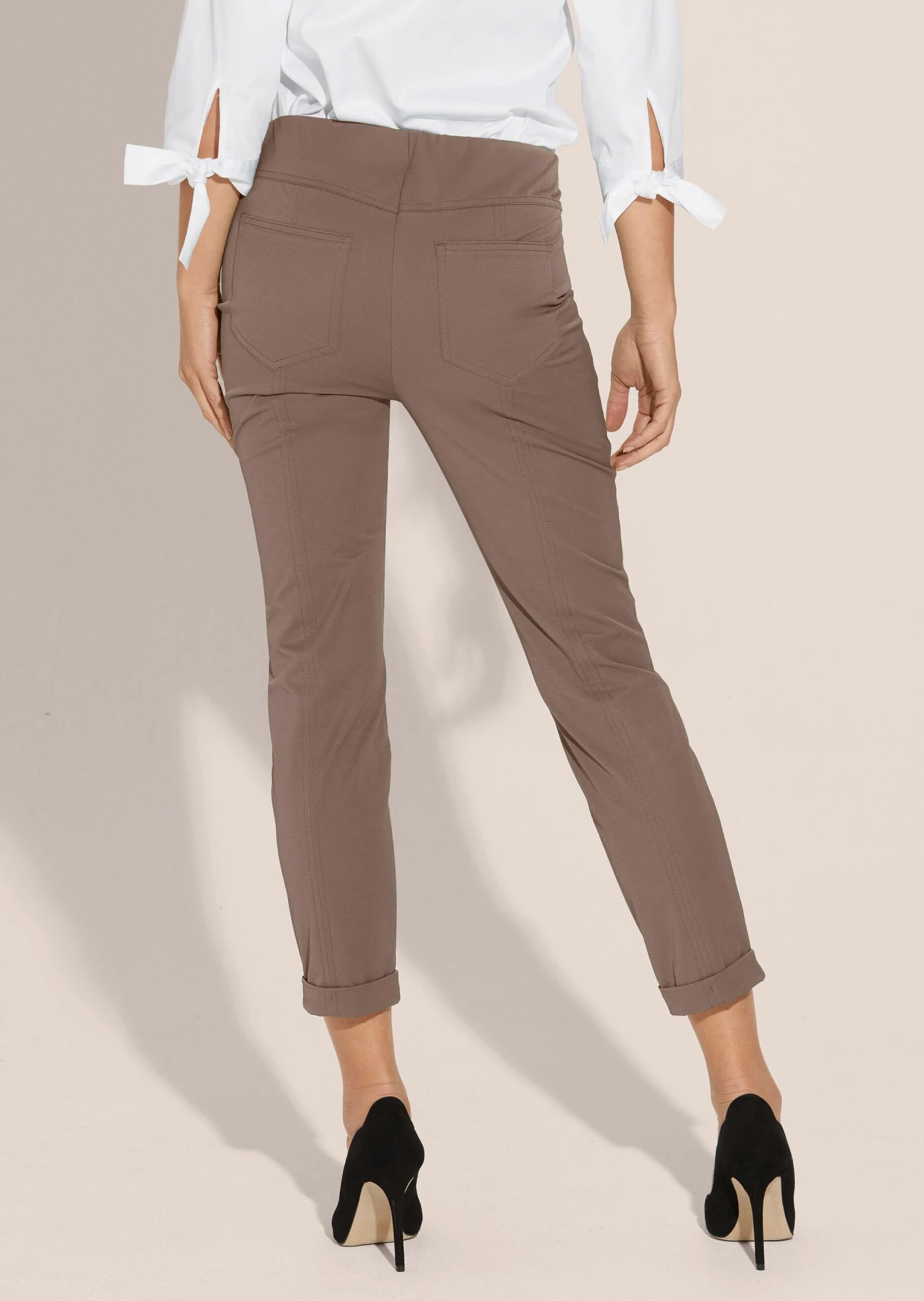 Schlanke und bequeme Hosen sind ein Muss für trendbewusste Sortimente. Die komfortable Schlupf-Variante sorgt durch ihren breiten Elastikbund für problemloses Ein- und Aussteigen, sitzt bequem auf der Hüfte und fühlt sich bei jedem Anlass wohl. Aufgesetzte Gesäßtaschen und dekorative Ziernähte prägen die Rückenansicht, während fixierte Saumaufschläge den Look komplettieren.