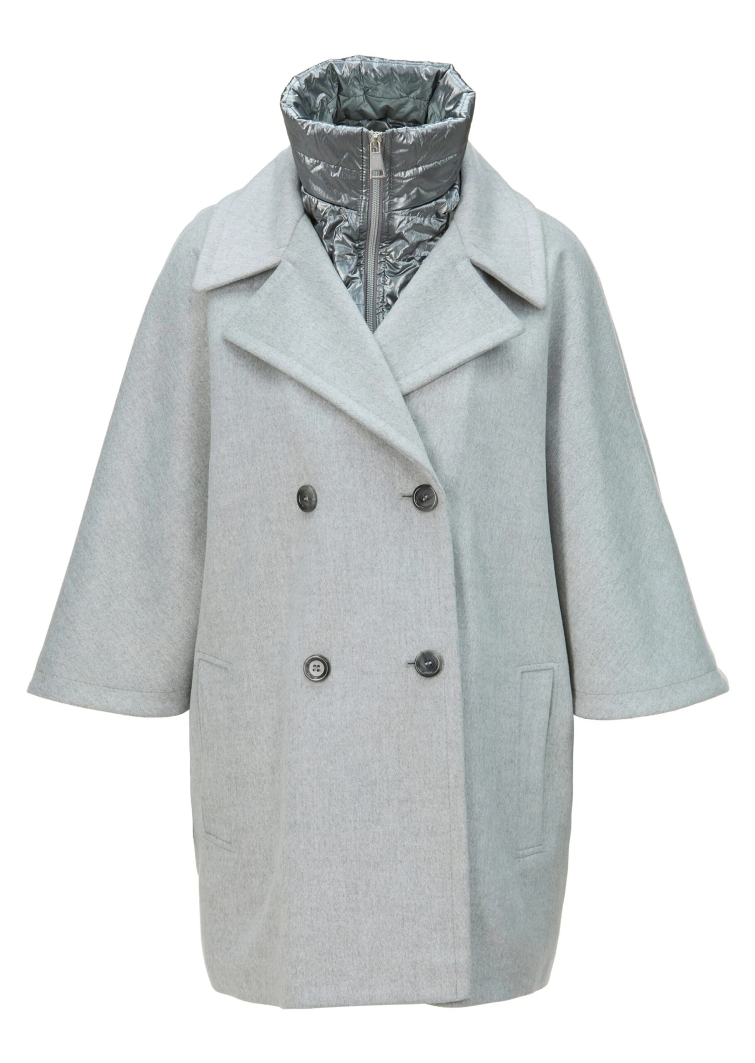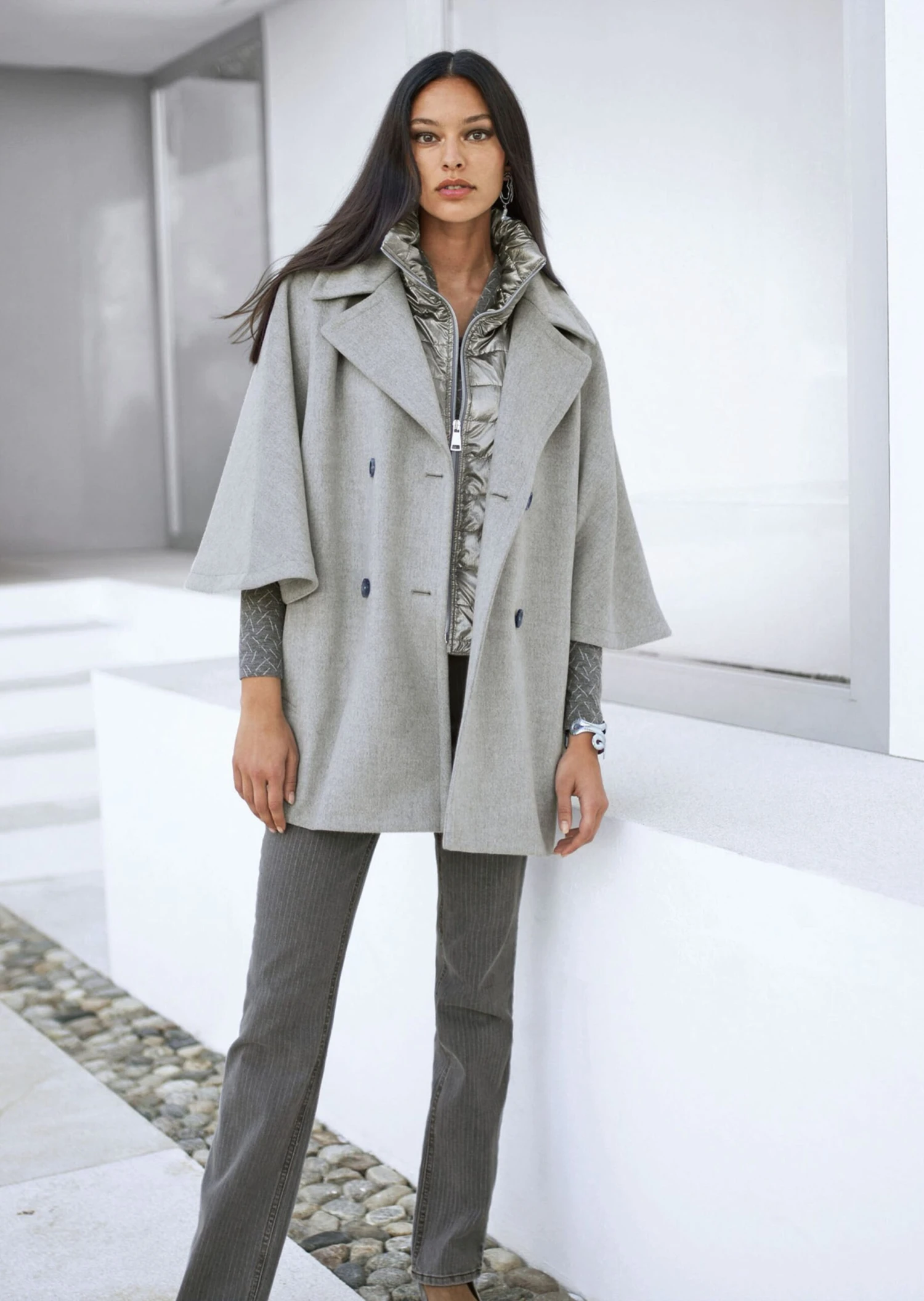 Eine gelungene Mischung aus Jacke und Cape – die Mode ist um ein spannendes It-Piece reicher geworden! Edel, lässig und elegant zugleich hat es alle Attribute, die zu einem stilvollen Auftritt gehören. Die super softe Melange-Qualität trägt zum angenehmen Wärmegefühl und hohen Tragekomfort bei. Großzügig weit und doppelreihig geknöpft zeigt sich die Jacke mit breitem Reverskragen, Längsleistentaschen und edlen Knöpfen in Steinnuss-Optik. Ein überraschendes Detail ist der wattierte Steppeinsatz mit Frontzipper und Stehkragen, der auch herausnehmbar ist – so lässt sich das Modell ganz nach Wetterlage und Laune variieren. Ein perfekter City-Begleiter, der mit vielen Looks aufs Schönste harmoniert.