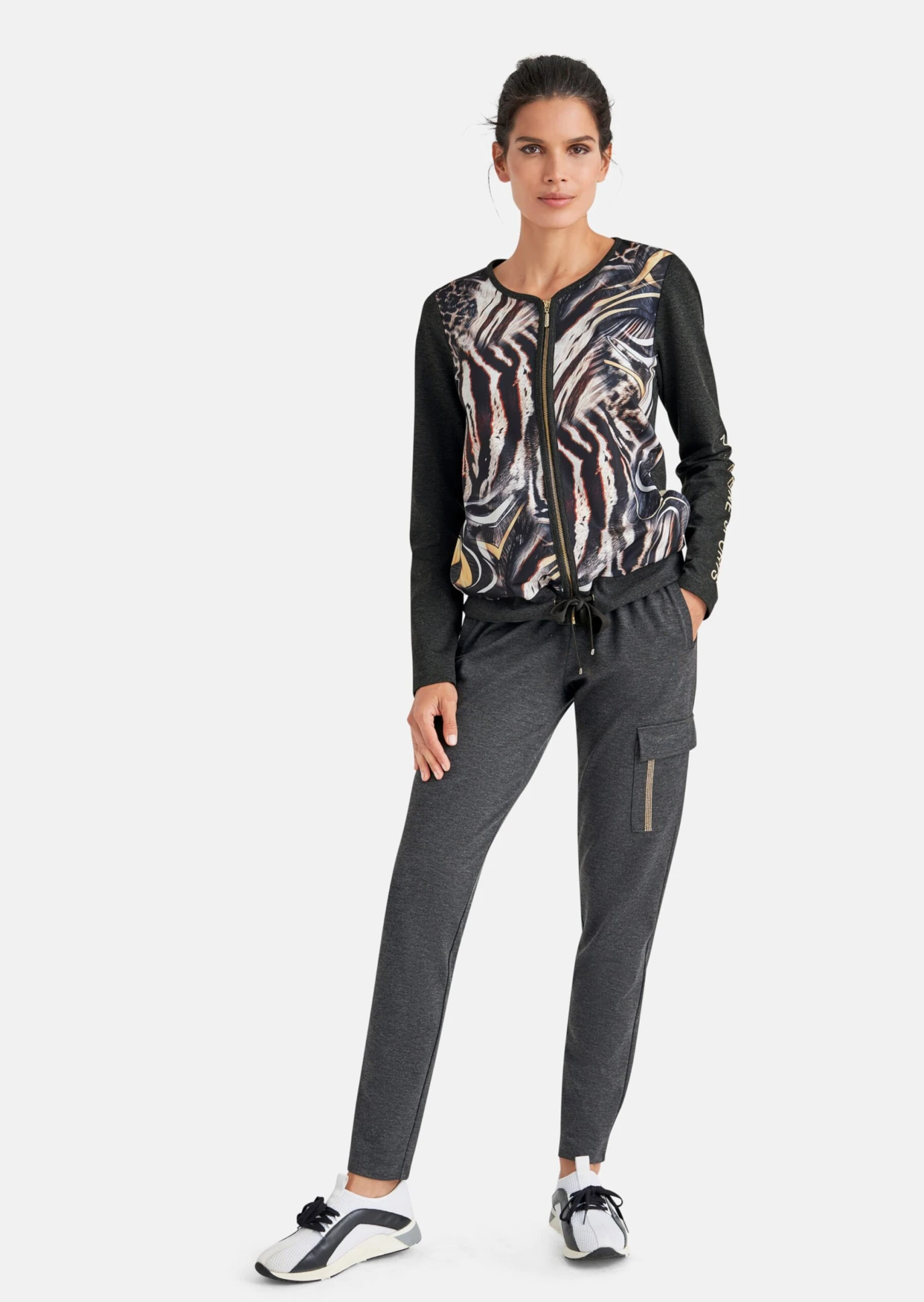 Diese Sportjacke verspricht durch den Materialmix einen trendstarken Auftritt – im Vorderteil mit abstraktem Animal Unikatprint, im Rücken und am Ärmel uni aus Melangeware. Lässig der kragenlose Style mit Vorderzipper, seitlichen Einschubtaschen und geripptem Saumbund mit Bändchenzug. Modisches Extra: der Logo-Schriftzug am Ärmel.