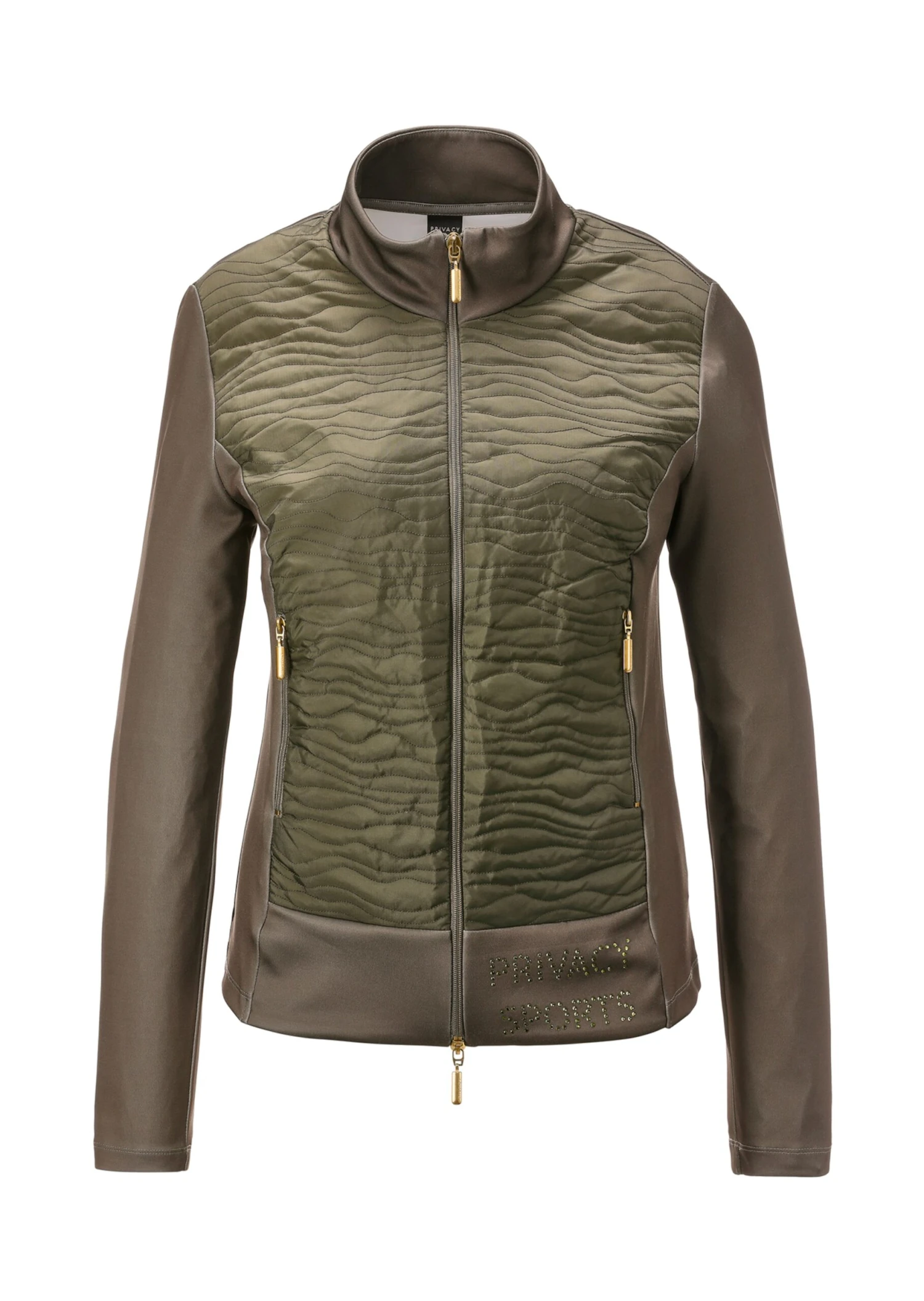 Lässige Freizeit-Jacken machen sich jetzt mit neuen modischen Details unentbehrlich! Durch den leicht wattierten Steppeinsatz im Vorderteil und den aus Glitzersteinchen gestalteten PRIVACY SPORTS-Schriftzug am Saum wirkt diese Jacke unglaublich edel – und lässt sich mit passenden Kombipartnern nicht nur für Sport und Wellness, sondern auch für die City stylen. Die softe Stretch-Qualität garantiert ein angenehmes Tragegefühl und macht die Jacke herrlich bequem. Wiener Nähte sorgen für eine optimale Passform. Lange Ärmel, ein 2-Wege-Reißverschluss, Stehkragen und Zippertaschen runden den lässig sportiven Look perfekt ab.
