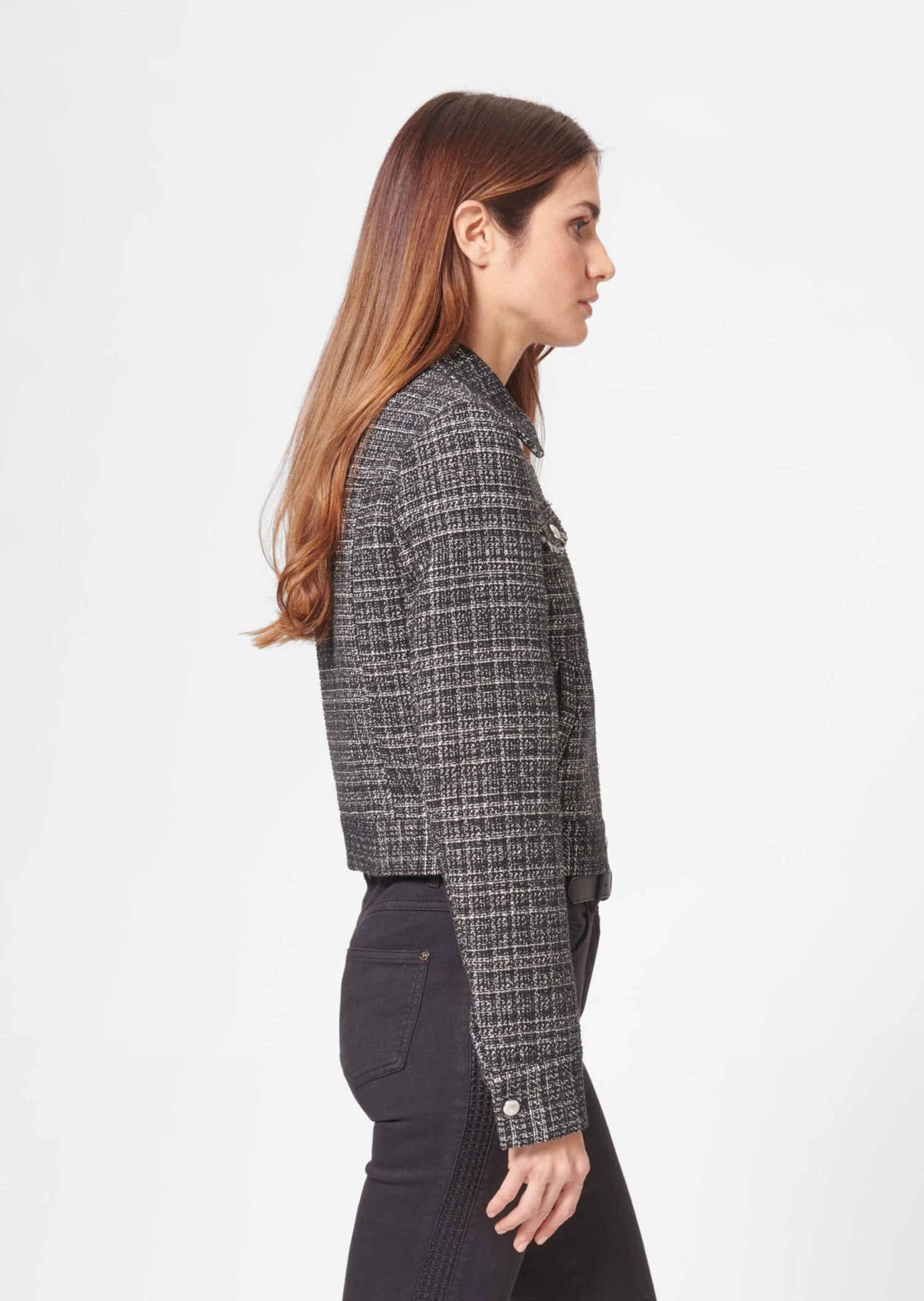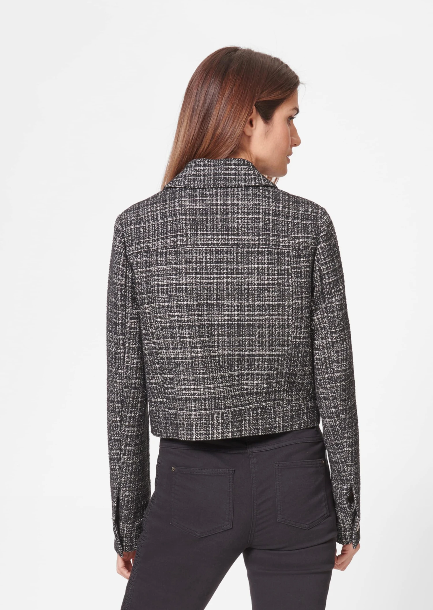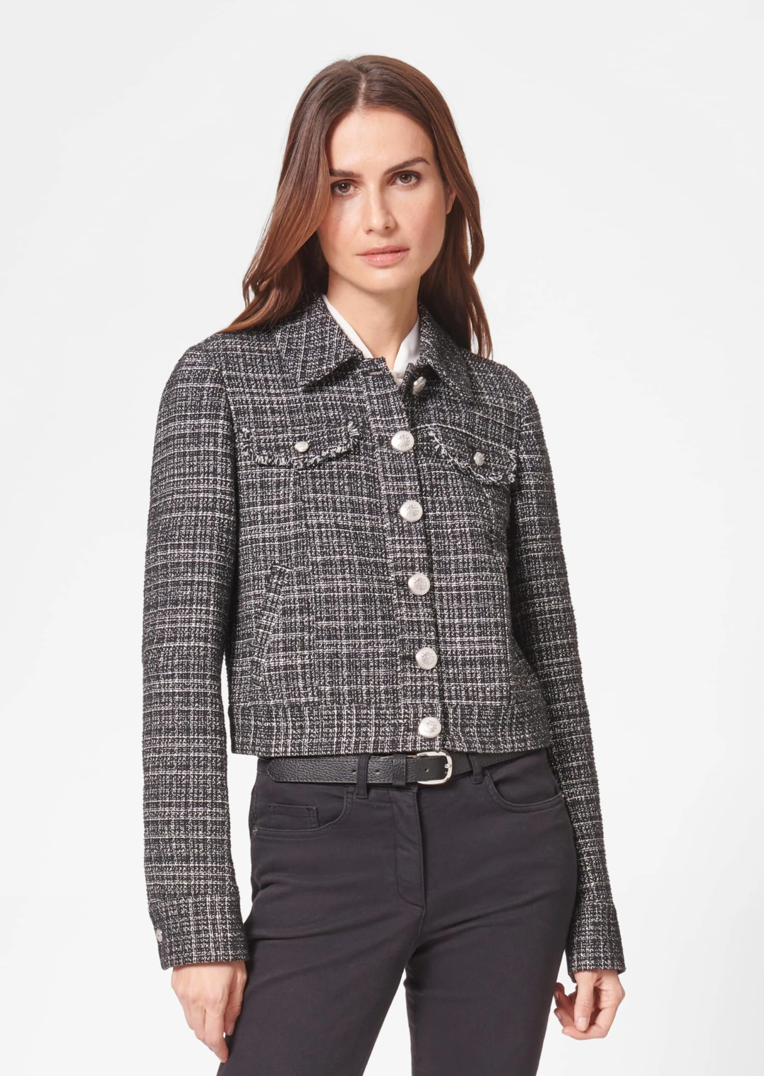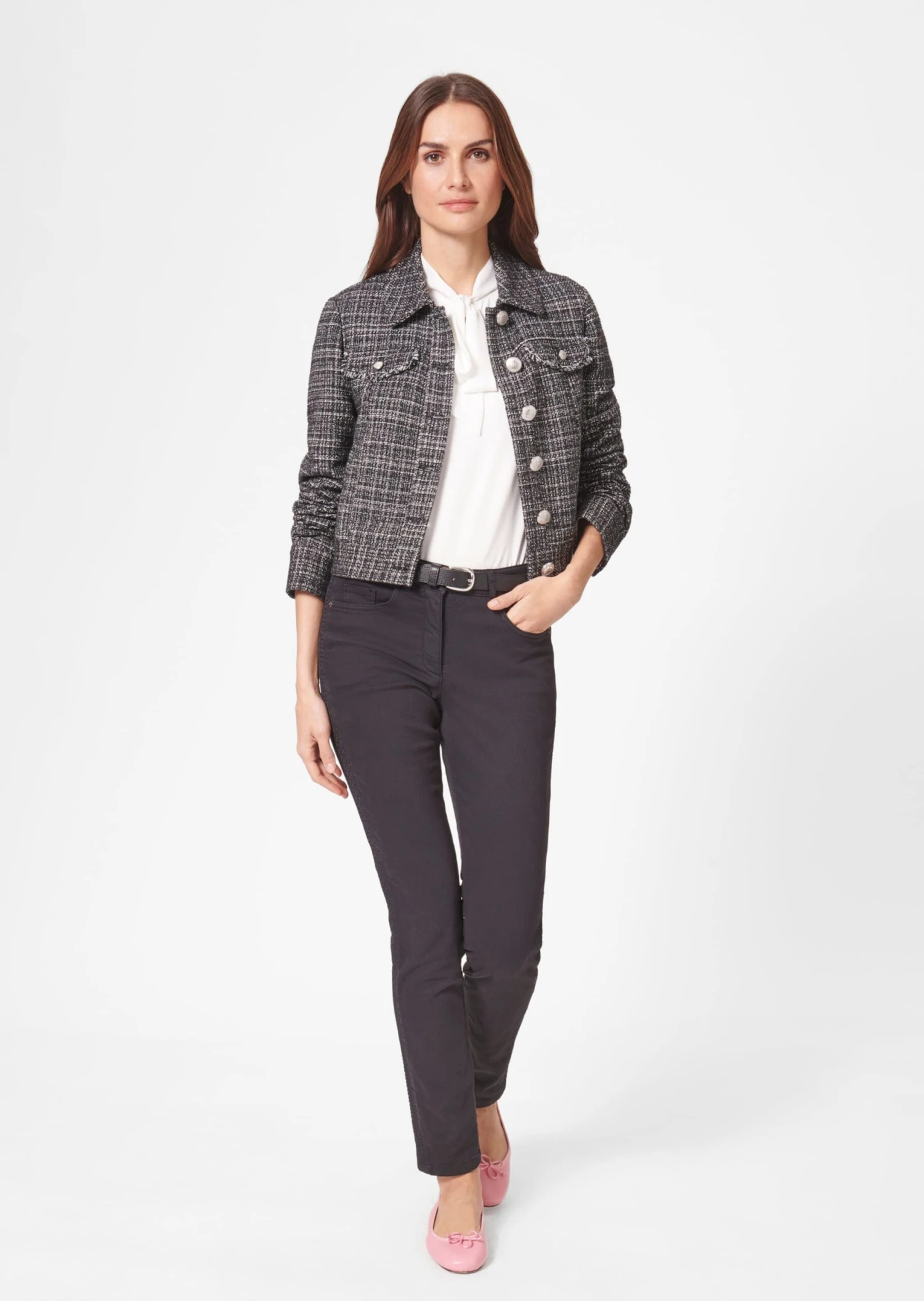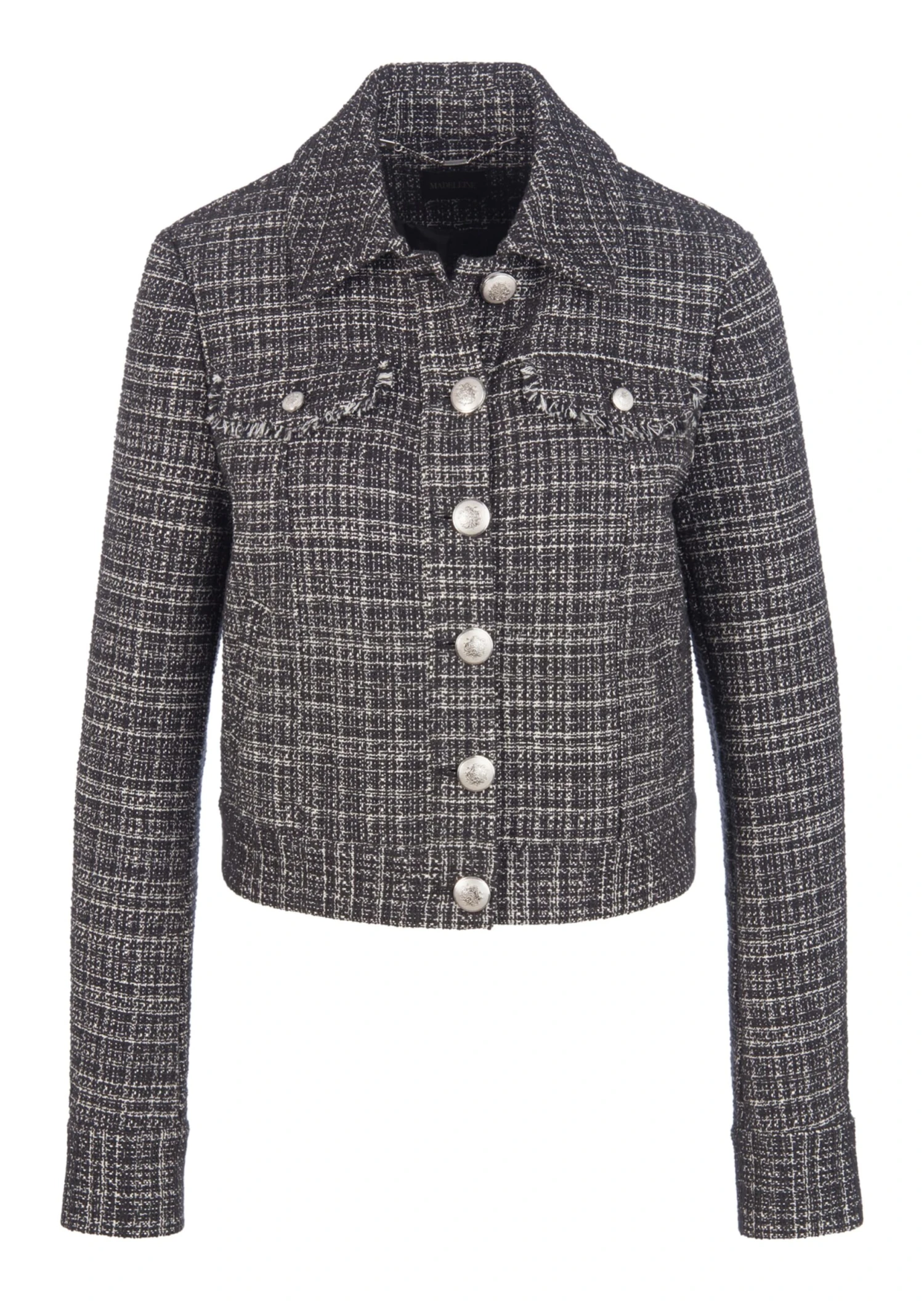 Eine Favoritin stilvoller Auftritte: Die kurze Tweedjacke mit geknöpften Brustpattentaschen wirkt durch ihre Jeansjackenform so modern. Silberfarbene Knöpfe unterstreichen ihre Wertigkeit. Der kofferfreundliche Cottonmix trägt sich schön angenehm. Dank ihrer Farbkomposition können Sie sie gut kombinieren – zu hellen und zu dunklen Tönen.