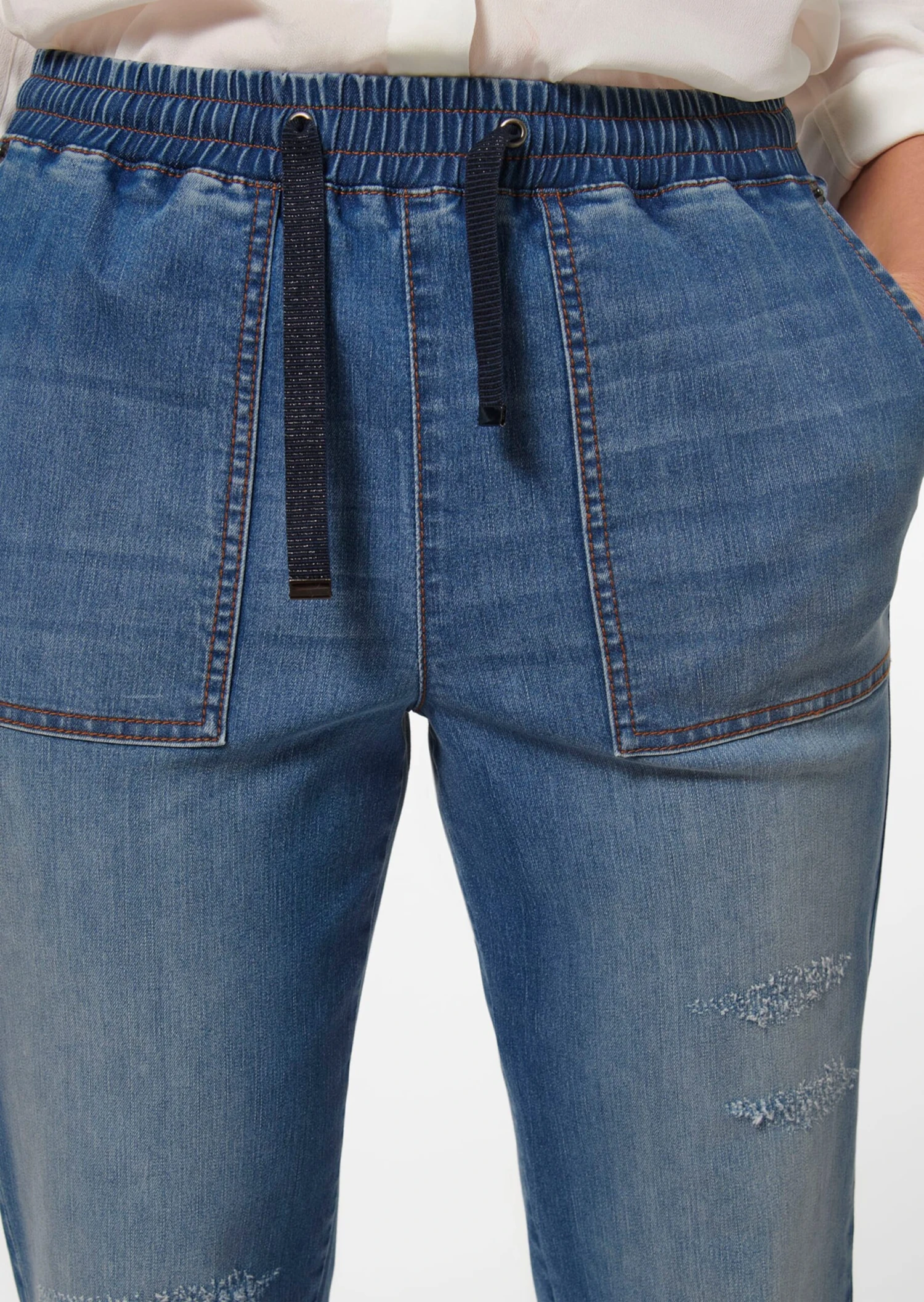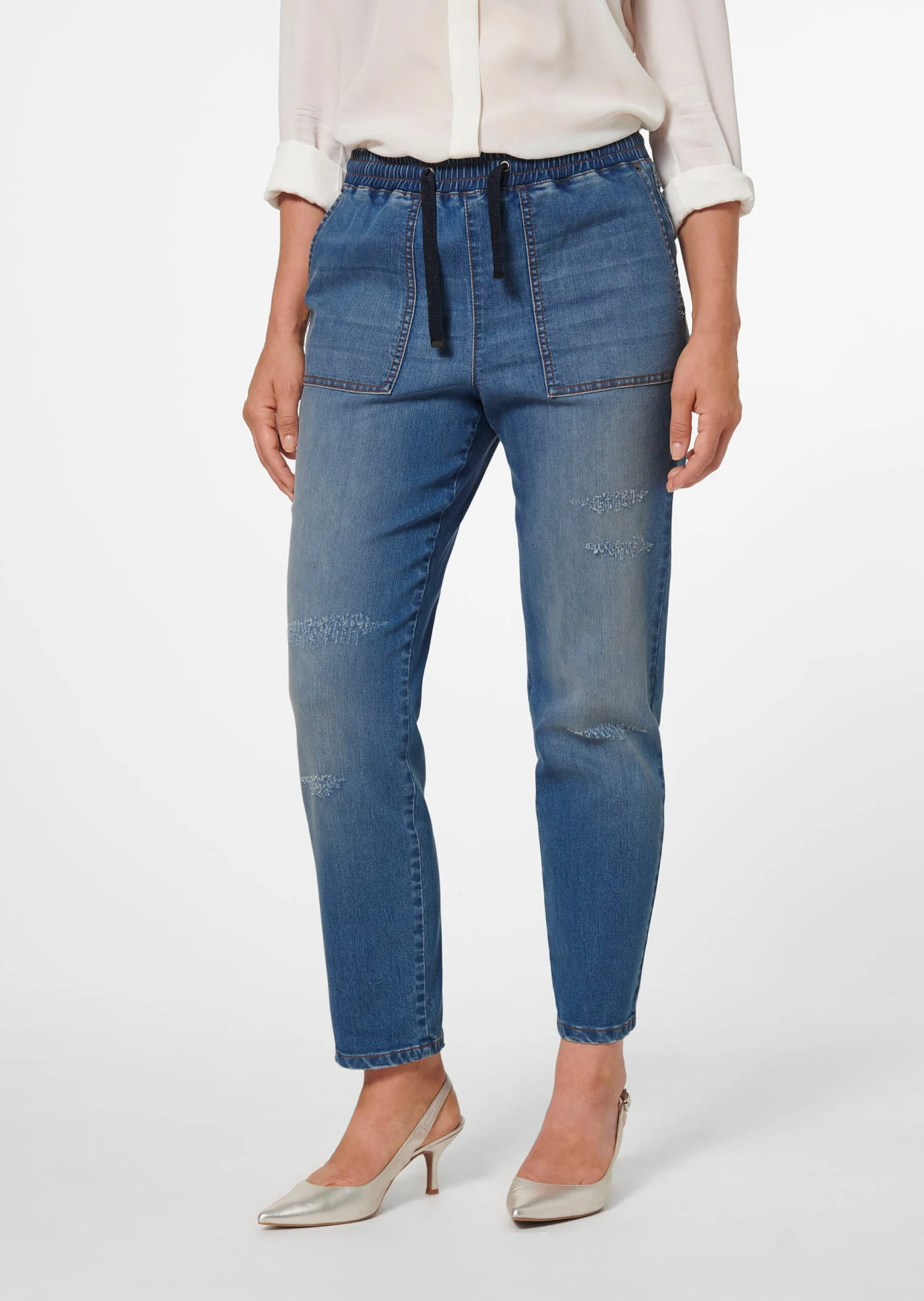 Eine lässige Stylingpartnerin für trendige Looks! Die Jeans mit Elastikbund wirkt durch ihre Destroyed-Effekte so cool. Gestaltet ist sie mit aufgesetzten Schubtaschen, aufgesetzten Gesäßtaschen, M-Jeansnieten, rückwärtiger Formpasse und Elastikbund mit Tunnelzug. Dank Kurzgrößen können sie auch kleine Frauen prima tragen.