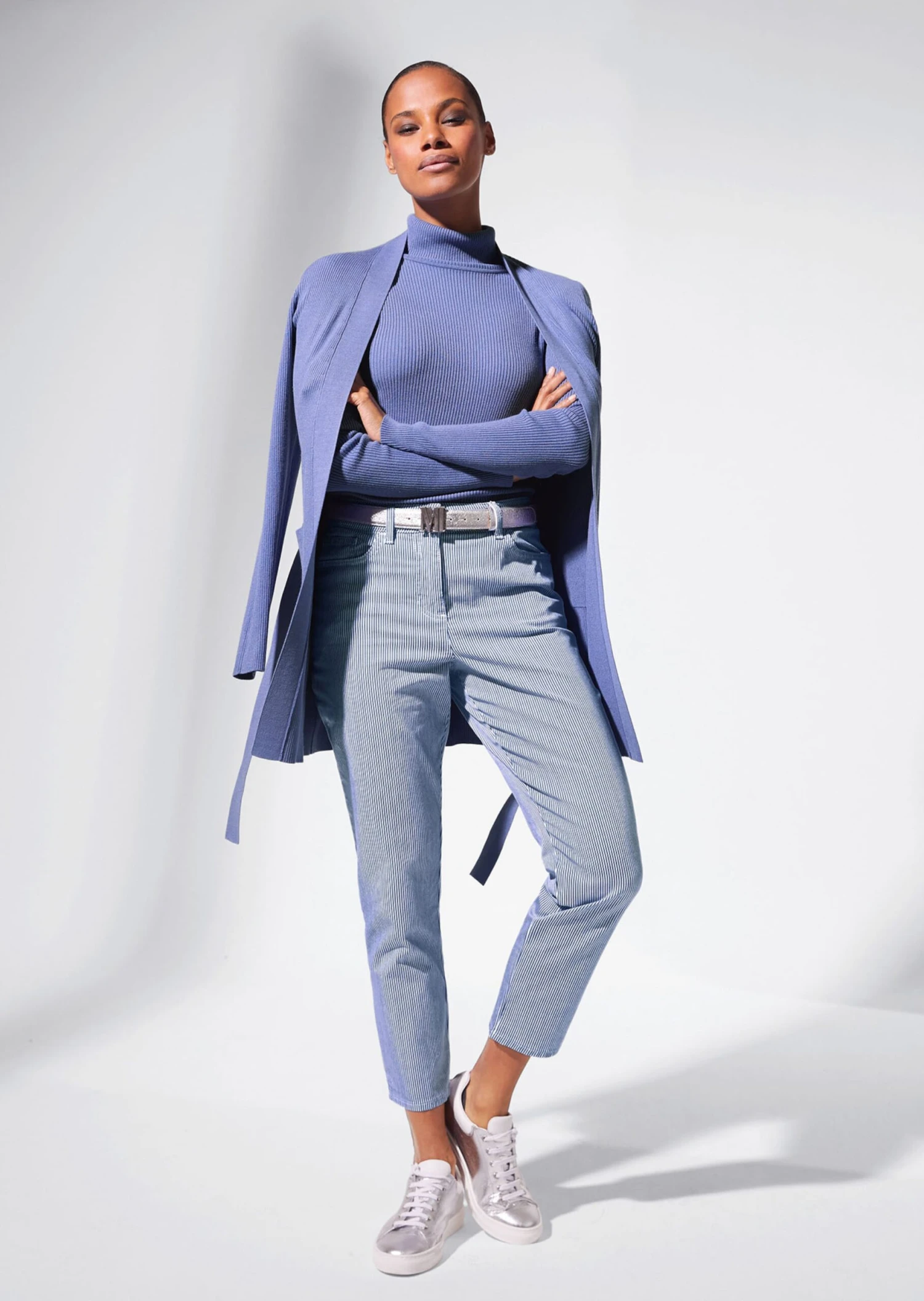 Für maritime Stylings mit frischer, moderner Aussage. Die Jeans mit Streifen zeichnet eine wunderbar schlanke Linie und überzeugt mit ihrer guten Passform. Wir haben sie im 5-Pocket-Style und in verkürzter, schmal zulaufender 7/8-Form mit Formbund, Knopfverschluss und Gürtelschlaufen gestaltet. Der MADELEINE-Knopf, das MADELEINE-Label, kleine Taschennieten und tonige Nähte setzen dezente Akzente. Dank zweier Größenläufe mit zusätzlichen Kurzgrößen können sie auch kleine Frauen prima tragen.