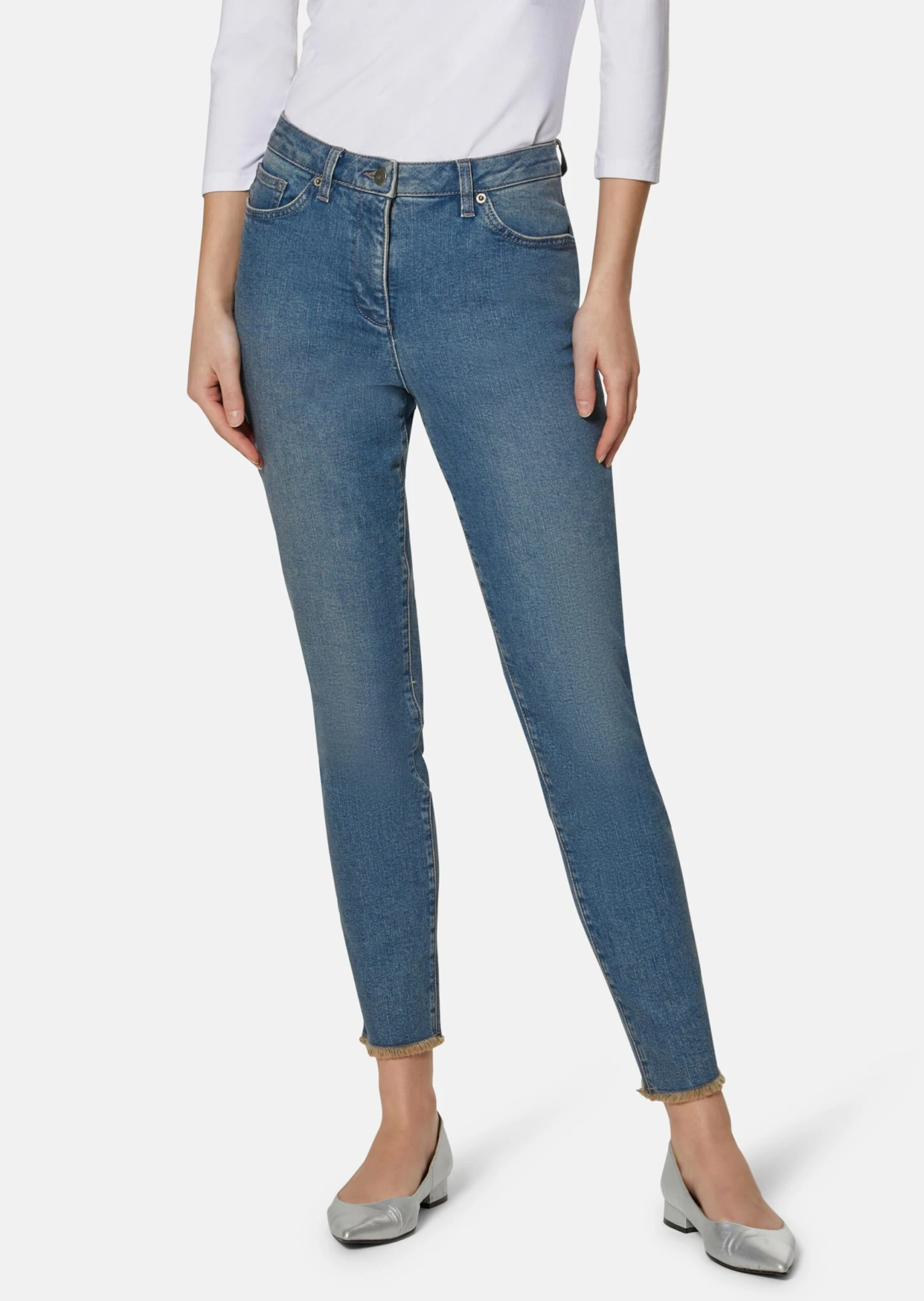 Eine Jeans im Skinny-Fit, die mit angesagten Fransen dem Lässigtrend der Saison folgt. Fransen sind jetzt auch bei Hosen ein großes Thema und setzen hier einen frechen Akzent. Im aktuellen Five-Pocket-Style und mit schmaler Silhouette zeichnet die enge Jeans eine lange Beinlinie und überzeugt mit gutem Sitz. Formstabil und trageangenehm ist sie eine Allrounderin der unterschiedlichsten Kombinationen und Anlässe. Hochwertig verarbeitet mit MADELEINE-Jeansnieten, Formbund, Gürtelschlaufen und Rückenpasse zeigt sie klassische Details. In zusätzlichen Kurzgrößen wird sie auch den Anforderungen kleinerer Frauen gerecht.