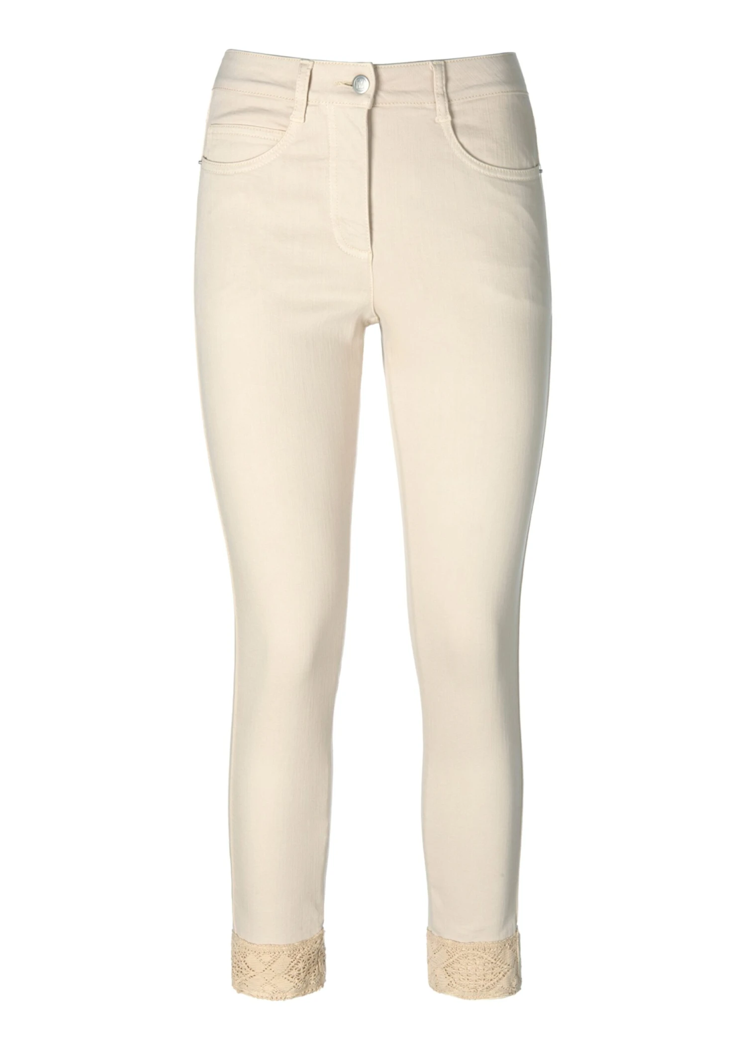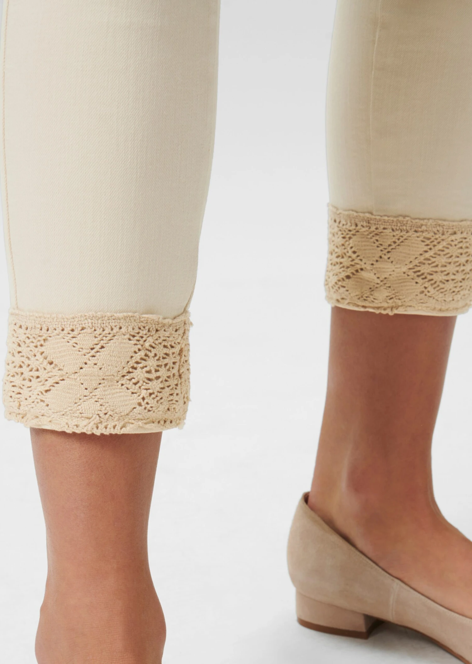 Ein schöner Effekt: Die Jeans mit Häkelspitze zieht den Blick auf den kunstvoll gestalteten Beinabschluss. Der 5-Pocket-Style in 7/8-Länge sitzt dank rückseitiger Formpasse schön knackig. Im Detail ist sie gestaltet mit Formbund, Gürtelschlaufen, Logo-Knopf, Logo-Nieten und mattsilberfarbenen Accessoires.
