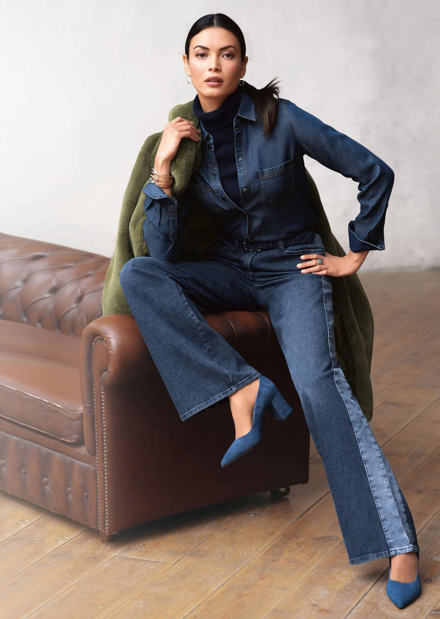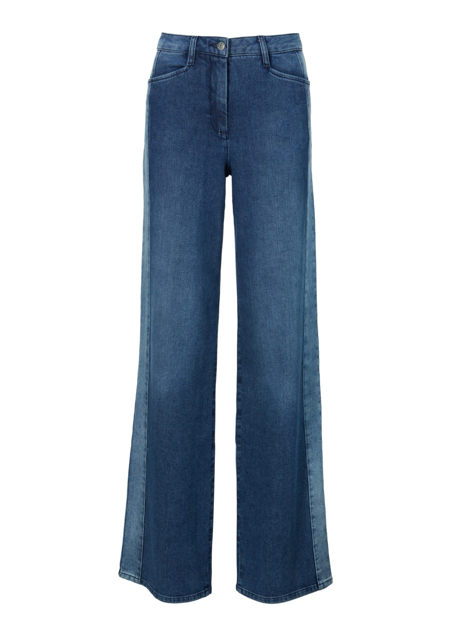 Ein super Effekt: Die Jeans mit Seitenstreifen aus hellem Denim zeichnet eine schöne, lange Beinlinie. Die markante 2-Tone-Gestaltung mit hellem Denim-Einsatz macht sie zum Eyecatcher. Der moderne Style ist in 4-Pocketform und angesagter Silhouette mit weitem Bein, Formbund, Gürtelschlaufen, L-Taschen und aufgesetzten Gesäßtaschen gestaltet. Ein M-Premium Jeanslabel und der M-Jeansknopf sind edle Label-Attribute. Durch zusätzliche Kurzgrößen können sie auch kleine Frauen prima tragen.