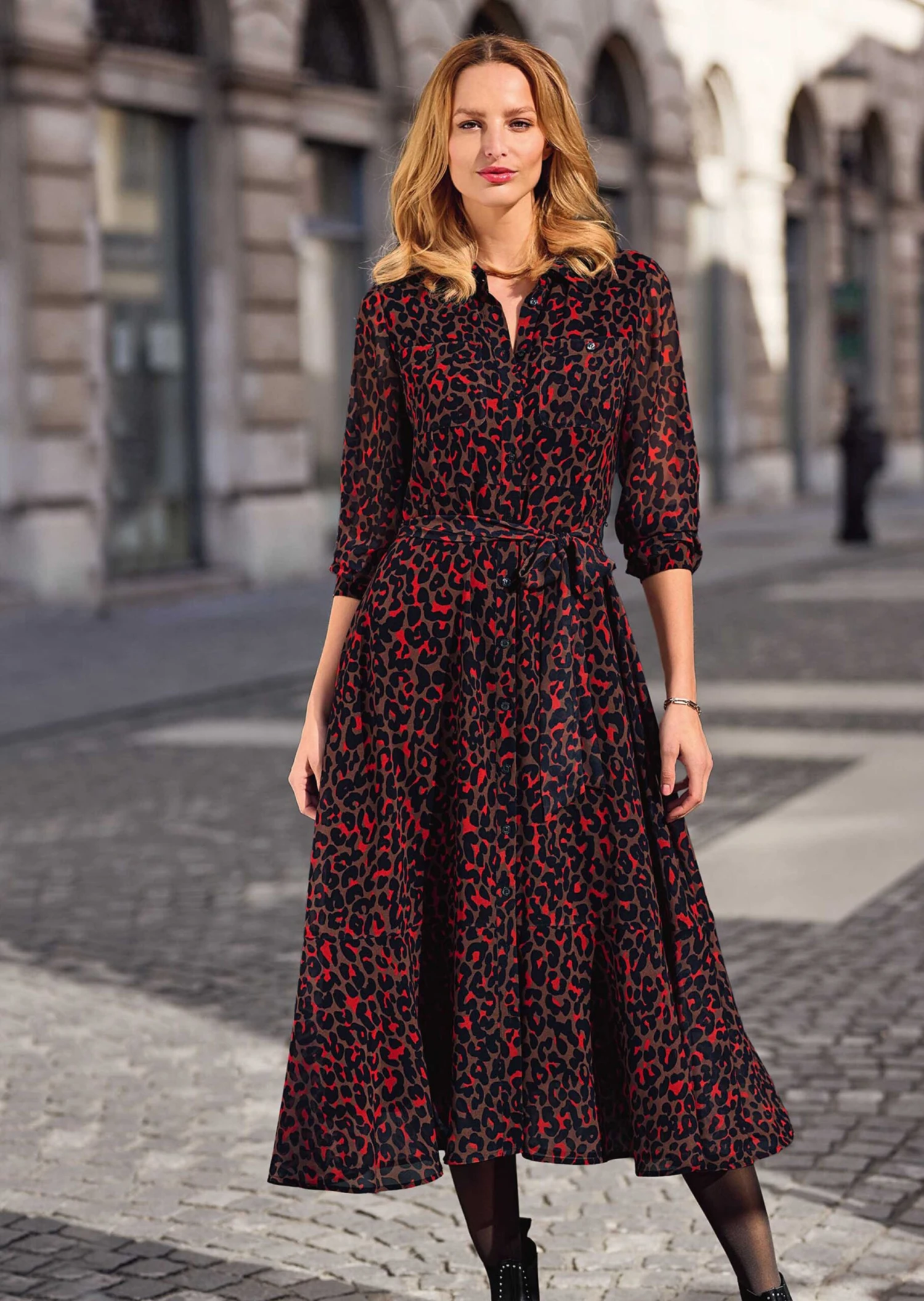 So aufregend kann das klassische Hemdblusenkleid sein! Der Unikatprint im Animaldessin verleiht den ultimativen Chic. Der Schnitt betont auf lässige Art die Figur und lässt sich variantenreich stylen – tagsüber mit Unterziehrolli casuallike, abends mit tiefem Dekolleté supersexy. Ein Must-have der Saison – weich fließend und knitterarm mit Hemdkragen, durchgehender Knopfleiste, Brusttaschen, Ärmelmanschetten und Bindeband.