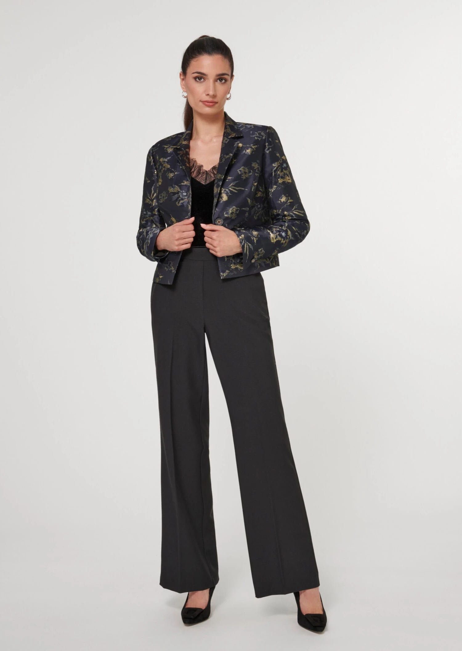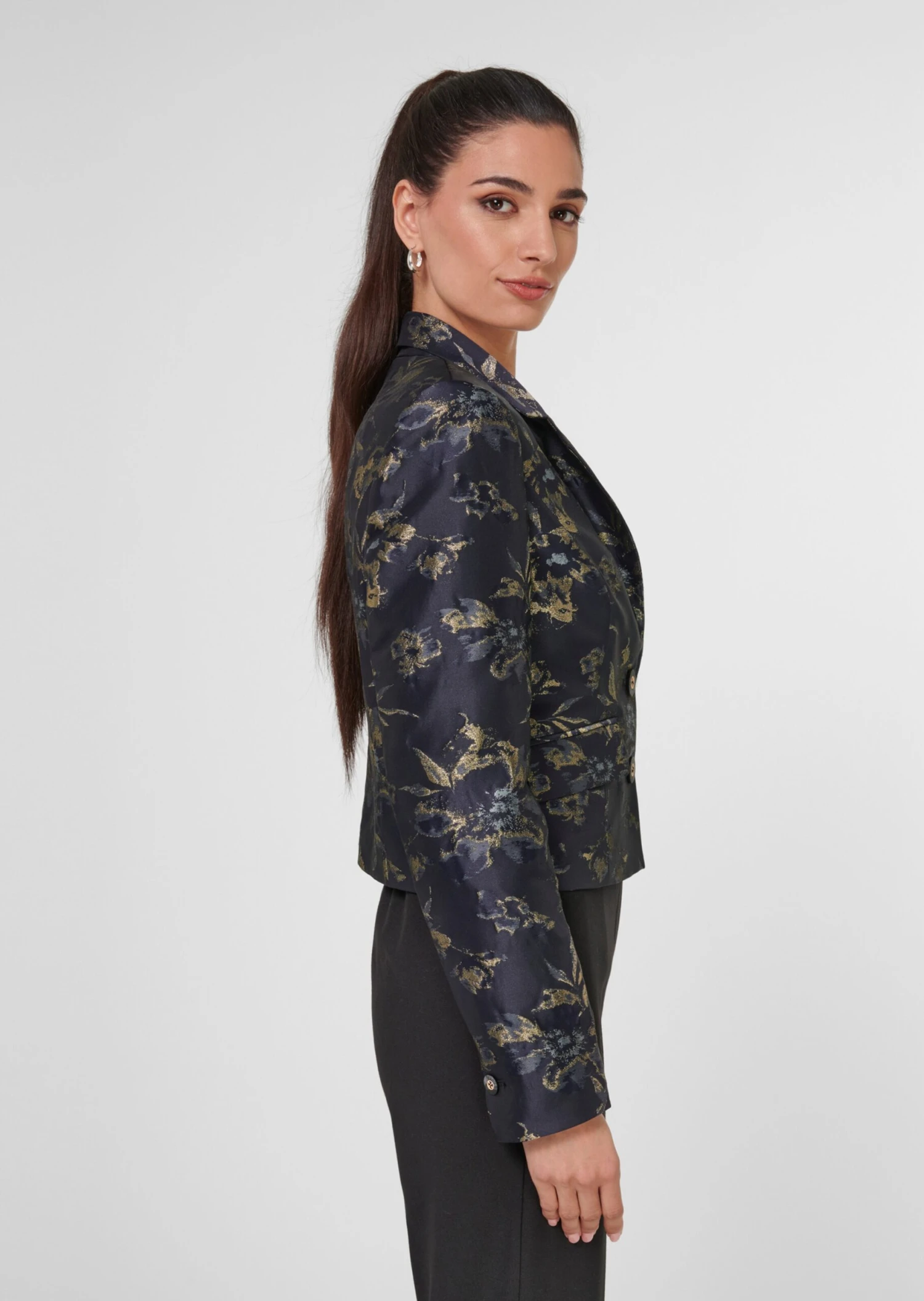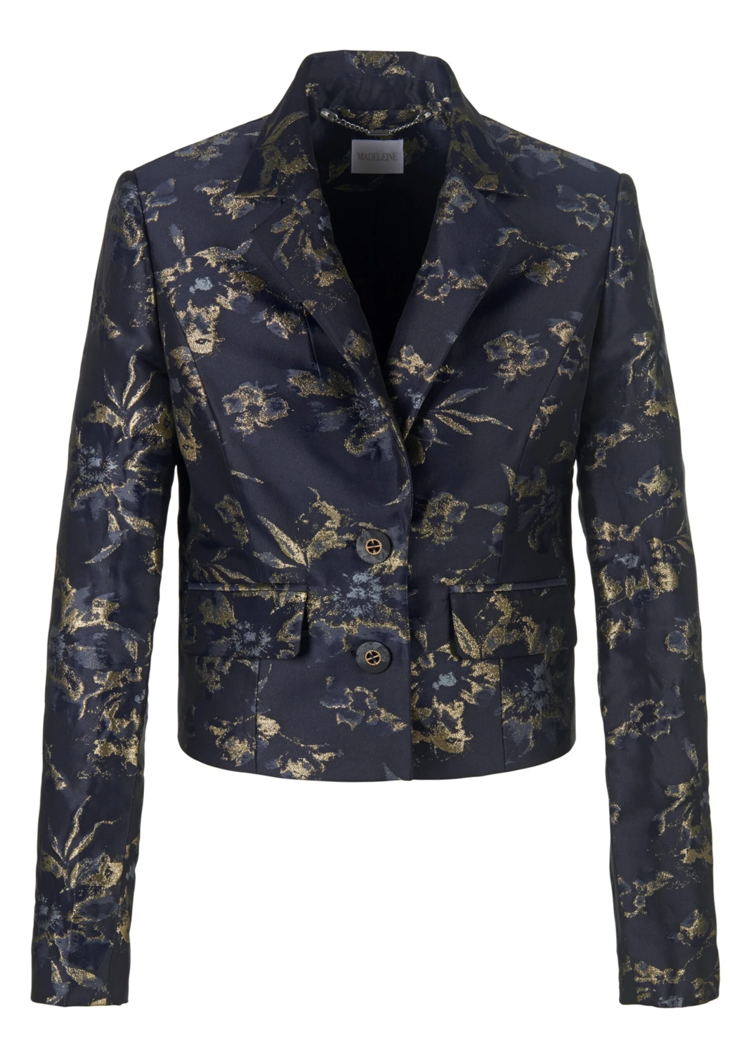 Dieser taillenkurze Blazer wirkt besonders stylisch und sendet trendstarke Signale. Sein wertvoll gemusterter Jacquard bringt eine Extraportion Luxus ins Spiel und garantiert glanzvolle Auftritte. Der angesagte Style ist auf zwei Knöpfe zu schließen und an den Schultern leicht gepolstert. Reverskragen, paspelierte Pattentaschen und geknöpfte Ärmelschlitze runden den Look ab.