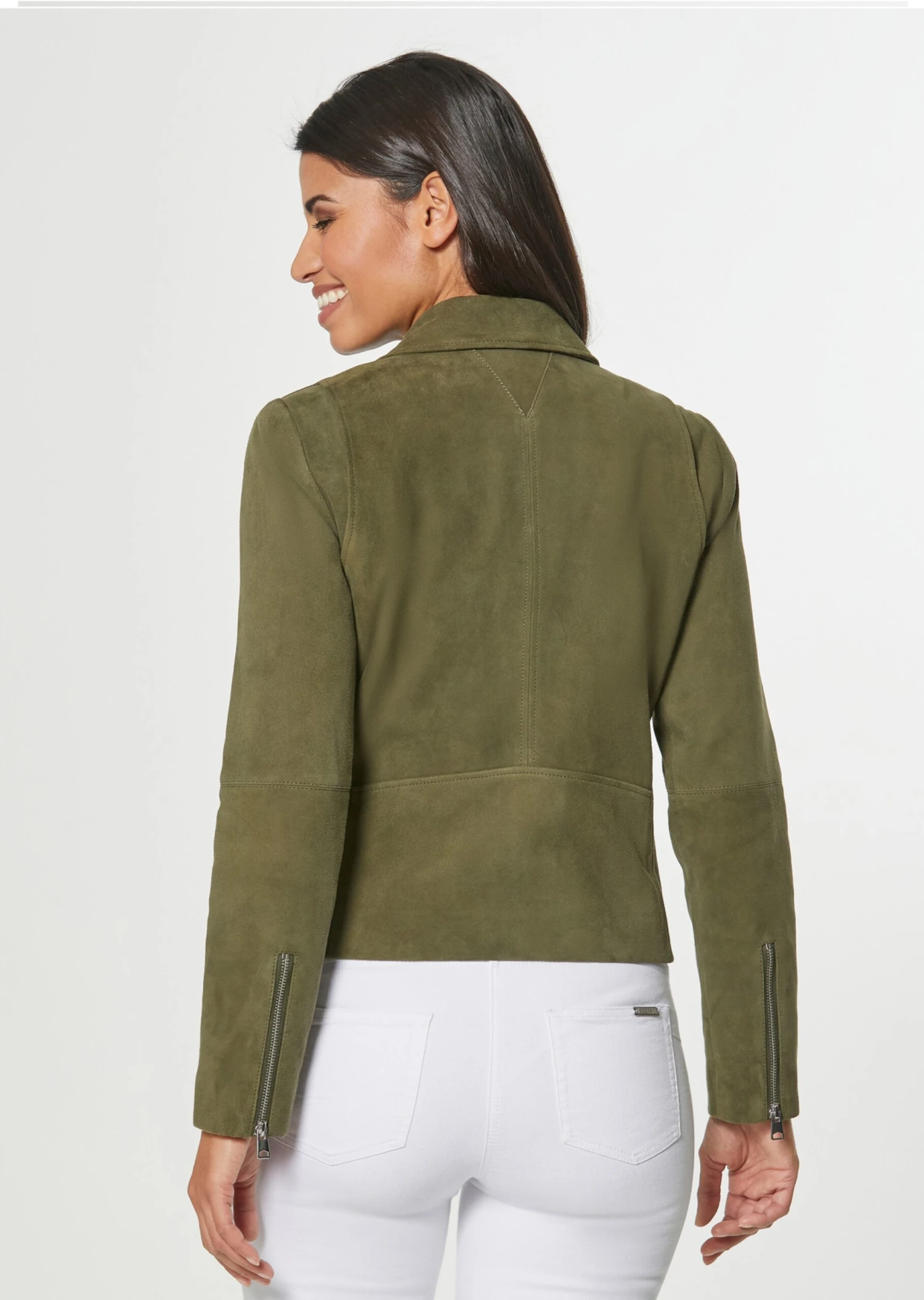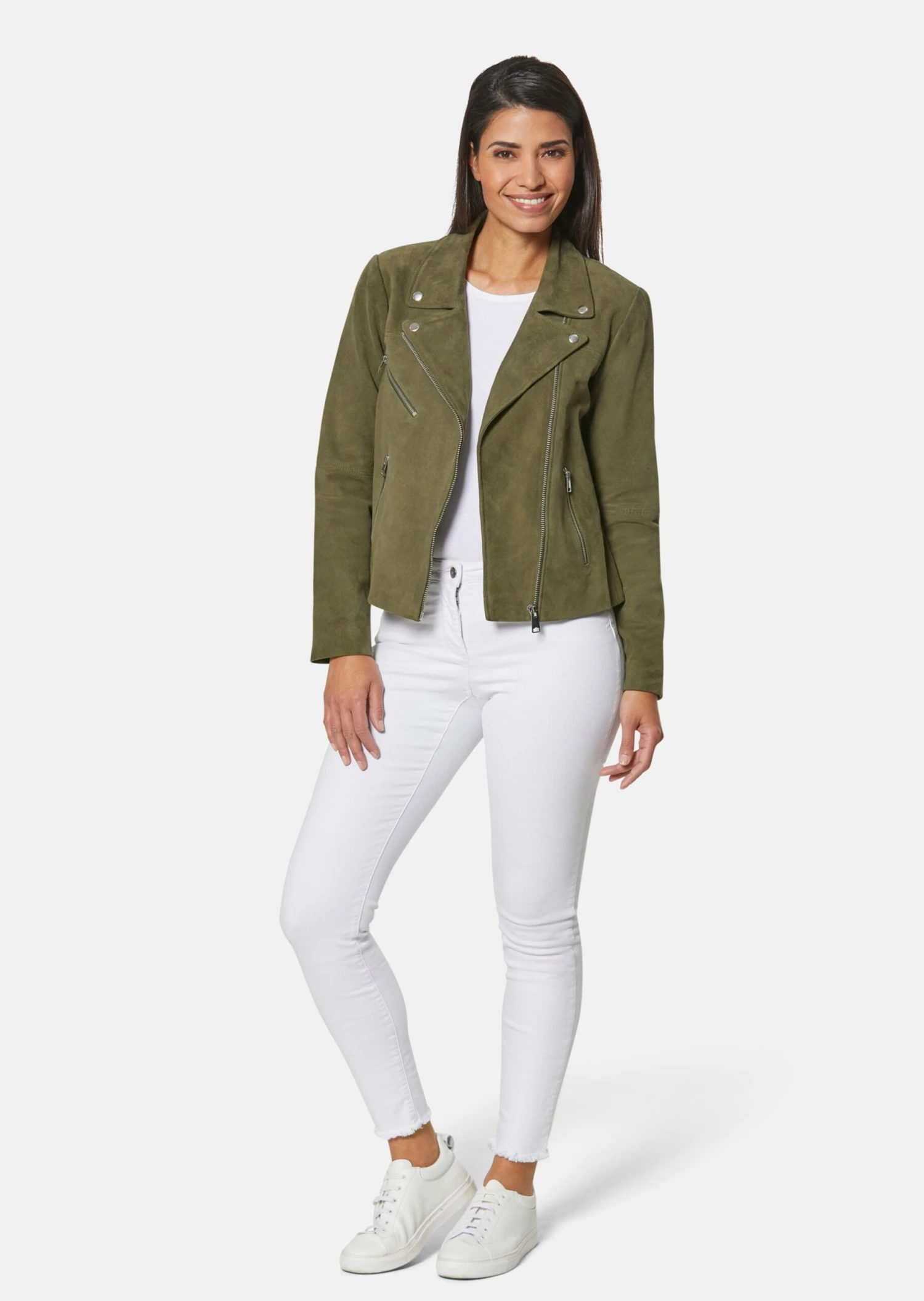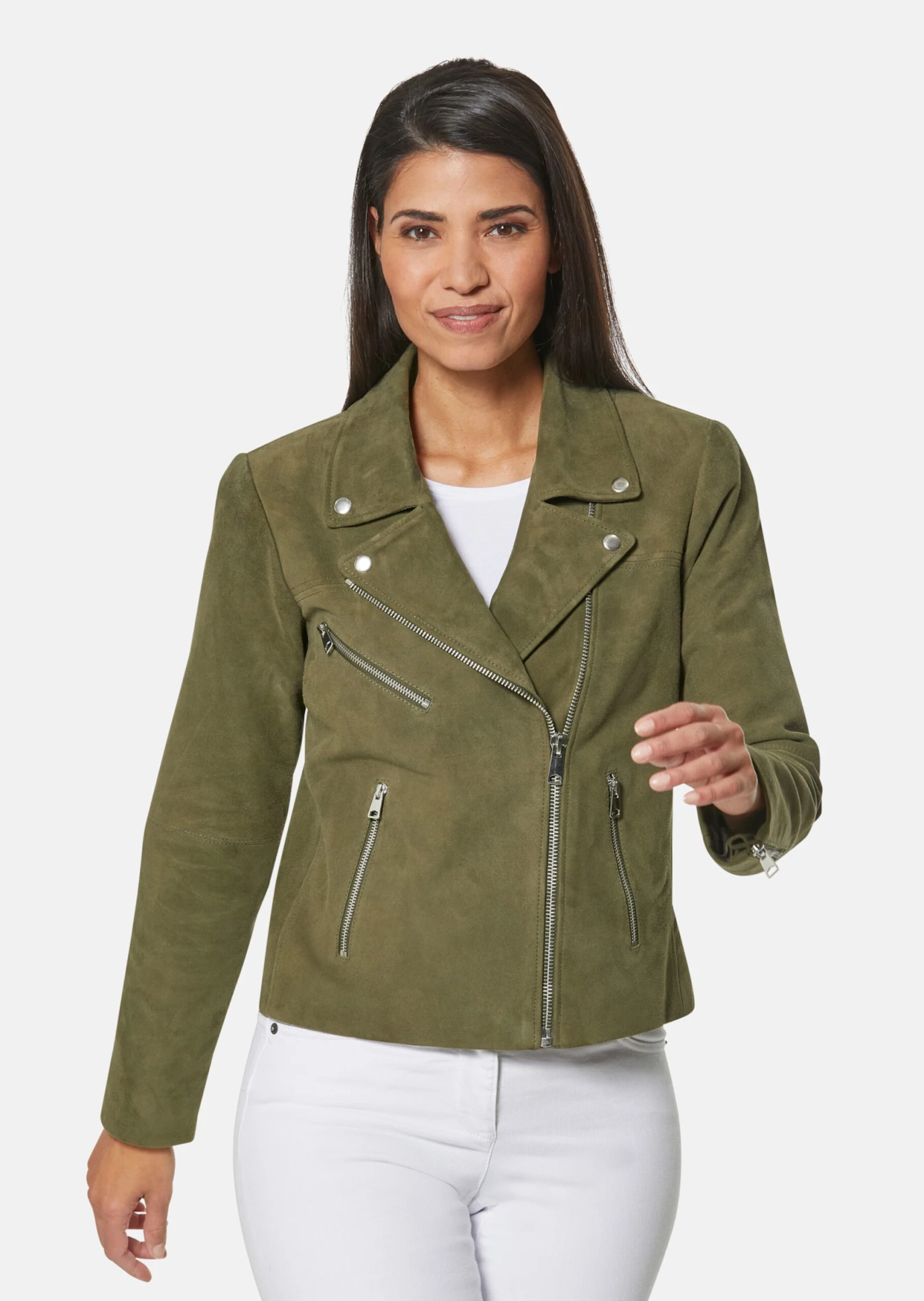Ein Lieblingsstück, das Ihren Look mit Coolness und Exklusivität ergänzt. Lammnappa gehört zu den wertvollsten Leder-Qualitäten und begeistert mit edlem Glanzfinish, softem Griff und leichtem Tragegefühl. Feminin tailliert und typisch verarbeitet im Biker-Stil zeigt sich die Jacke mit asymmetrischem Vorderzipper, Reverskragen mit Druckknöpfen, Zipper-Brusttasche, Zippertaschen und Zipper am Ärmelsaum. Dezente Schulterpolster und das tonige Innenfutter runden das hochwertige Bild ab.