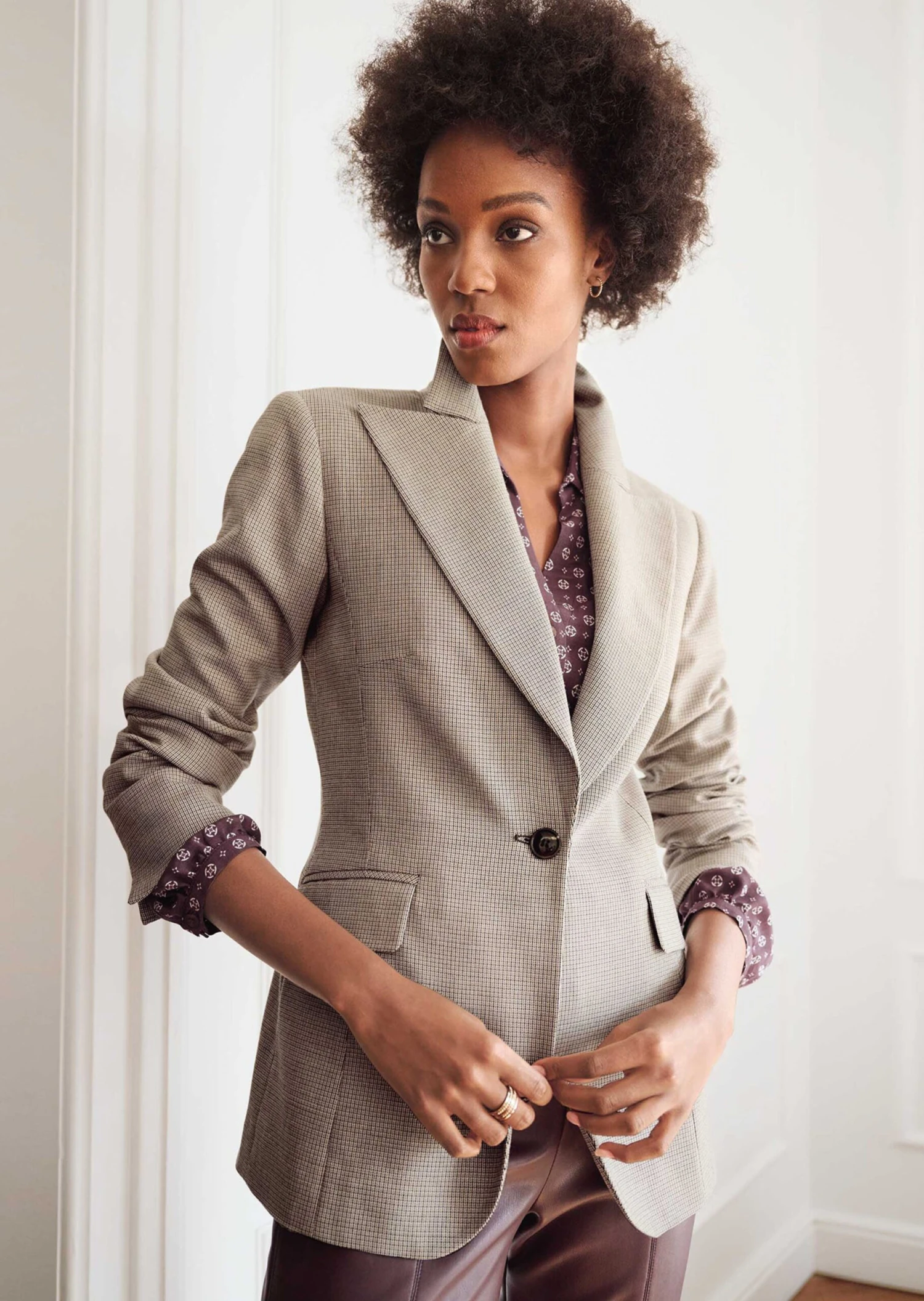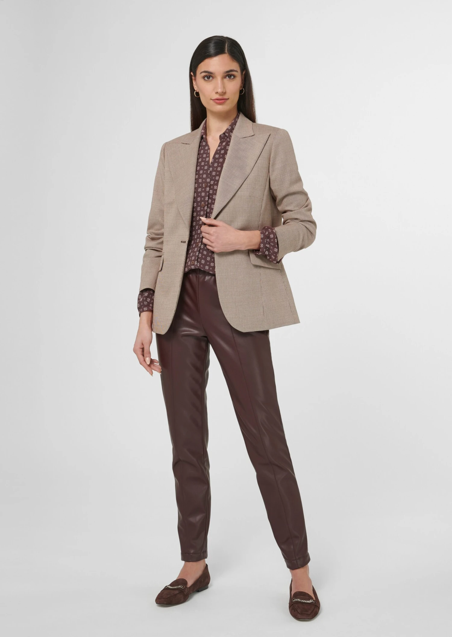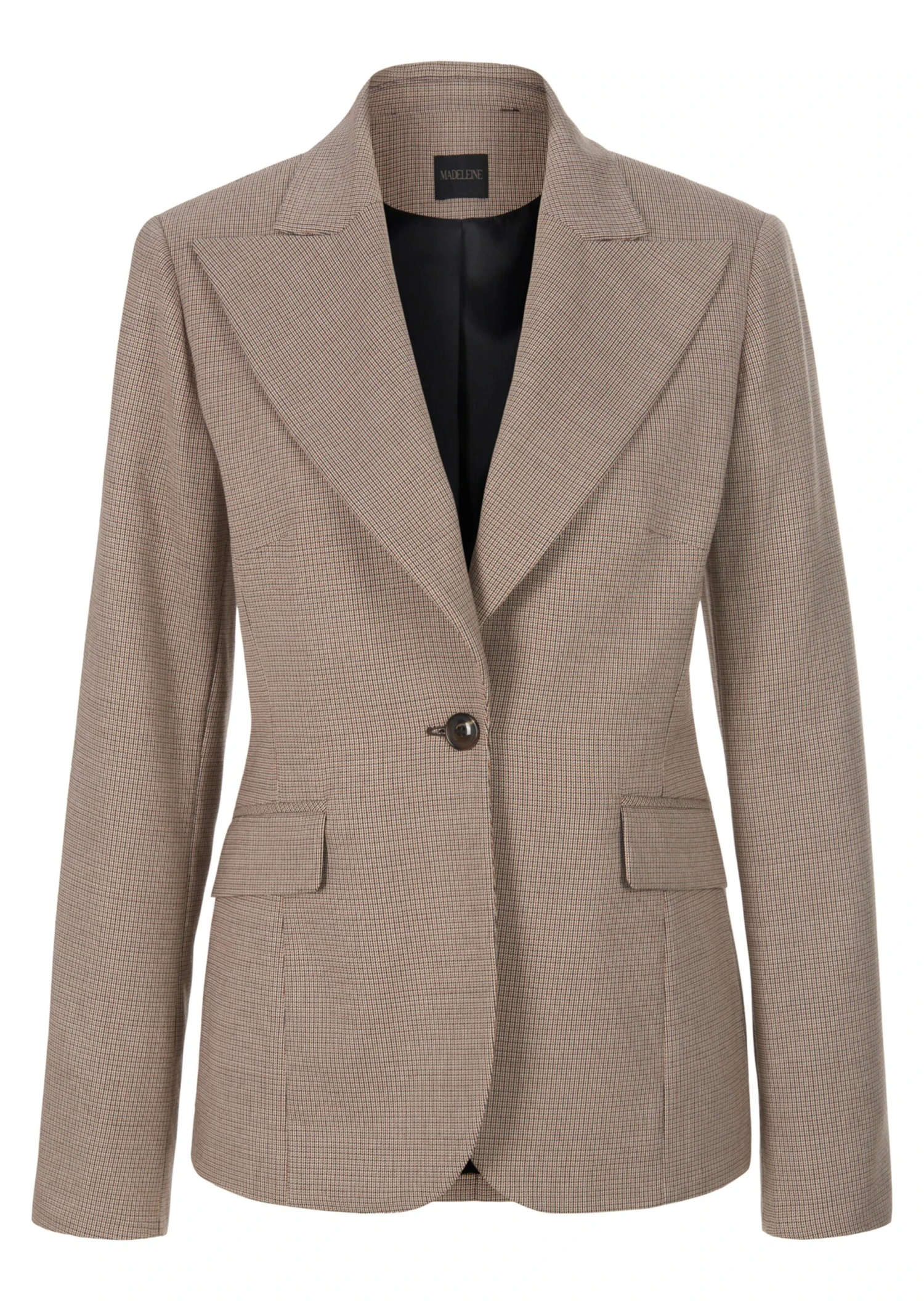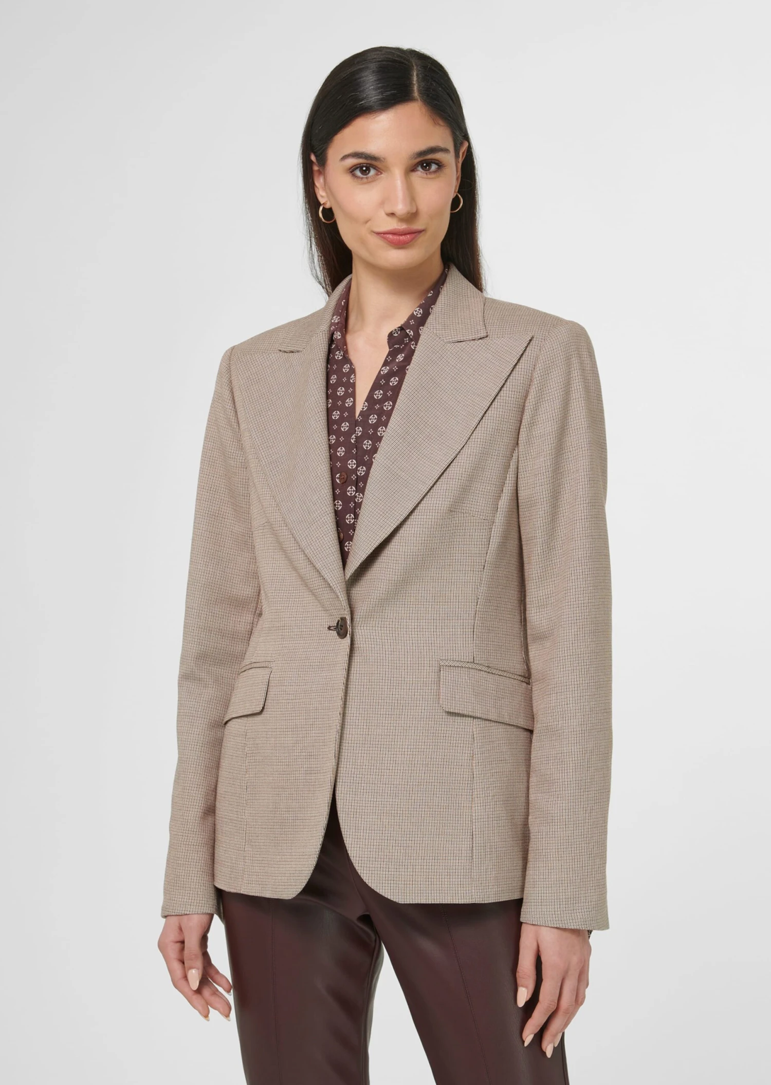 Der aus einer edlen italienischen Material-Komposition gefertigte Blazer ist in figurbetonter Form geschnitten. Er ist leicht tailliert, hat einen klassischen Kragen und ein modisch breites Revers und wird auf einen Knopf geschlossen. Paspelierte Pattentaschen und der gerundete Saumabschluss akzentuieren den Look. Die langen Ärmel sind sehr schick mit Schlitzen und breitem Innenbeleg zum Aufschlagen gearbeitet.