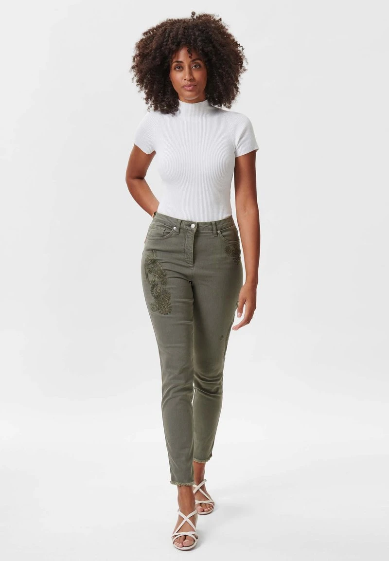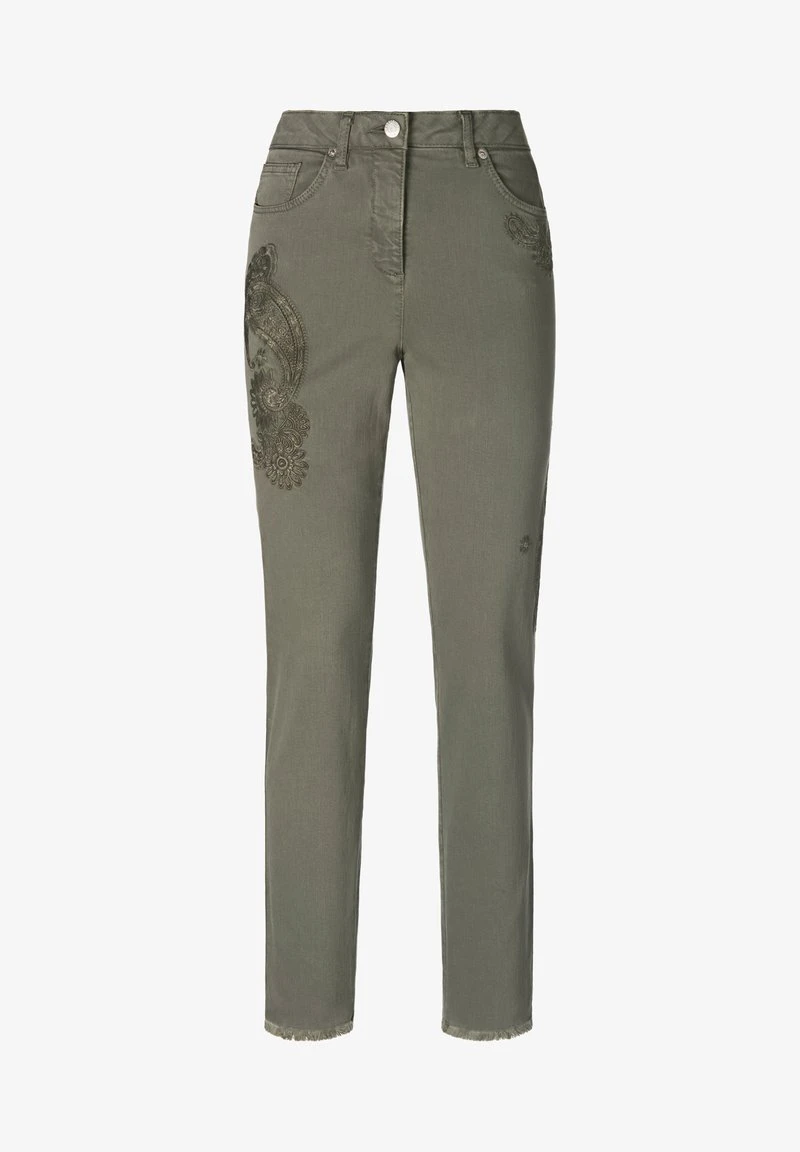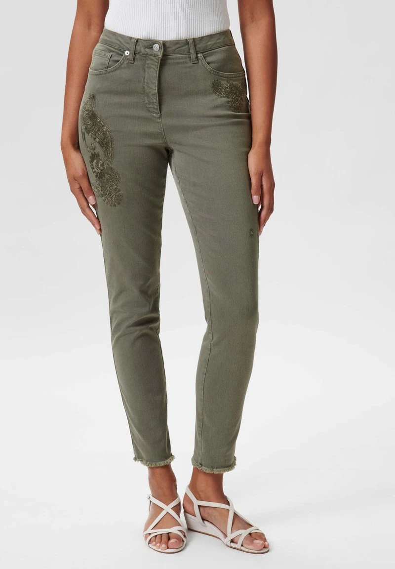 MIT PAISLEY STICKEREI UND FRANSENSAUM – Jeans Slim Fit – Bambusgrün