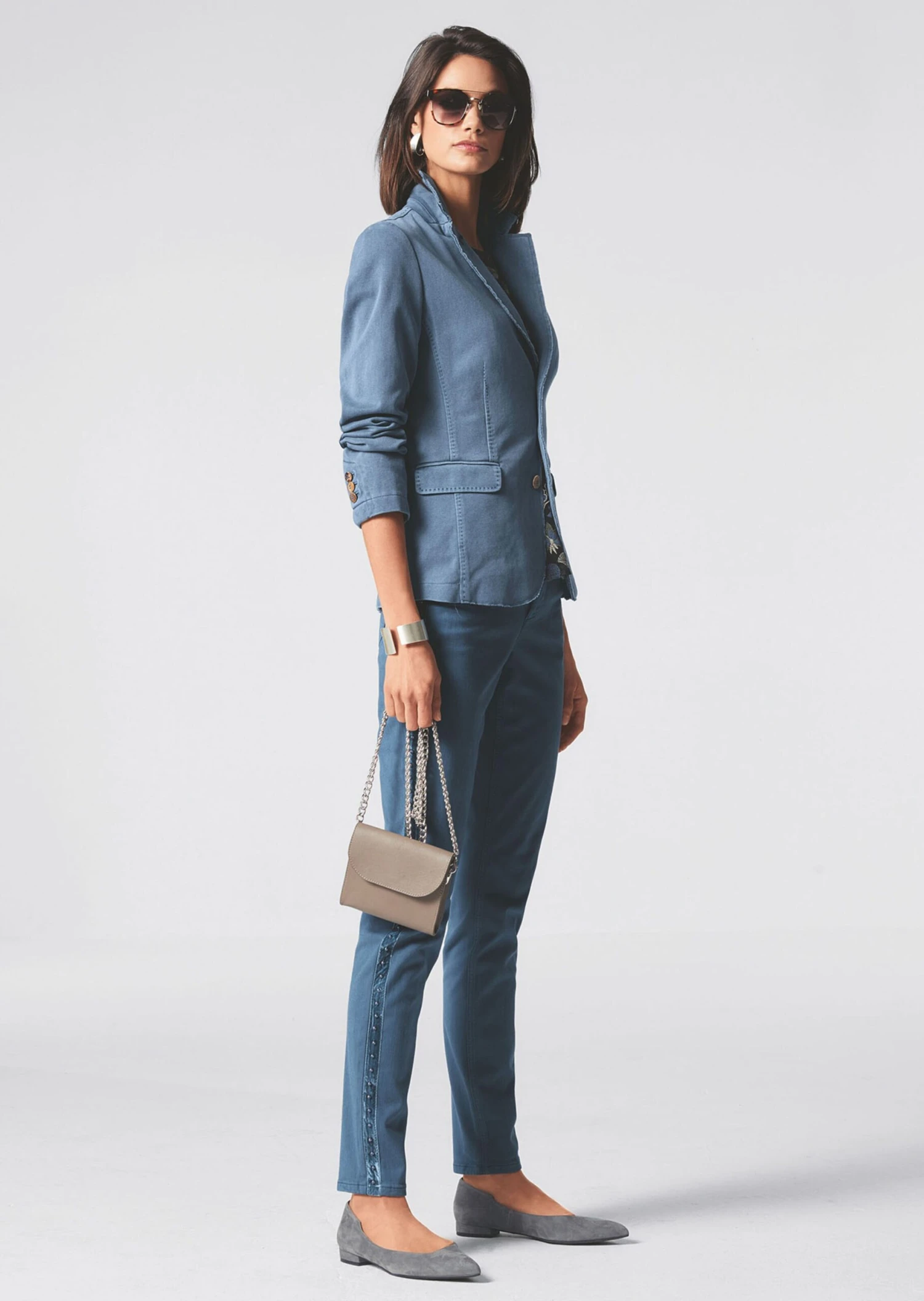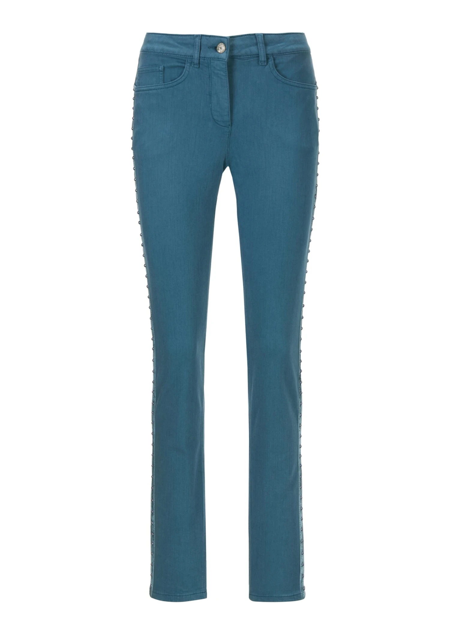 Die Push-up-Jeans ist eine raffinierte Figurkünstlerin! Die Nahtführung zaubert optisch eine wohl geformte Po-Partie, lässt kleine Problemzonen verschwinden und optimiert die Figur. Die Stretch-Ware unterstützt den exzellenten Sitz. Das edle Samtband mit aufgenähten Zierperlen setzt entlang der Seitennaht einen zusätzlichen Akzent. Im 5-Pocketstyle zeigt sie sich mit Formbund, Logoknopf, 5 Gürtelschlaufen und runder Passe an der Hinterhose. Die Accessoires in Antiksilber runden den Look ab. Kombinieren Sie die Hose zu tonigen oder weißen Oberteilen für einen frischen Look.