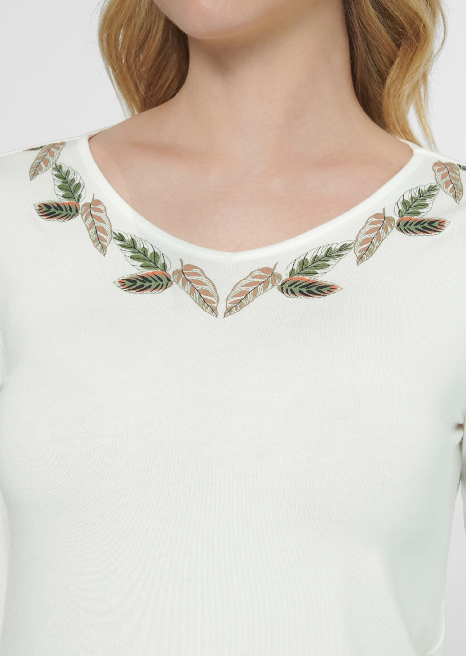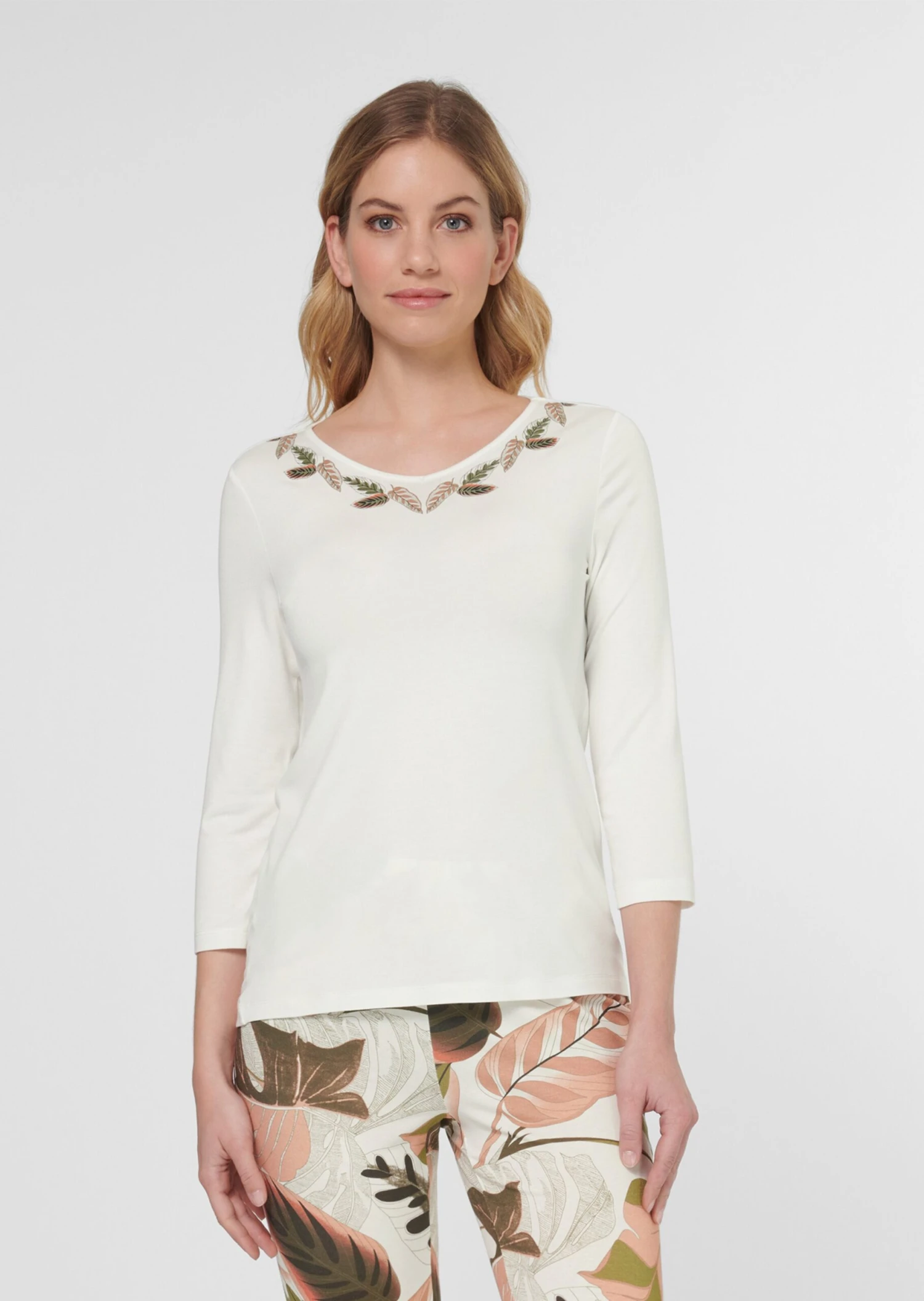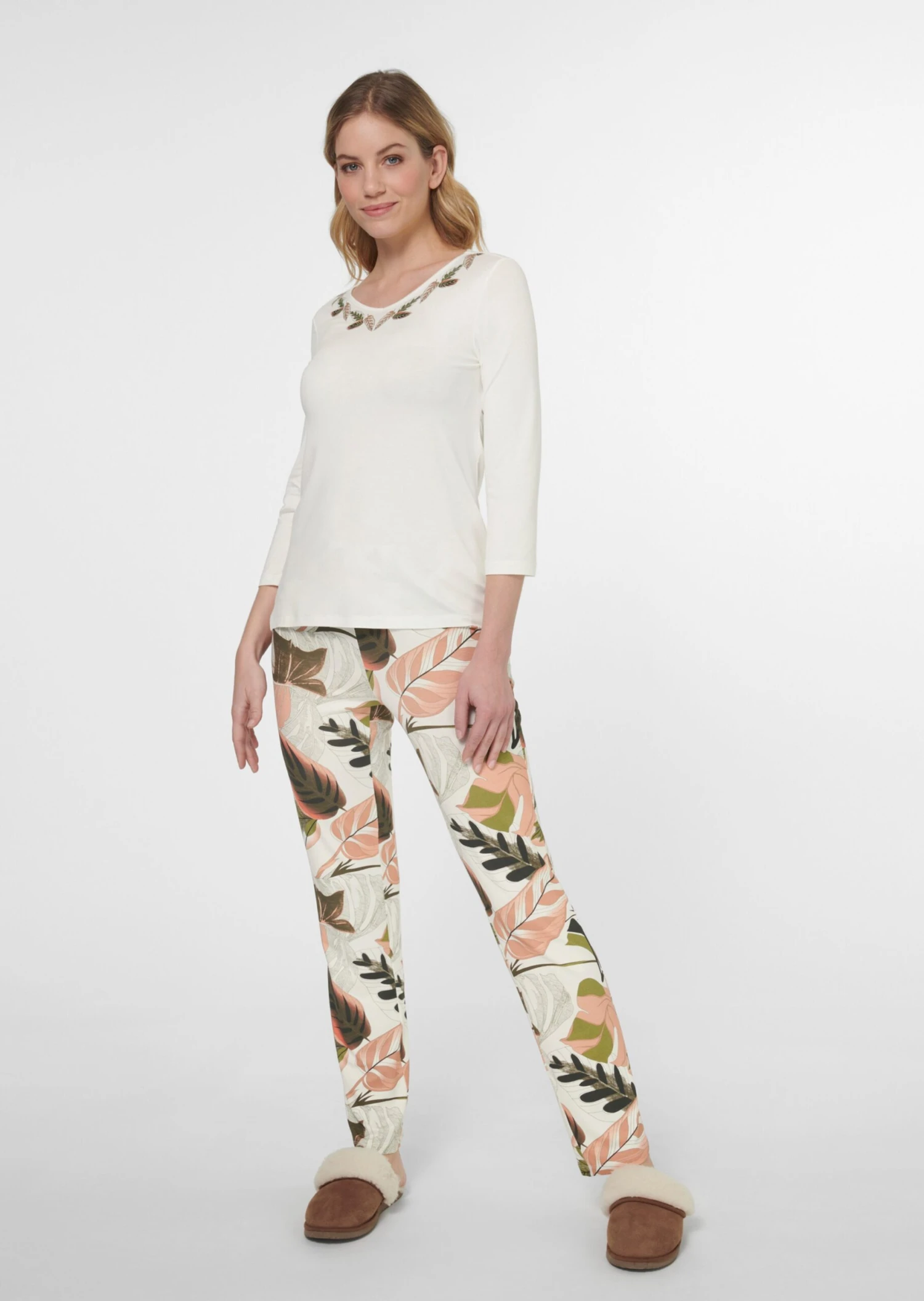 Modischen Chic und viel Verwöhn-Komfort bietet dieser edle Pyjama aus softem Viskosestretch. Das Oberteil ist mit Ärmeln in 3/4-Länge und platziertem Blätterdruck am V-Ausschnitt gestaltet. Die gerade geschnittene Hose setzt das Dessin als auffällig schönen Unikatprint in Szene. Ein Elastikbund sorgt für bequemen Sitz. Ein Nachtwäsche-Modell, das keine Wünsche offen lässt!