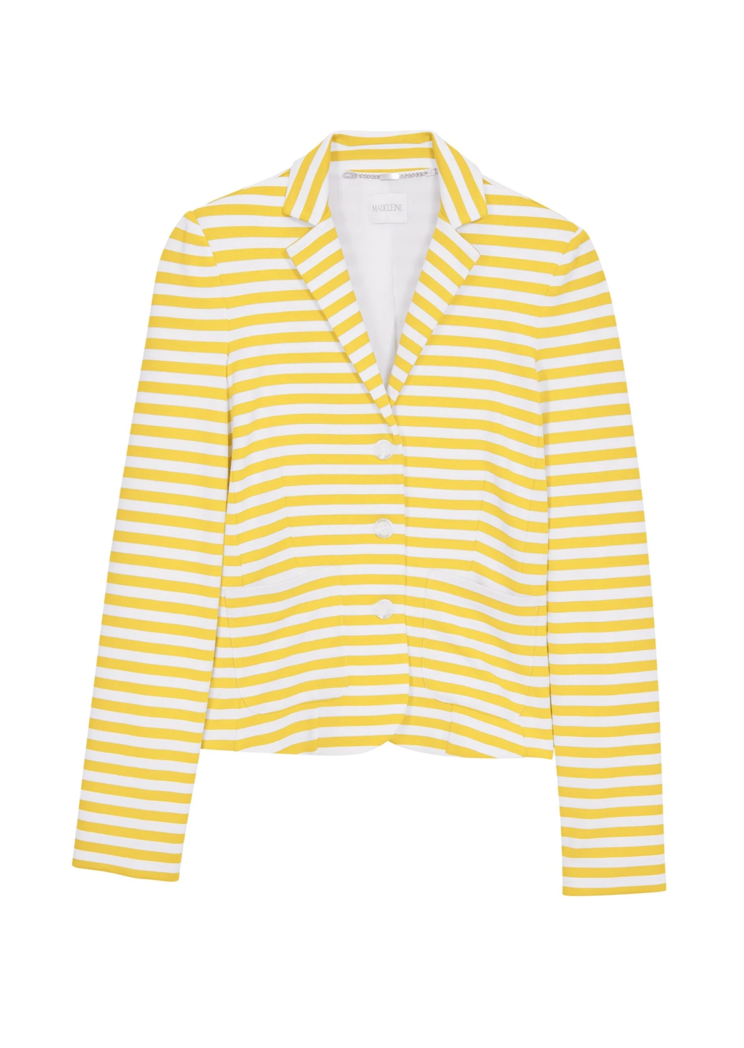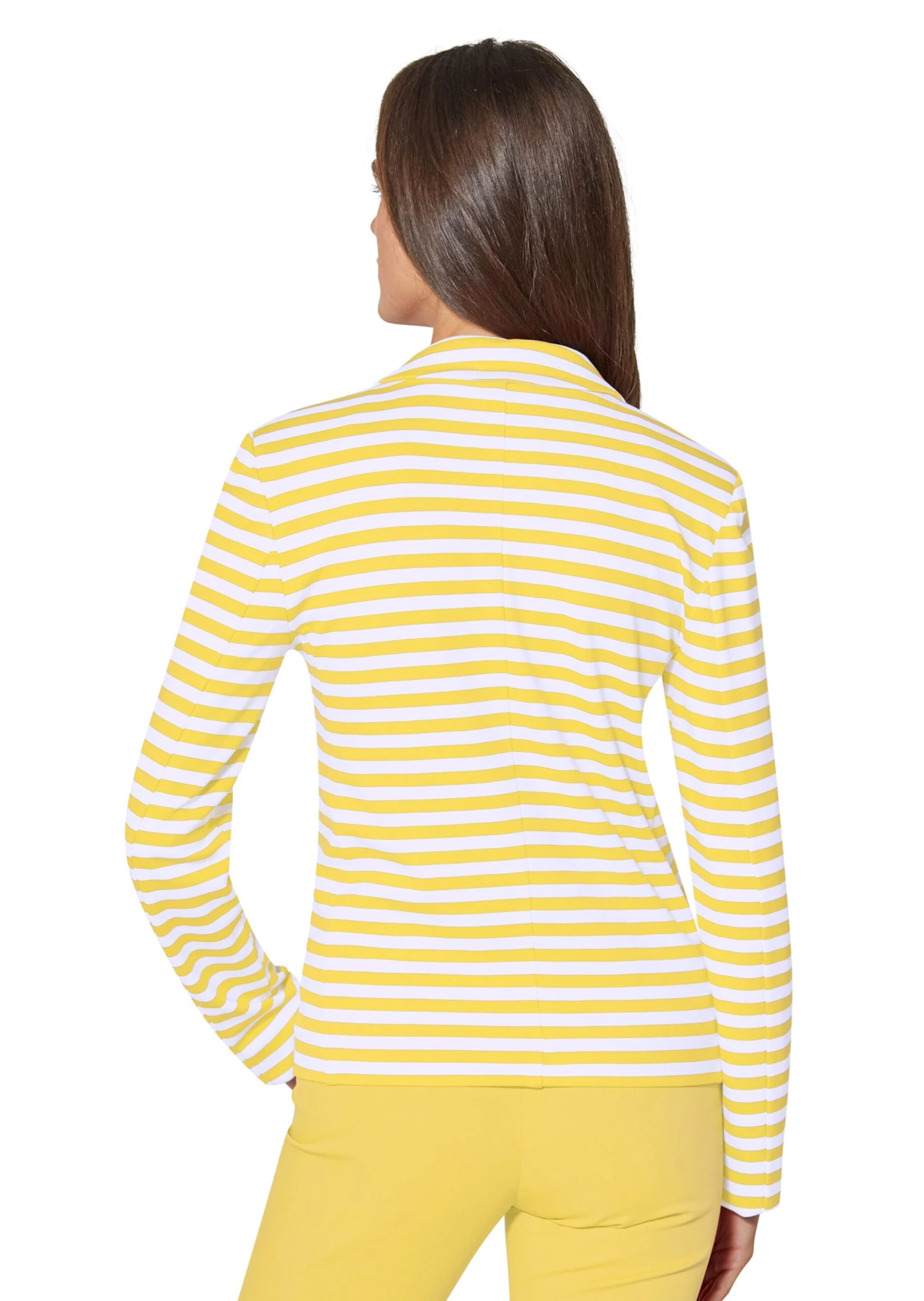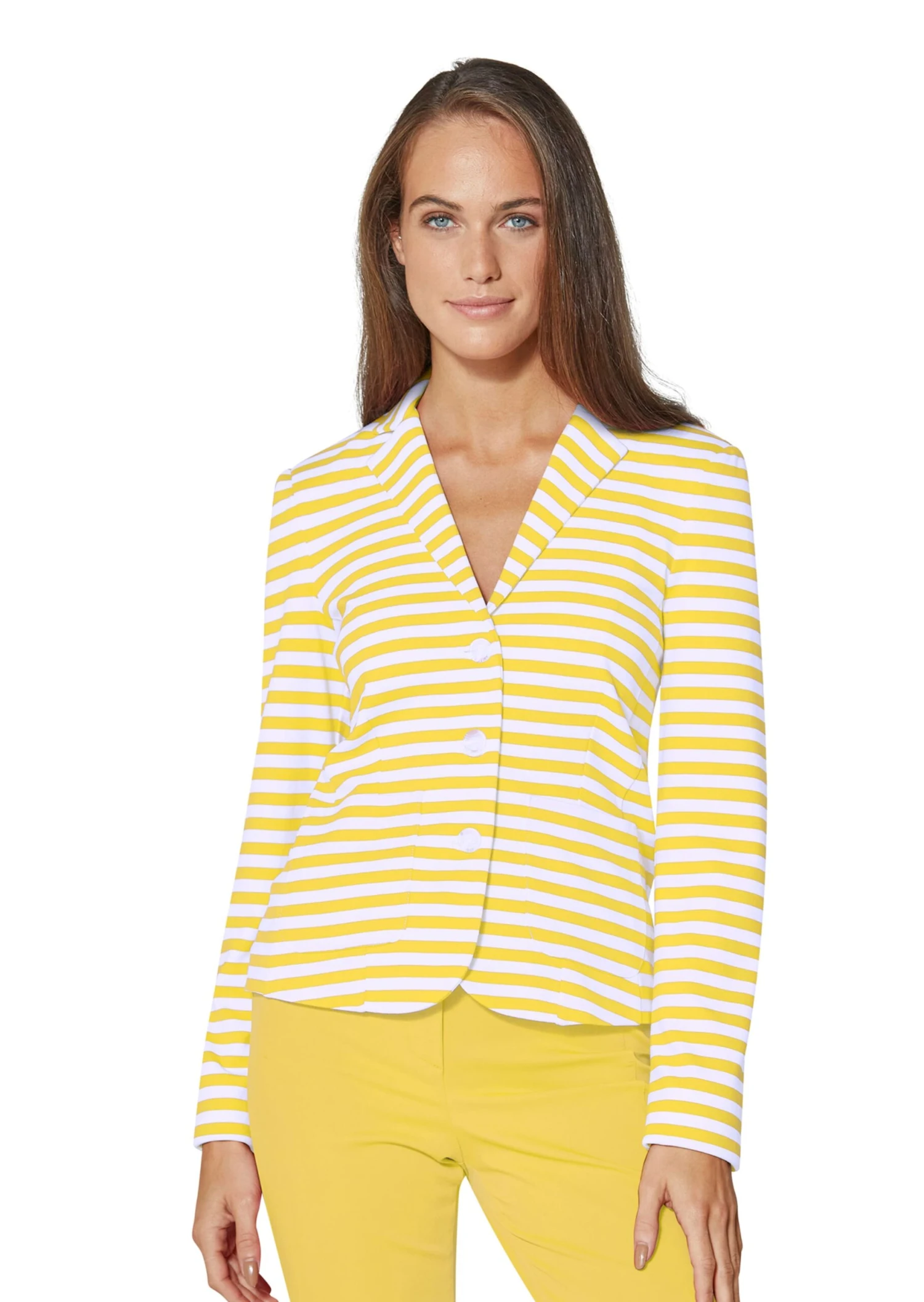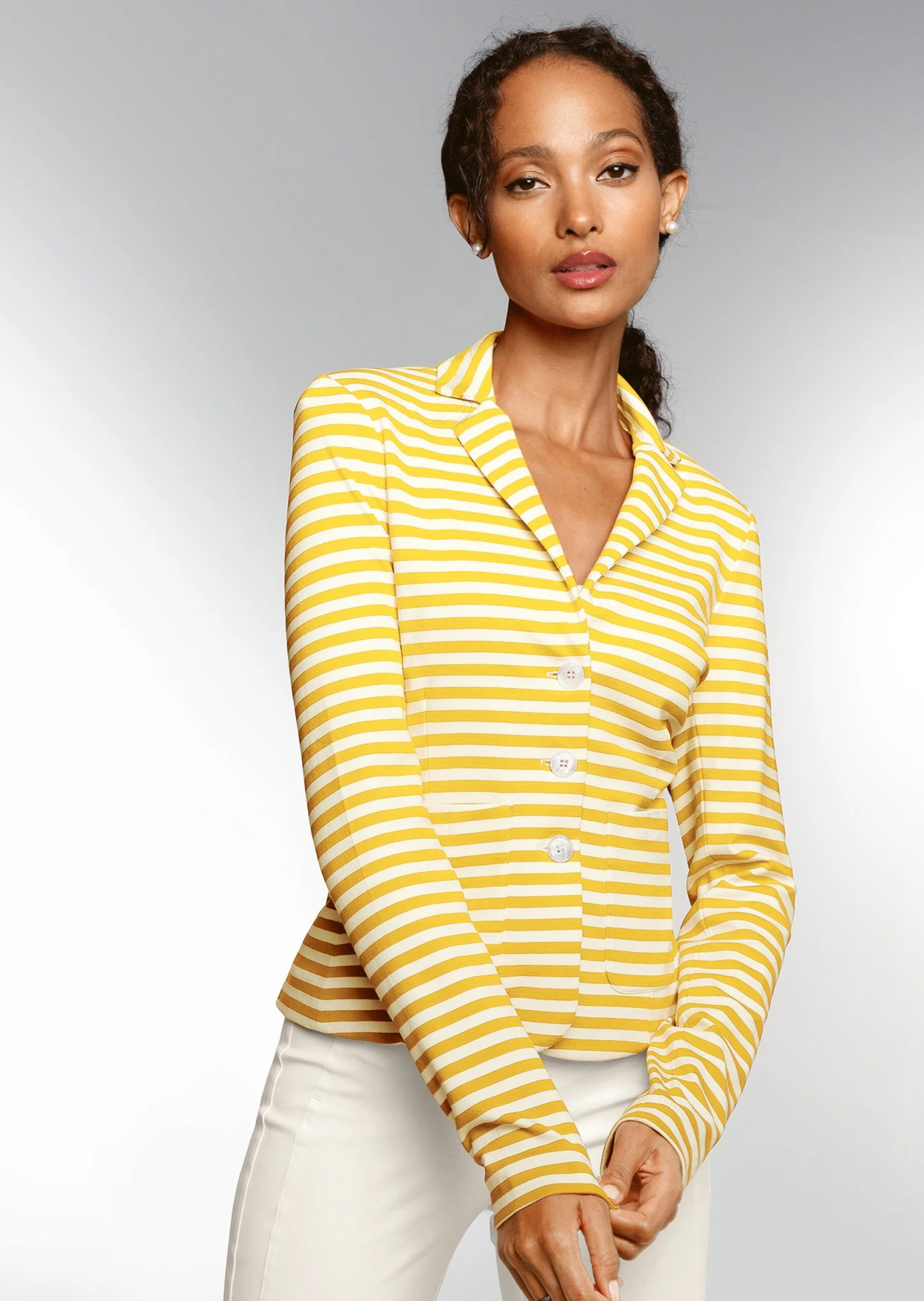 Nicht nur für maritime Stylings ein absolutes Muss! Der Ringelblazer aus formbeständigem Jersey trägt sich herrlich angenehm. Durch seinen zeitlos modernen Stil bietet er sich für unzählige Anlässe an. Der schlanke, leicht taillierte Style ist mit Kragen, Revers, aufgesetzten Taschen, Kettenaufhänger, hellen Knöpfen und angenehmem Jersey-Futter gestaltet. Kombinieren Sie ihn zu wollweißen Partnern für einen frischen, selbstverständlichen Look mit stilvoller Aussage.