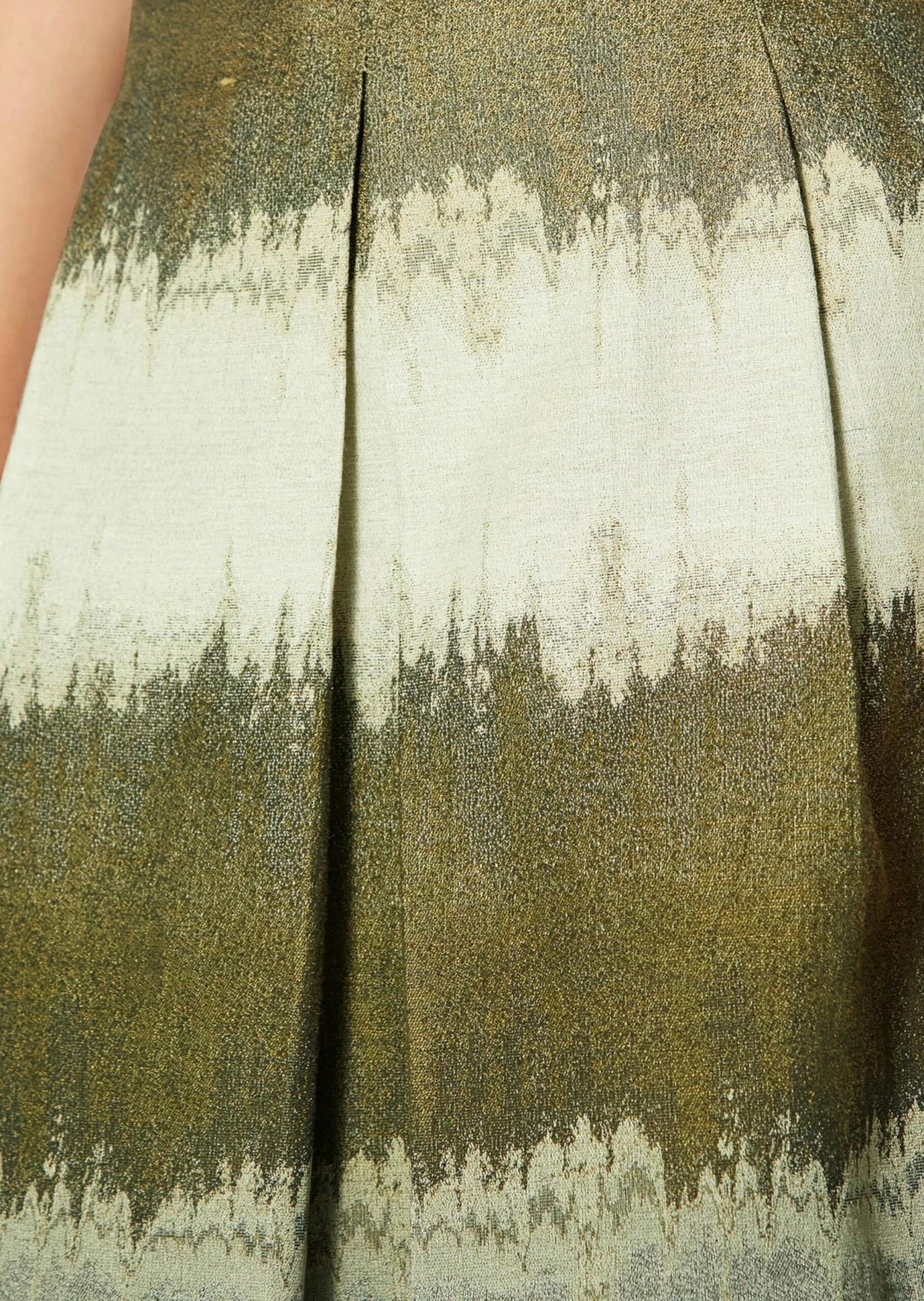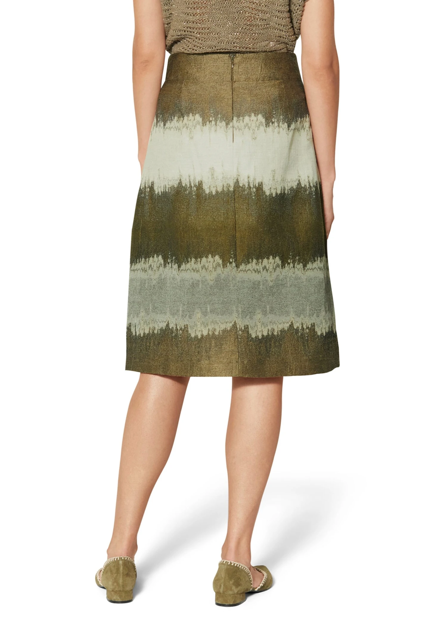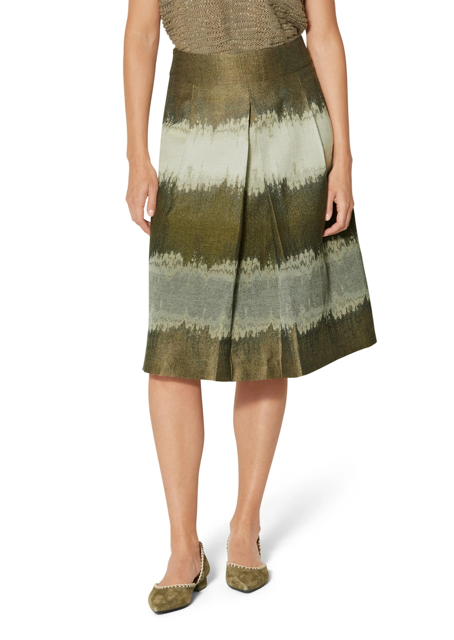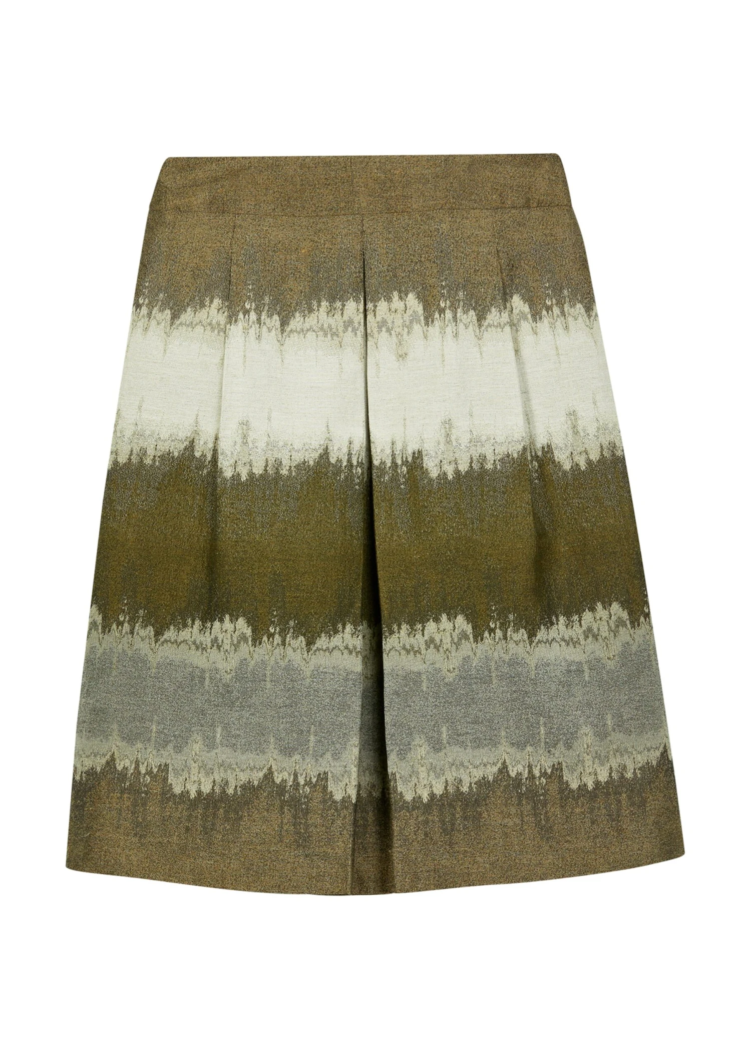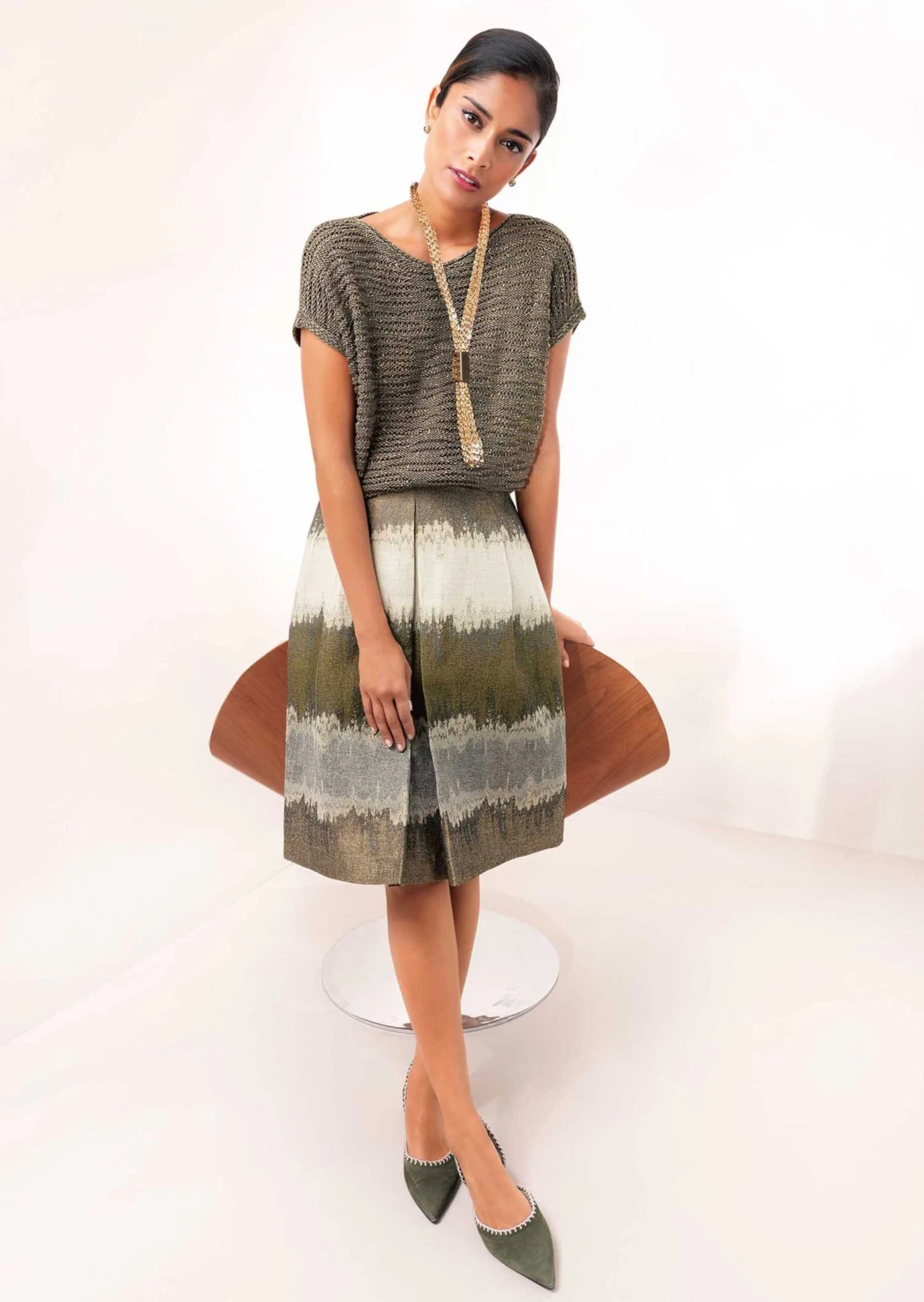 Ein eleganter Rock, der zu den unterschiedlichsten Anlässen die Blicke auf sich zieht. Der ausgestellte Jacquardrock wirkt durch die harmonischen Töne so edel und wertvoll. Wir haben ihn für einen modernen Look als feminin ausgestellten Faltenrock mit Formbund, Innenbundsicherung, rückseitigem Nahtzipper und aufspringender Kellerfalte im Vorderteil gestaltet. Dank seiner Farbgebung können Sie ihn gut zu natürlichen Tönen kombinieren.