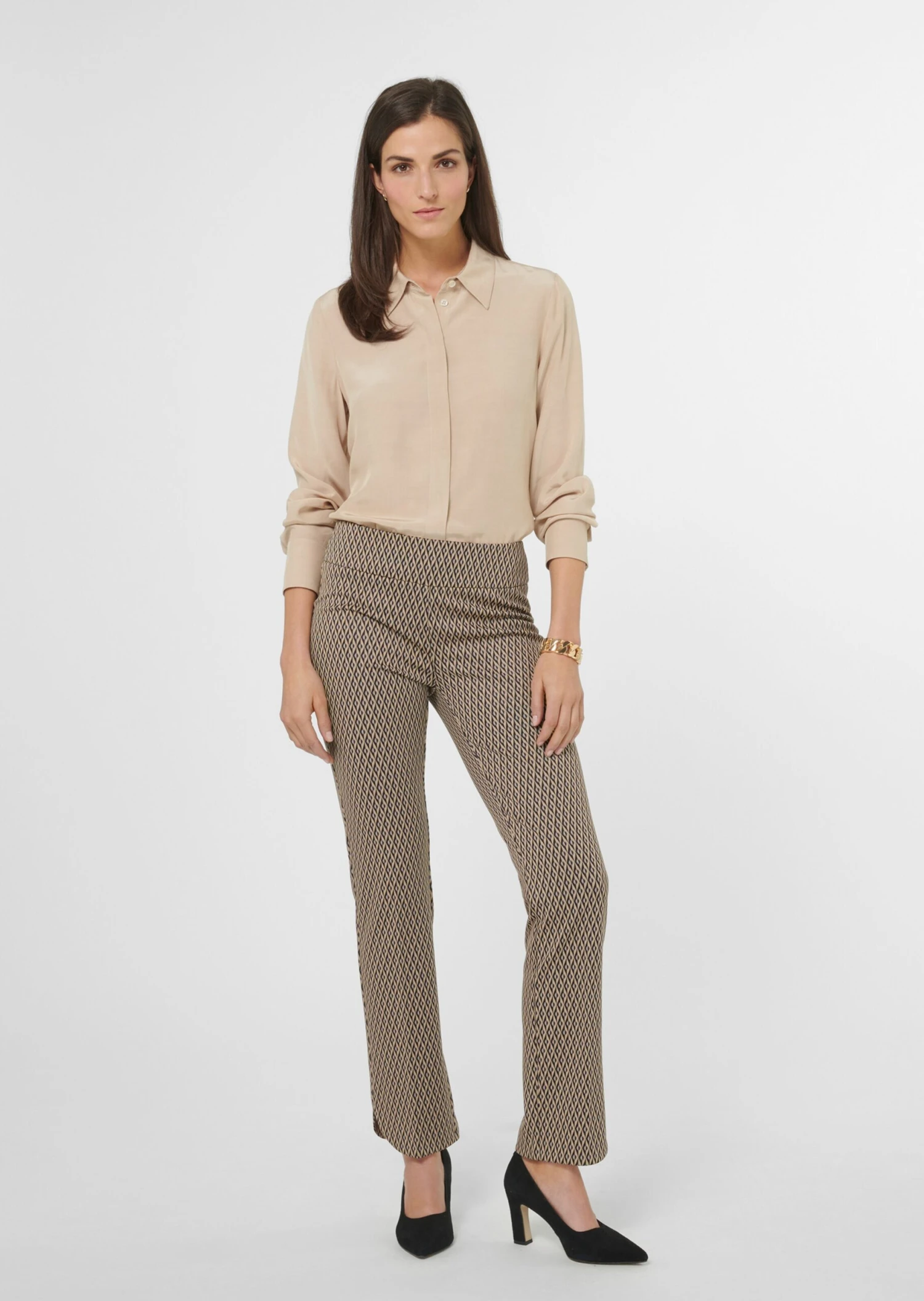 Wenn Sie eine edle Hose mit viel Komfort suchen, liegen Sie hier goldrichtig! Ihre edle Jacquard-Qualität glänzt mit hohem, modischem Anspruch und ist dank Stretch-Anteil super komfortabel. Die gerade Form wirkt durch Bügelfalten sehr gepflegt und ist am gerundeten Beinsaum leicht geschlitzt. Der breite Dehnbund schmiegt sich sanft um die Hüfte und ist bequem zum Schlüpfen.