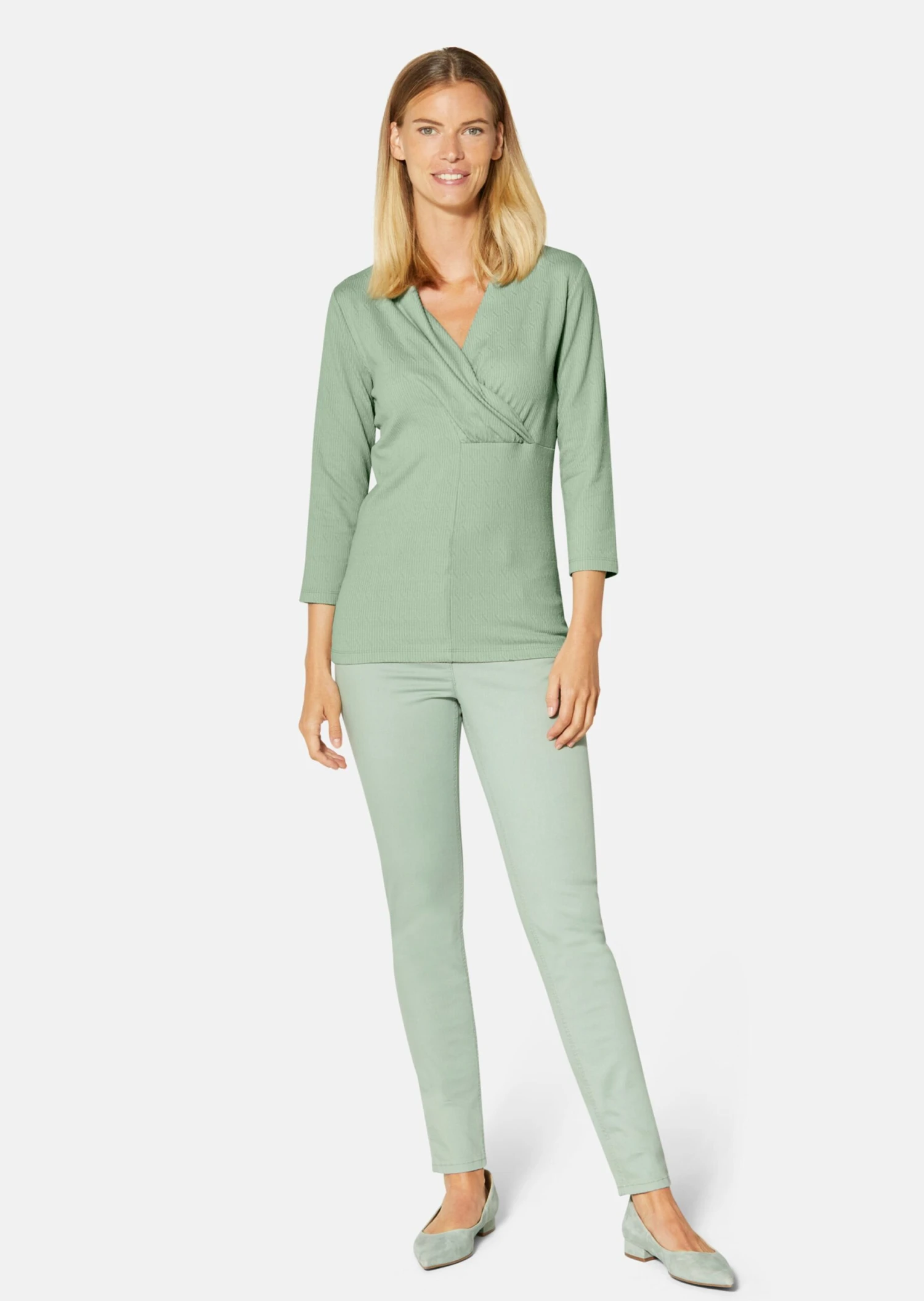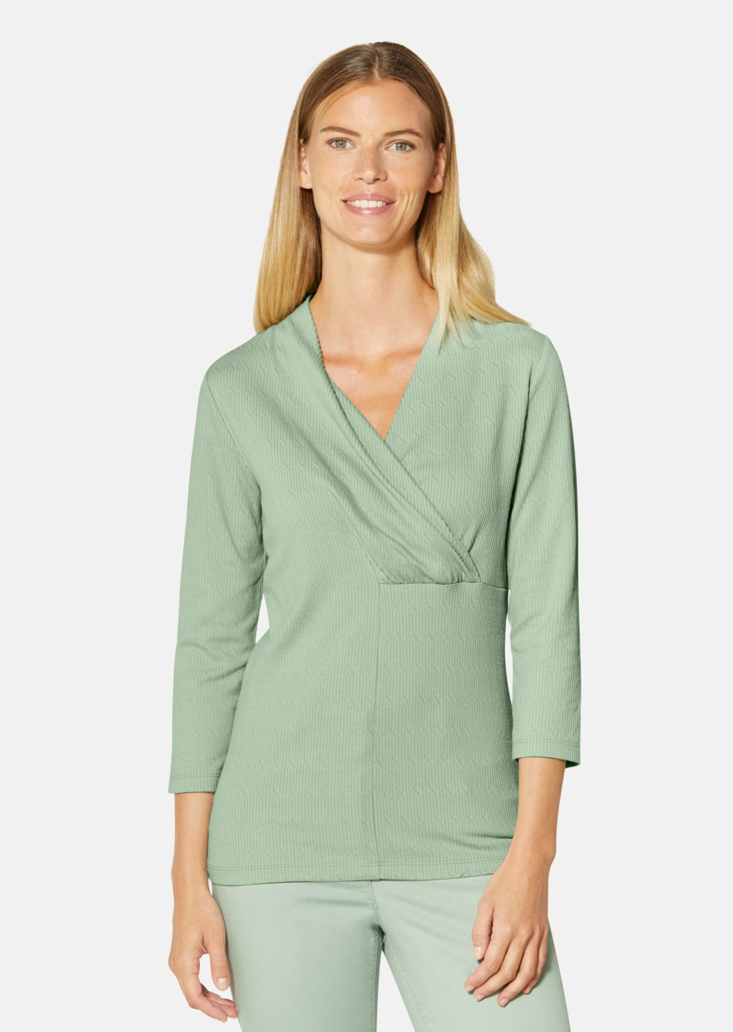 Verleihen Sie Ihrem Look eine Prise lässigen Chic und überraschen mit optischen Effekten. Dieses Shirt ist für jeden Anlass geeignet und kann saisonunabhängig getragen werden. Der bequeme Struktur-Jersey fasziniert mit dezentem 3D-Effekt. Er ist angenehm auf der Haut und macht dank Stretch-Anteil jede Bewegung mit. Besonders raffiniert: der V-Ausschnitt in Wickel-Optik ist zauberhaft gerafft und wird im Rücken zum Stehkragen. Modische 3/4-Ärmel machen den Look komplett. Pflegeleicht und knitterarm ist dieses Shirt auch auf Reisen ein idealer Begleiter.