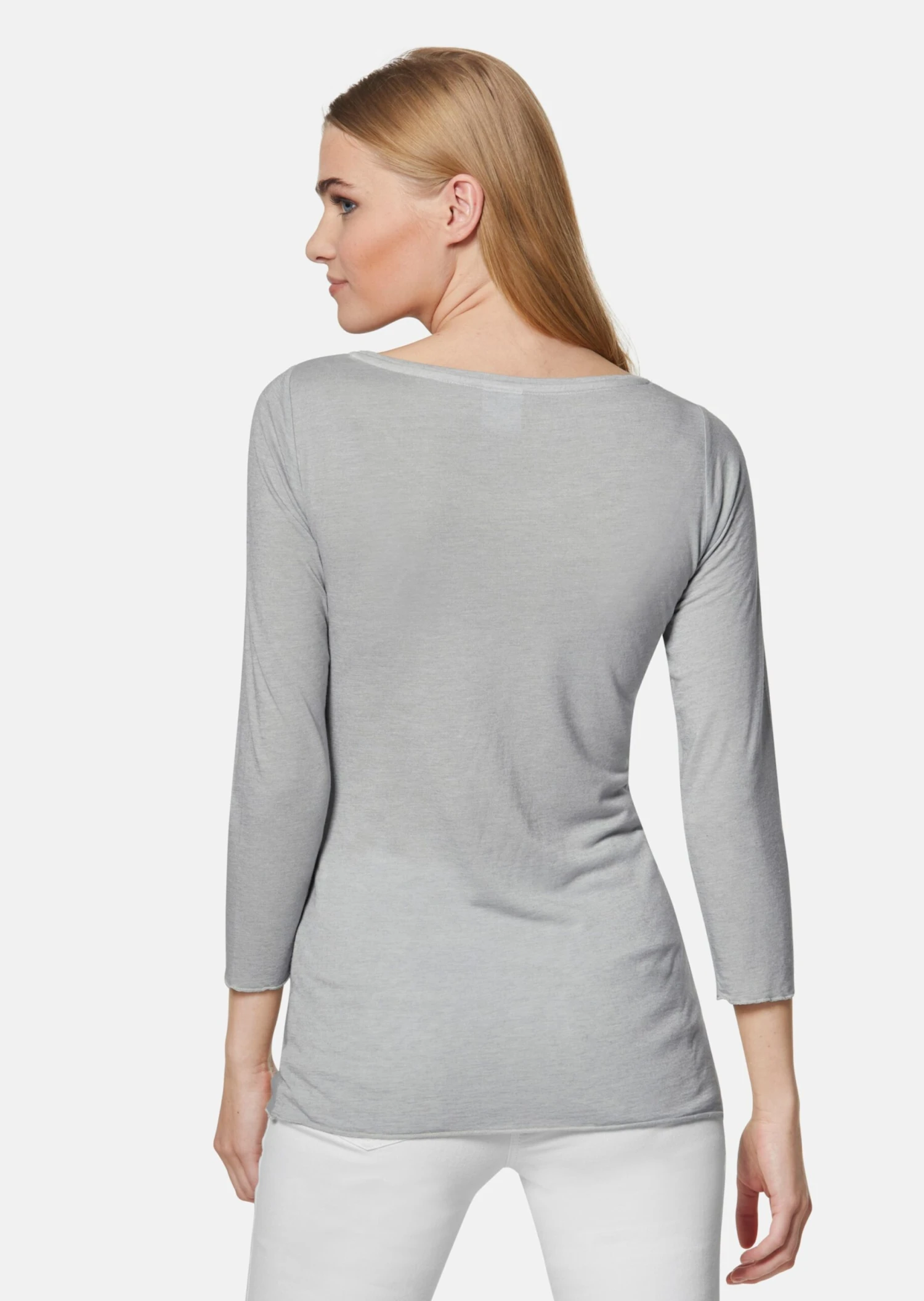 Viskose und Wolle sorgen für den hautschmeichelnden Trage-Genuss, raffinierte Details für einen unvergesslich modischen Auftritt. Der weiche Garnmix ist edel im Griff und macht das Shirt zu einem echten Lieblingsstück. Regular Fit geschnitten ist es leicht tailliert in der Linie, bequem zu tragen und zeichnet sanft die feminine Linie nach. Modisches Highlight: an der seitlichen Teilungsnaht ist das Shirt modisch gerafft und verleiht der Vorderseite einen aufregenden Faltenwurf. Ein formschöner U-Boot-Ausschnitt und Ärmel in 3/4-Länge runden den vielseitig kombinierbaren Style sehenswert ab.