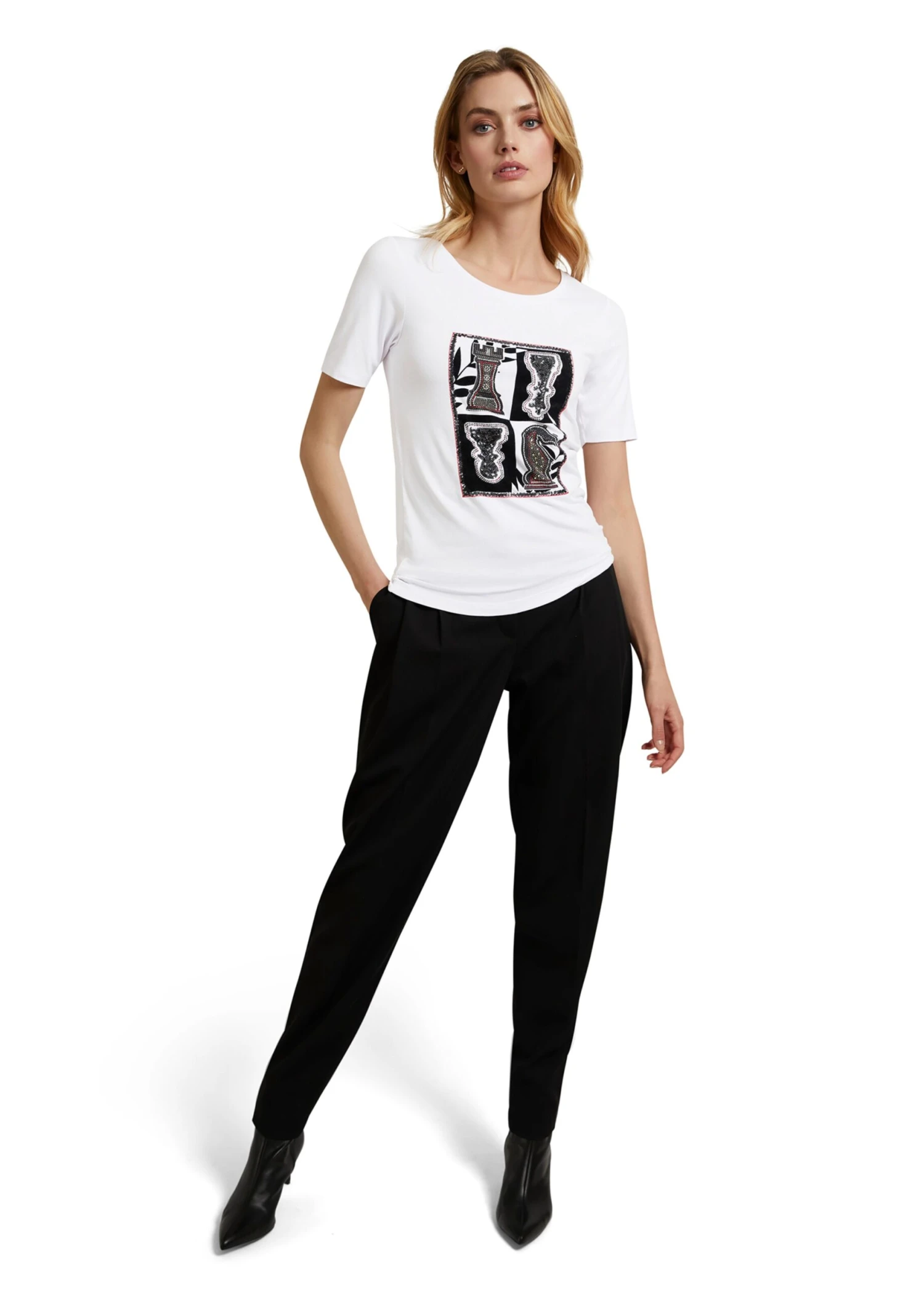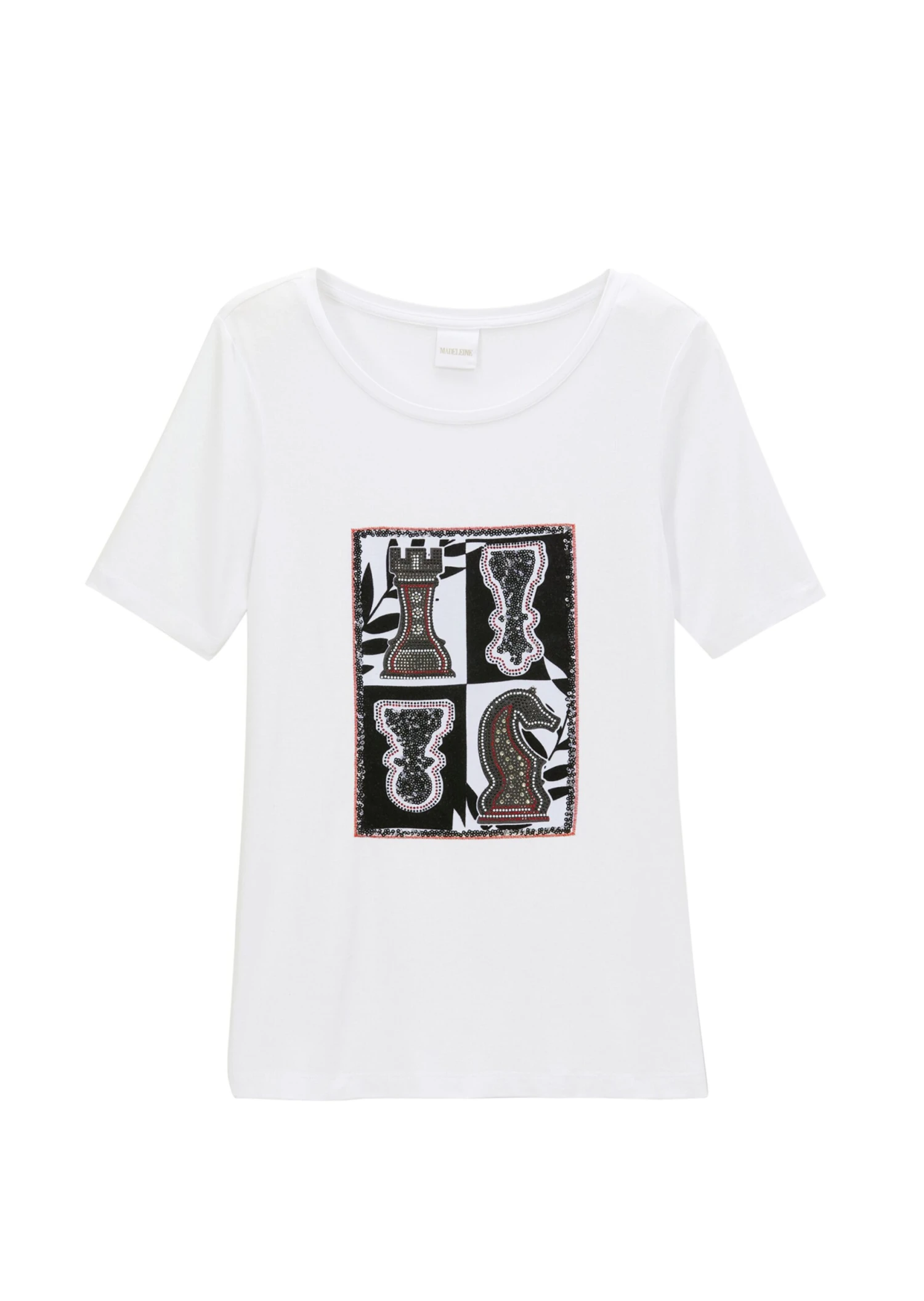 Ein T-Shirt, das durch ein kunstvoll inszeniertes Schach-Motiv zum echten Eyecatcher wird. Hautschmeichelnder Viskose-Stretch ist angenehm im Trage-Gefühl, sehr bequem und weich fließend. Der Klassiker mit Rundhals-Ausschnitt und halblangen Ärmeln sorgt durch das vorderseitige Motiv aus Flockprint, Ziersteinen und Pailletten für modische Akzente.