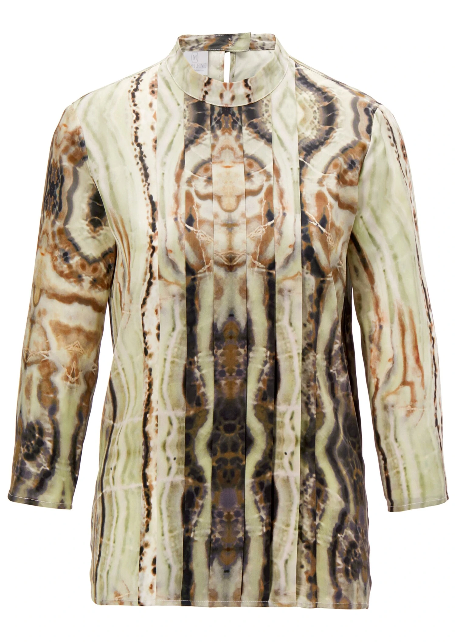 Jetzt kommt Raffinesse in den Look! Die Stehkragenbluse mit Seide fasziniert mit ihrem fantastischen, platzierten Druck in Trendfarben. Moderne Biesen unterhalb des Stehkragens setzen das Vorderteil in Szene. Durch den luxuriösen Mix aus Viskose und Seide trägt sich die geschmeidige Bluse herrlich angenehm. Die edle Qualität ist kofferfreundlich, so können Sie die Bluse auch prima mit auf Reisen nehmen. Wir haben sie für einen modernen Stil in gerader Form gestaltet und mit 3/4-Arm, geradem Saum, Seitenschlitzen und rückseitigem Knopfverschluss versehen.