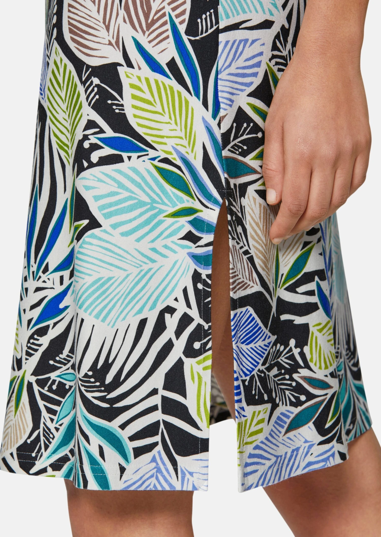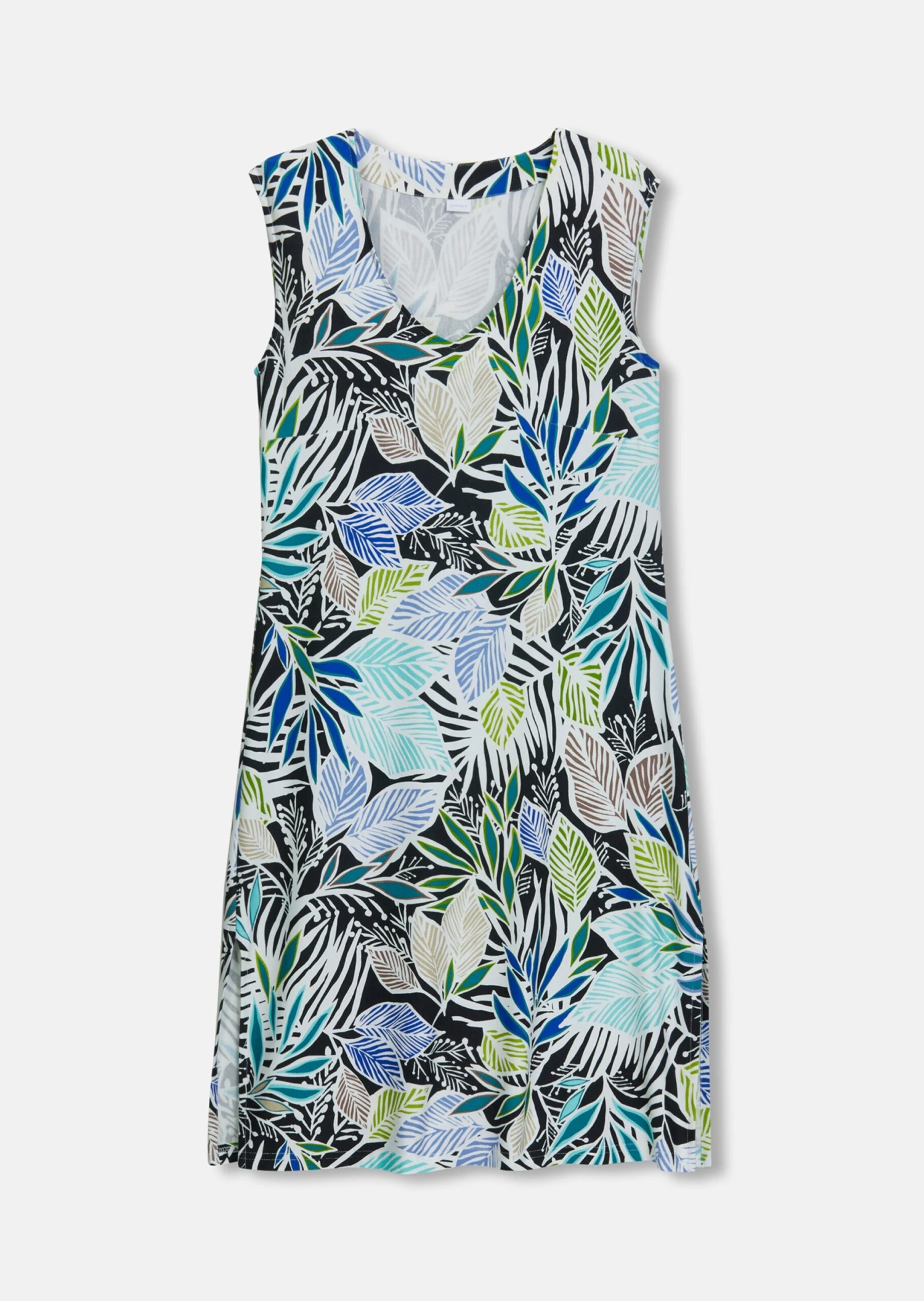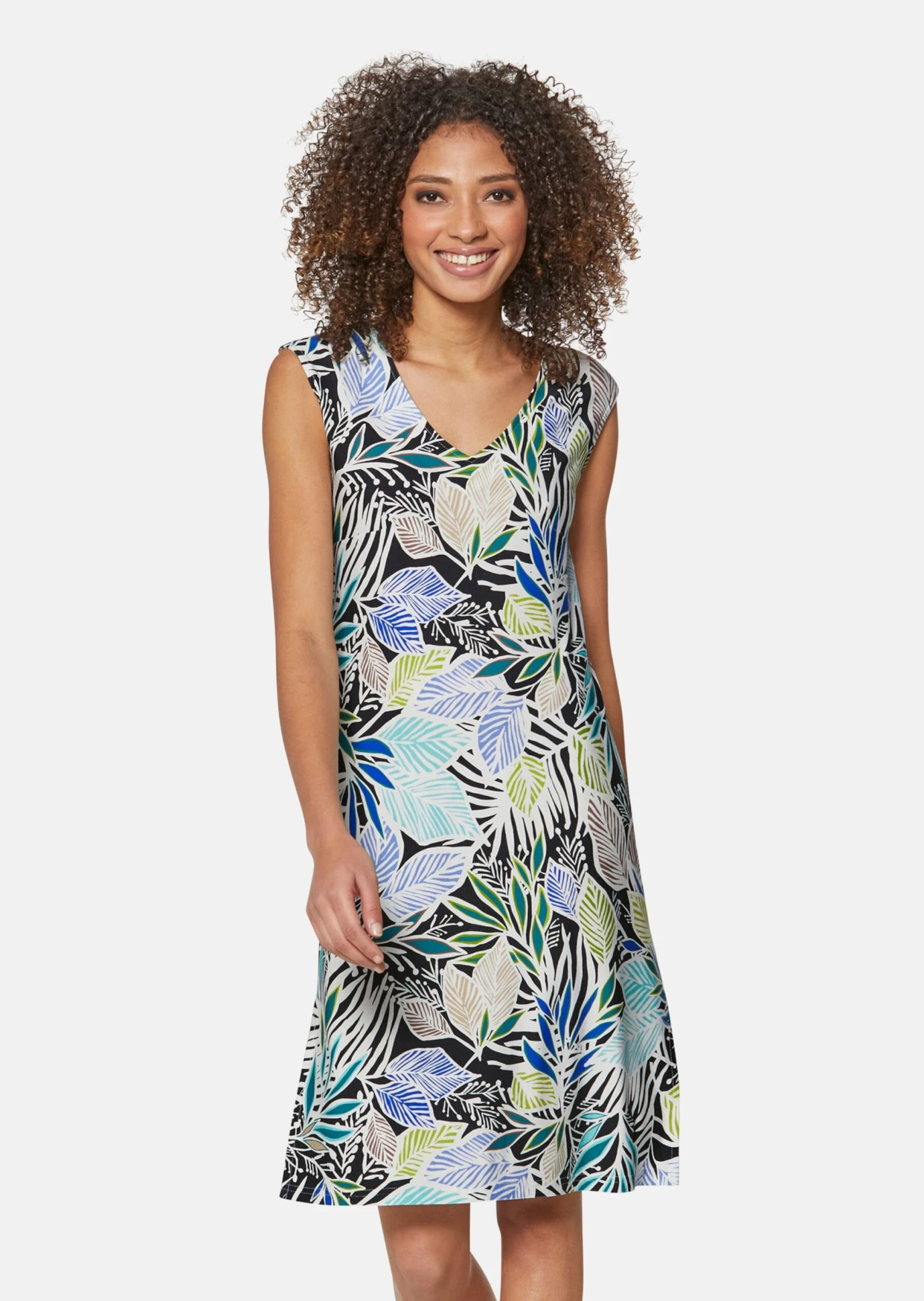 Wenn uns der Sommer mit allerschönstem Badewetter lockt, gibt es nur eines. Dieses luftig leichte Kleid mit stylischem Tropical Print überstreifen und das Leben am Beach oder Badesee in vollen Zügen genießen. Das ärmellose Blumenkleid ist aus softem, weichfließendem Viskose-Stretch figurbetont designt. Es hat einen Dekolleté betonenden V-Ausschnitt und Seitenschlitze.