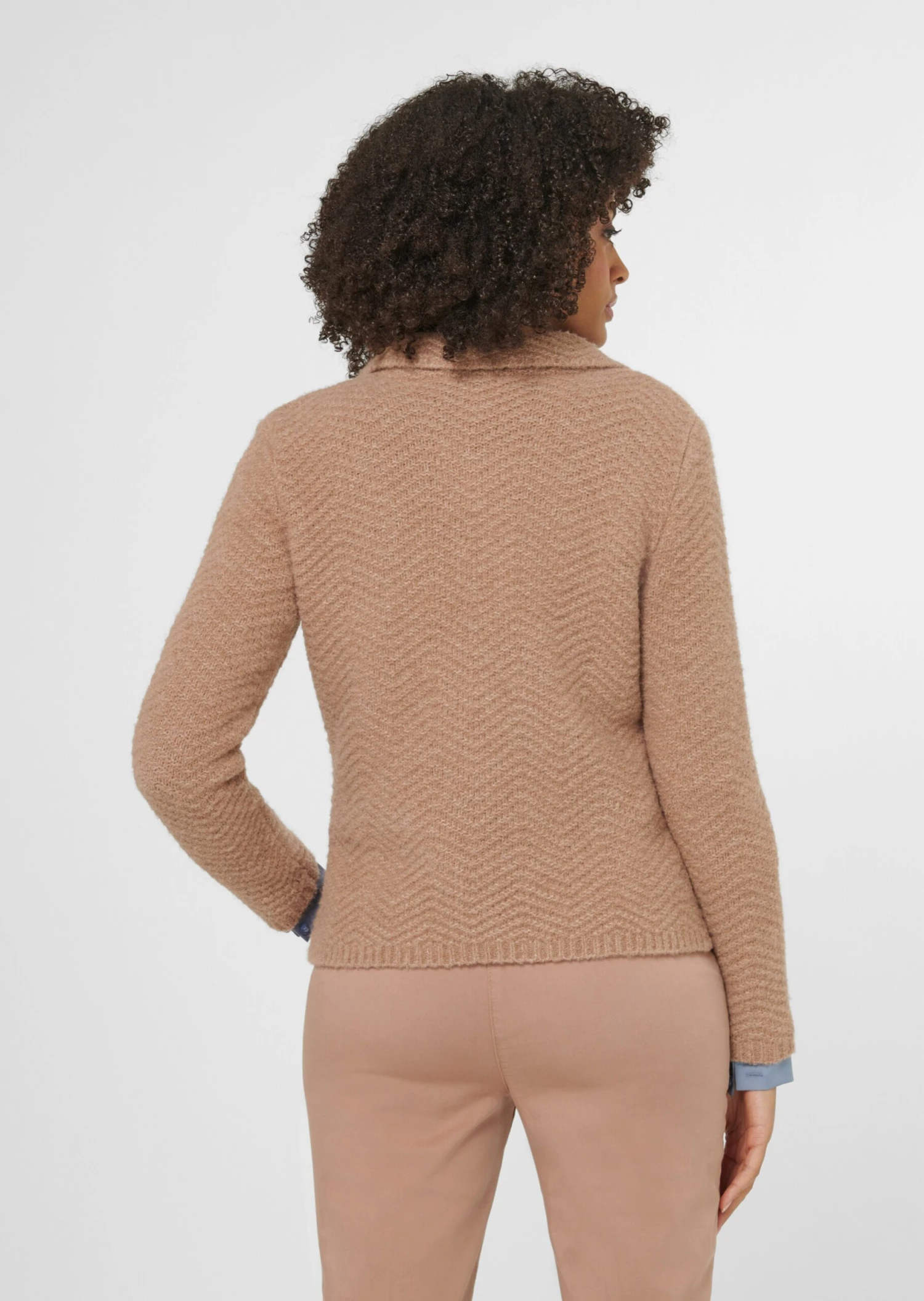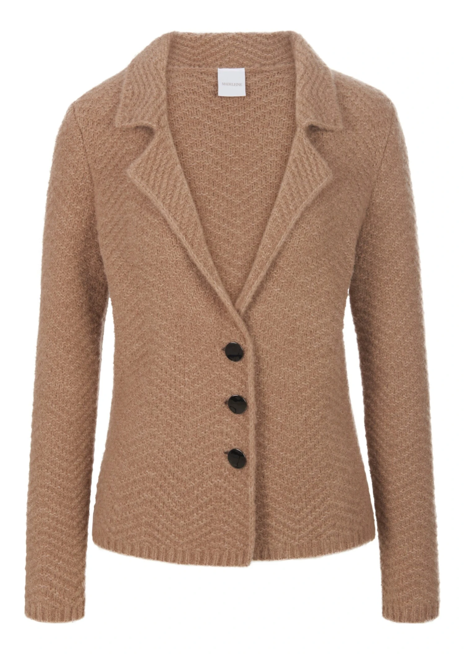 Strickmode steht vor allem in der kalten Jahreszeit im Fokus und glänzt hier mit couturigem Charme. Durch das Fischgrat-Muster erhält der leicht taillierte Kurzblazer eine Extraportion Stil. Die elastische Wollmischung punktet mit wunderbarem Trage-Komfort und kann vielseitig kombiniert werden. Reverskragen, Knopfleiste sowie Rippenkanten an Ärmeln und Saum runden den Style ab.