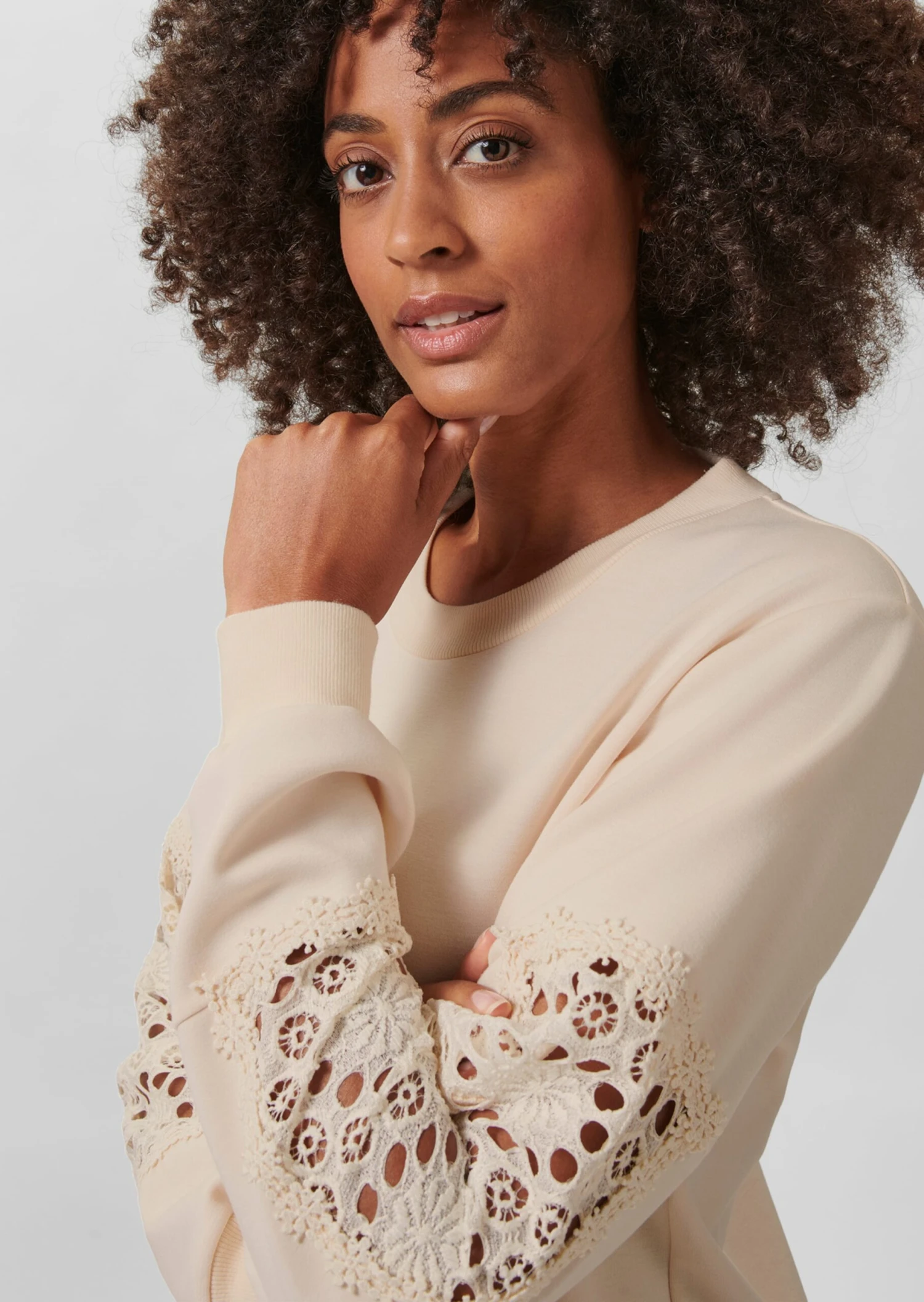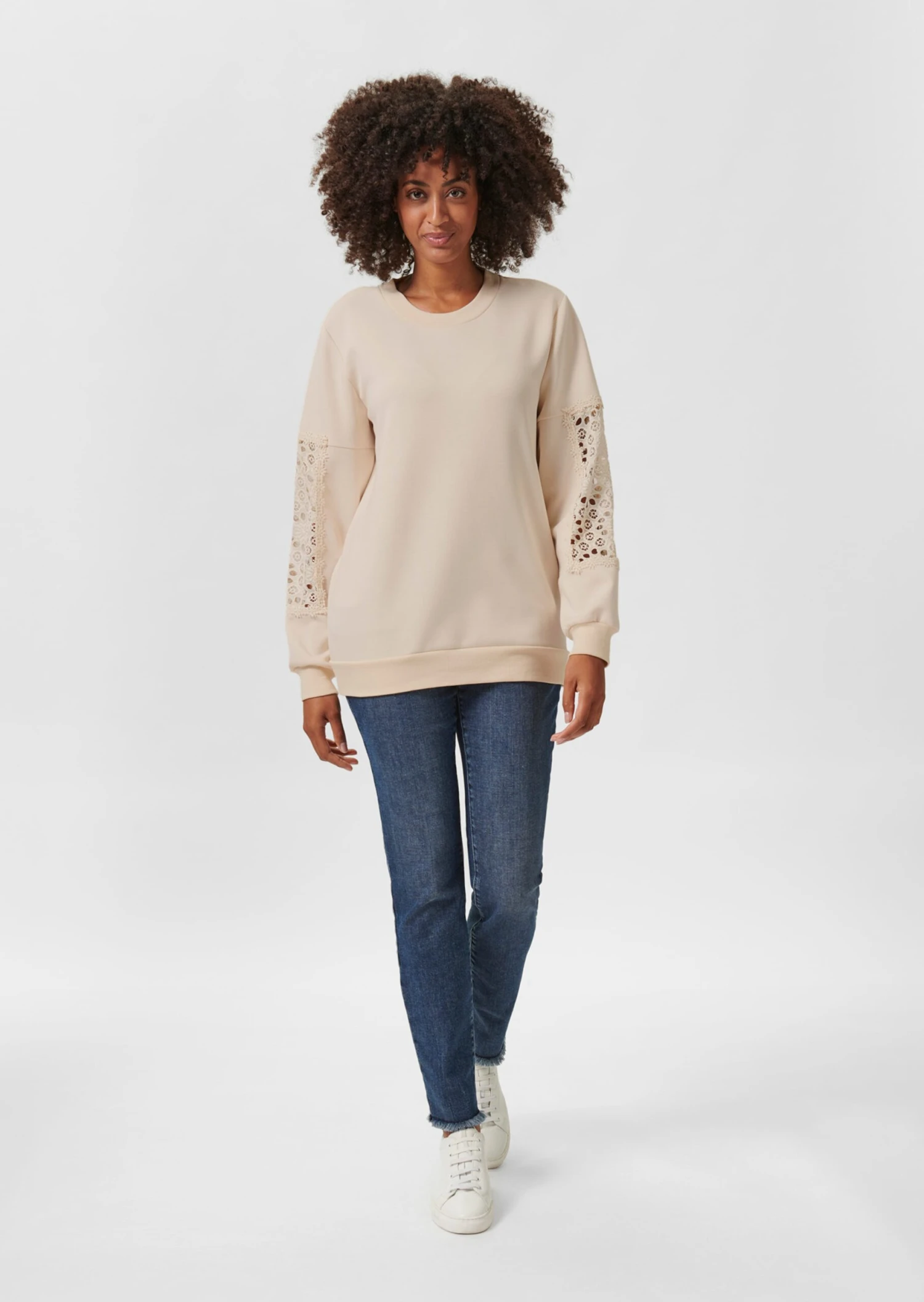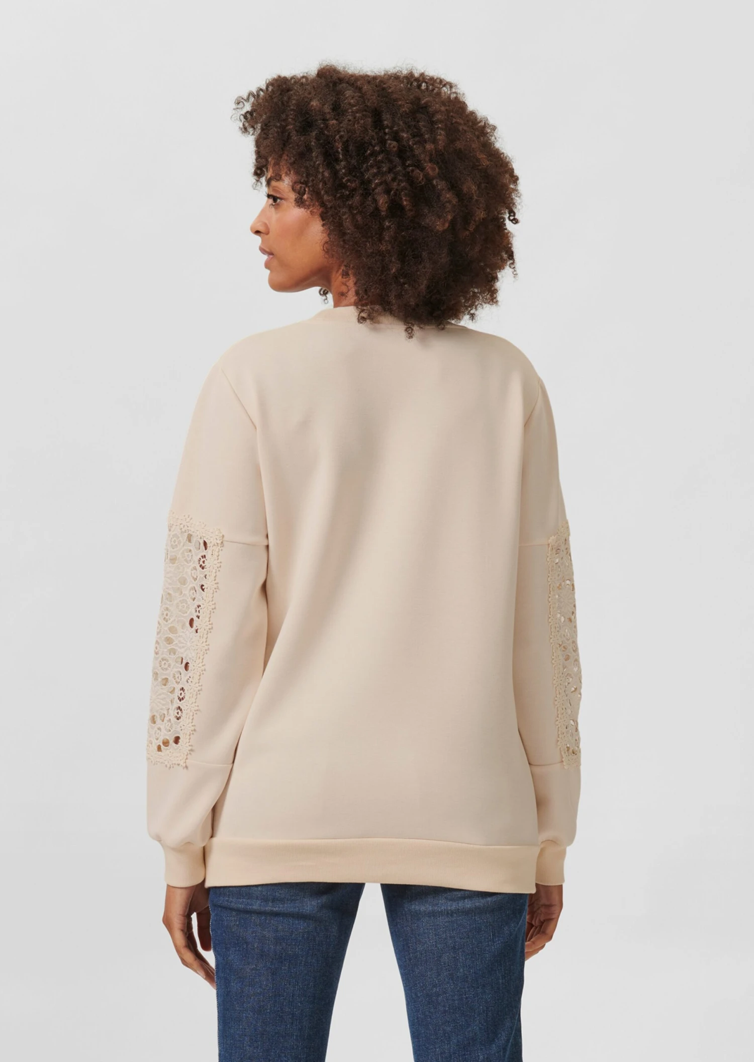 Immer einsatzbereit für urbane Casual-Looks: das geliebte Sweatshirt. In dieser Saison verführt es mit zarten Einsichten durch edle Lochspitze am langen Ärmel. Ein toller Effekt! Rundhals-Ausschnitt und Bündchen an den Abschlüssen machen den lässigen Style komplett. Aus softem Viskosemix – tragebequem, formstabil und knitterarm.