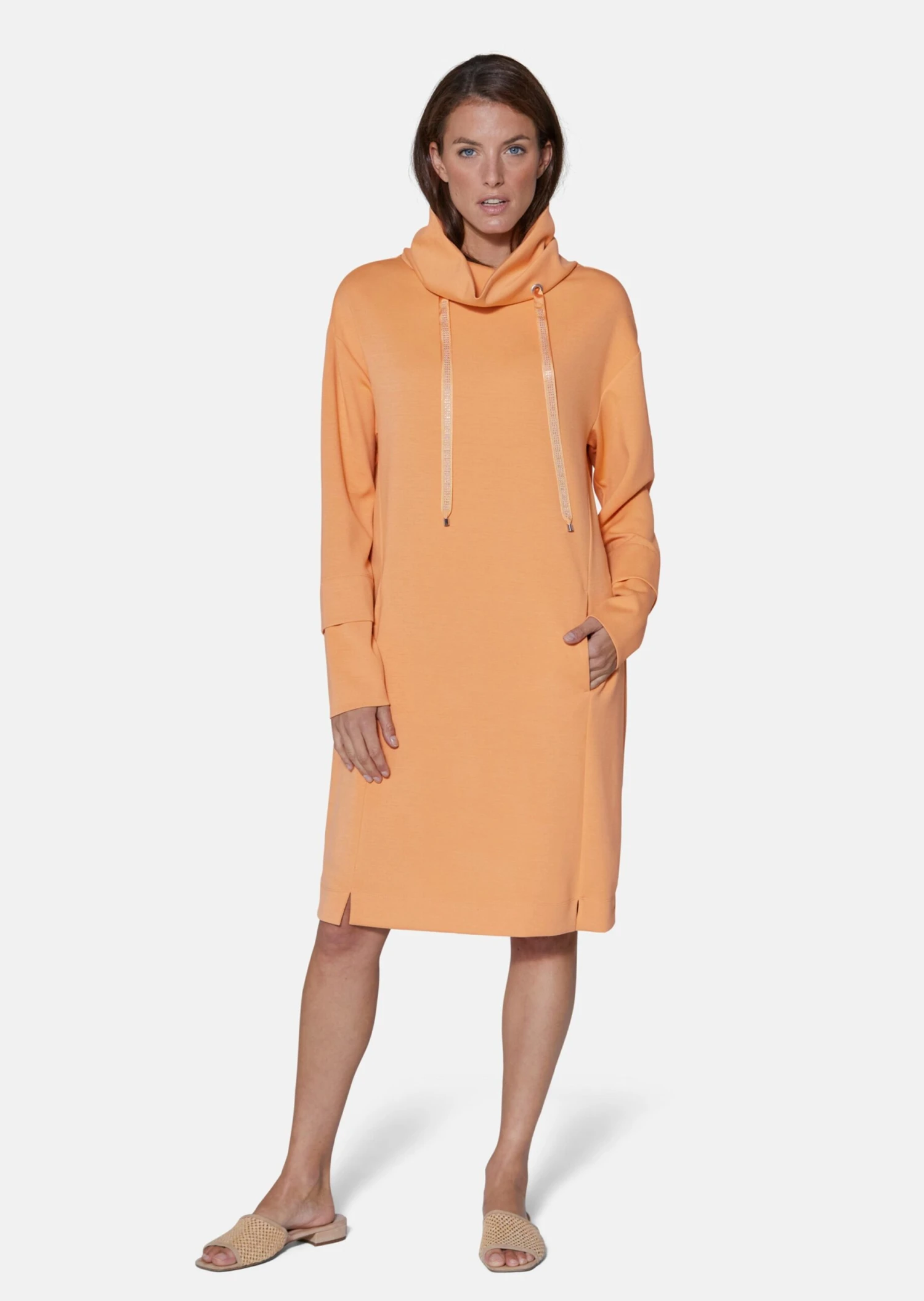 Ein Kleid, das moderne Lässigkeit verkörpert! Das Sweatshirtkleid in O-Form zeichnet eine angesagte Silhouette. Der Jersey mit einem kleinen Teil recycelter Polyesterfasern ist komfortabel und nachhaltig. Gestaltet ist das Trendkleid mit Taschen, vorderseitigen Saumschlitzen, Doppelmanschetten und großem Stehkragen mit glitzernden Bändern. Vorverlegte Seitennähte unterstreichen den Trendstyle. Egal, was Sie in Ihrer Freizeit planen, das neue Kleid trägt sich herrlich angenehm.