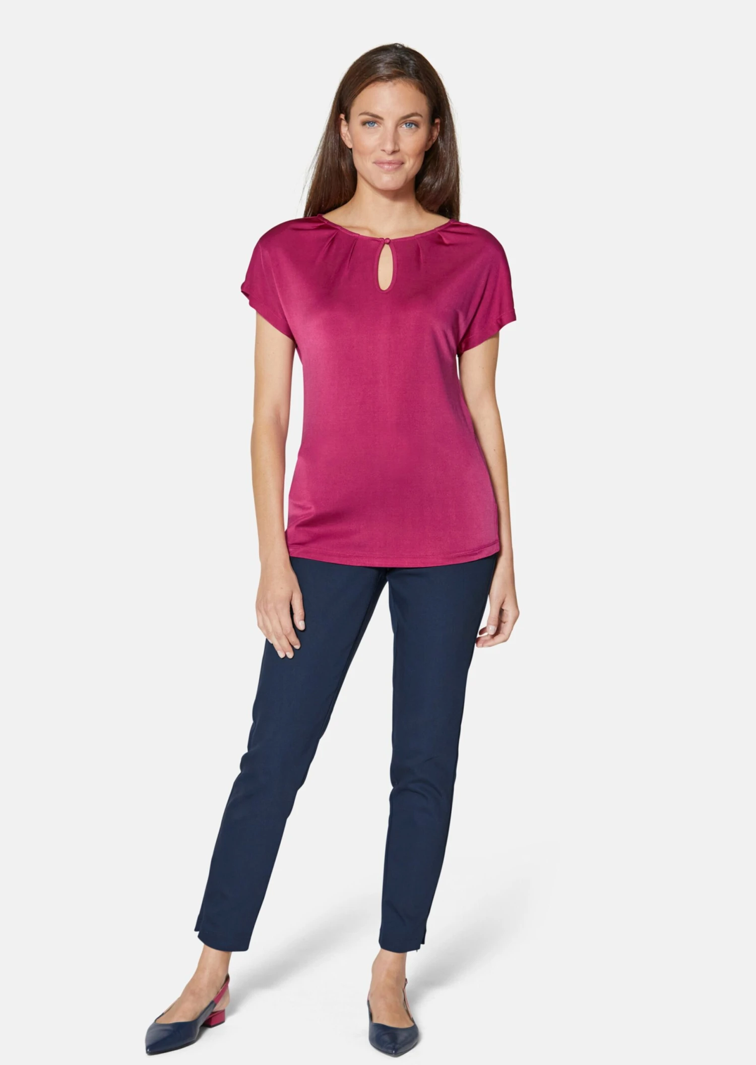 Dieses feminine Basic-Shirt von TALBOT RUNHOF X MADELEINE fasziniert mit wohltuendem Tragekomfort und liebevollen Details. Die hautschmeichelnde Jersey-Qualität aus Viskose und Seide verzaubert mit zartem Glanz und ist angenehm elastisch. Kühl auf der Haut macht dieses Shirt zu jedem Anlass eine gute Figur und kann vielseitig und unabhängig von der Saison kombiniert werden. Der Rundhals-Ausschnitt ist dezent in Falten gelegt und mit Schlitz und Knopf gearbeitet. Sanft tailliert umspielt es leicht die Figur und ist mit überschnittenen Schulterpartien, kurzen Ärmeln und leichten Schulterpolstern gearbeitet. Integrierte Bra-Tapes verhindern das lästige Verrutschen der BH-Träger.