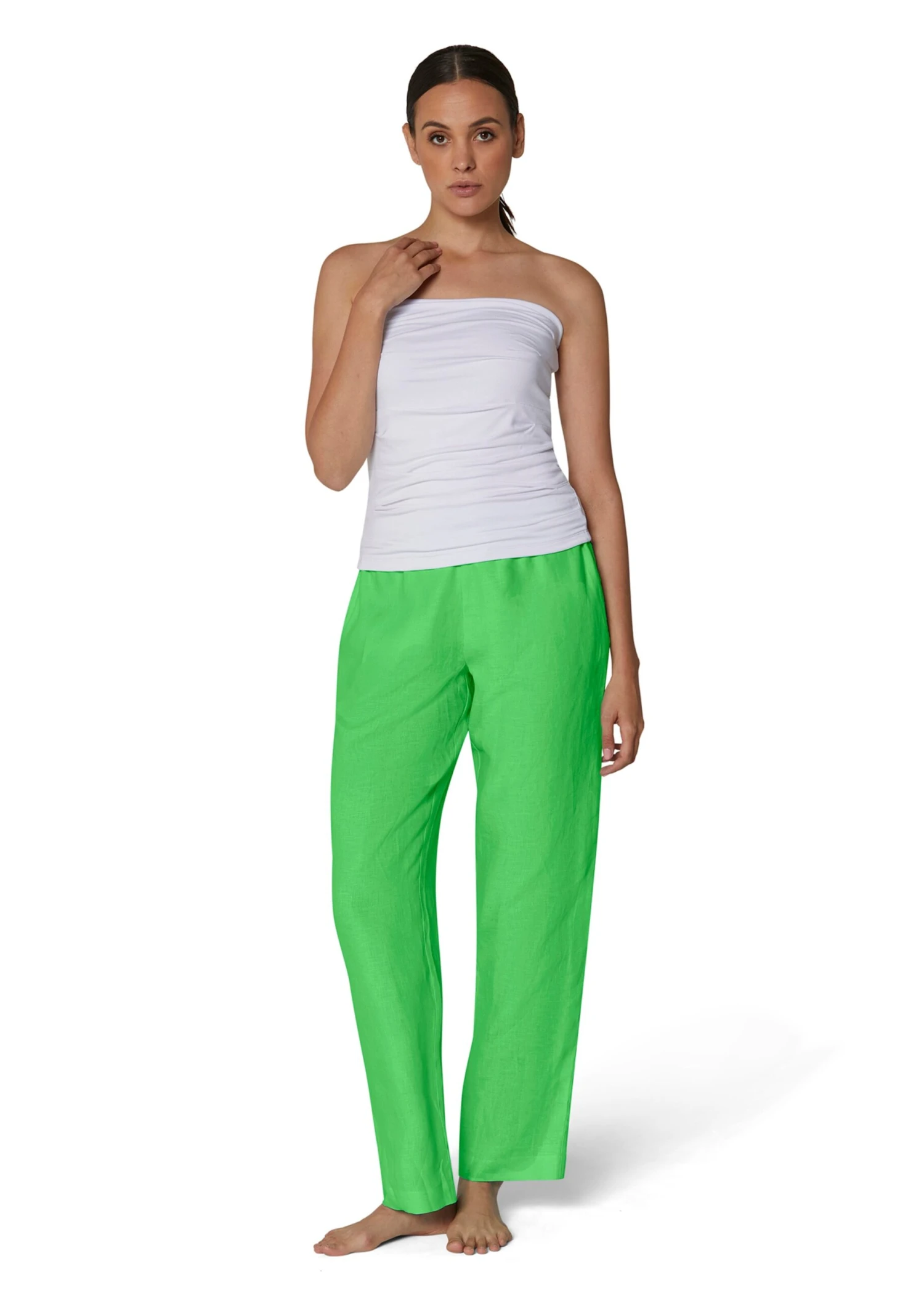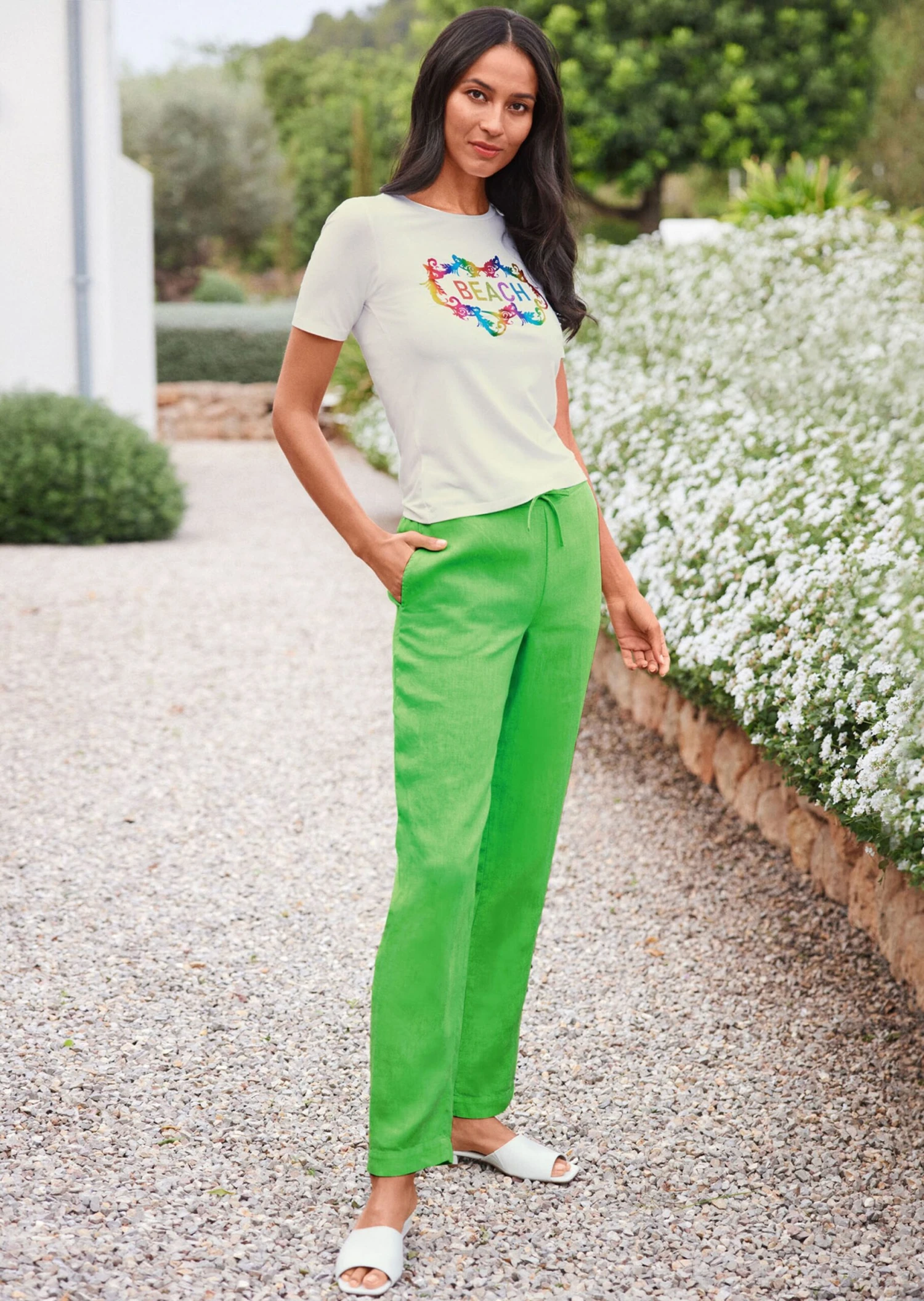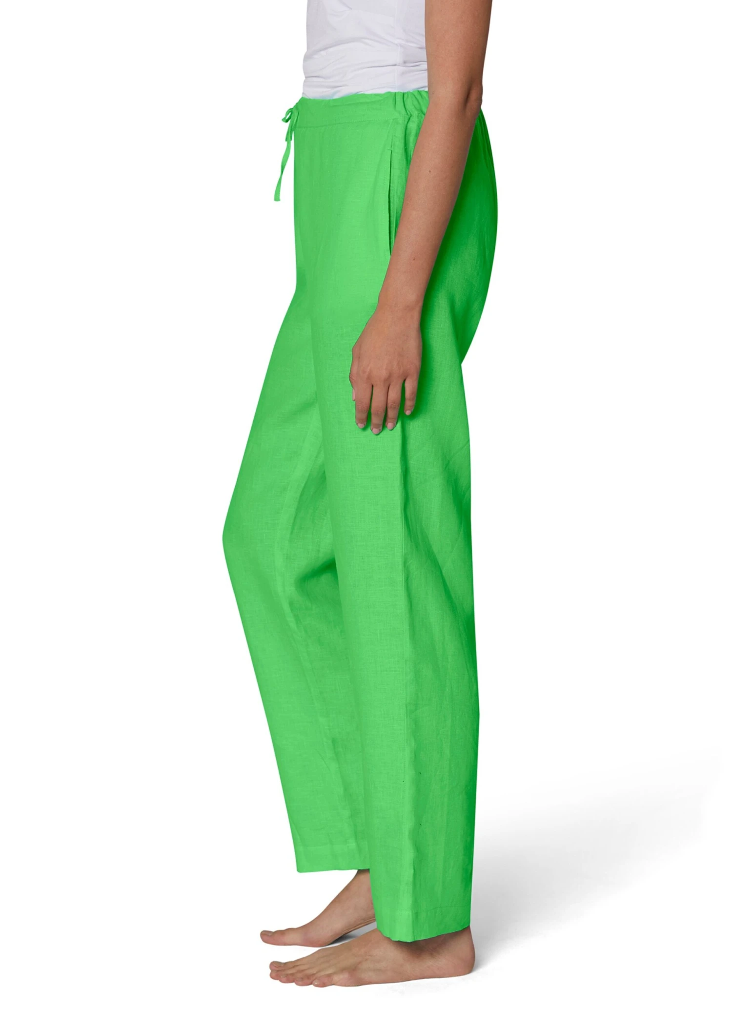 Immer ein beliebtes Sommerthema: Reines Leinen. Die charaktervolle Struktur und der leichte Knittereffekt sind typisch für die hochwertige Naturqualität. Trotzdem fließt sie schön geschmeidig und ist außerordentlich luftig und sympathisch auf der Haut. Einfach perfekt für diese lässige Wohlfühl-Hose mit weitem Bein und seitlichen Eingrifftaschen. Der Bund ist mit variablem Tunnelzug vorne und Elastikeinsatz hinten gestaltet und garantiert so einen bequemen Sitz. Eine vielseitige Basic-Hose, die Sie sowohl in der City, als auch im Urlaub oder Zuhause stilsicher begleiten wird.