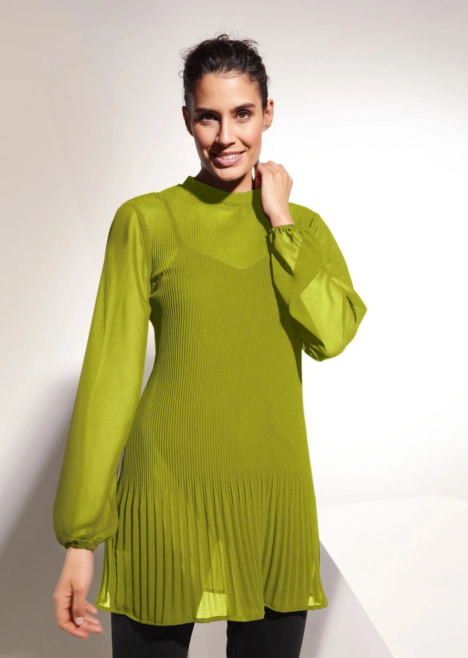Jetzt wird’s festlich und verführerisch! Plisseefalten und Transparenz bringen Glanz in den Alltag und unterstreichen jeden Look mit prachtvoller Note. Die hauchzarte Qualität der Bluse umspielt sanft den Körper und lässt dabei reizvoll Haut durchschimmern. Das integrierte Jersey-Top mit schmalen, verstellbaren Trägern lässt neugierige Blicke außen vor und garantiert blickdichtes Trage-Vergnügen. Besonderes Plus: Die antistatische Ausrüstung der Ware sorgt für einen angenehm schönen, fließenden Look und fühlt sich einfach gut an. Französische Nähte runden die Qualität mit viel Liebe zum Detail ab. Ein kleiner Stehkragen mit rückseitig geknöpftem Schlitz macht das Ein- und Aussteigen zum Kinderspiel und betont die cleane Eleganz des It-Pieces. Die Body-Partie ist in feine Plisseefalten gelegt. Sie bringen Schwung in den Look und begeistern bei jeder Bewegung mit zauberhaften Effekten. Lange Ärmel mit elastischen Abschlüssen komplettieren den Style, während integrierte Bra-Tapes das Verrutschen der BH-Träger verhindern.